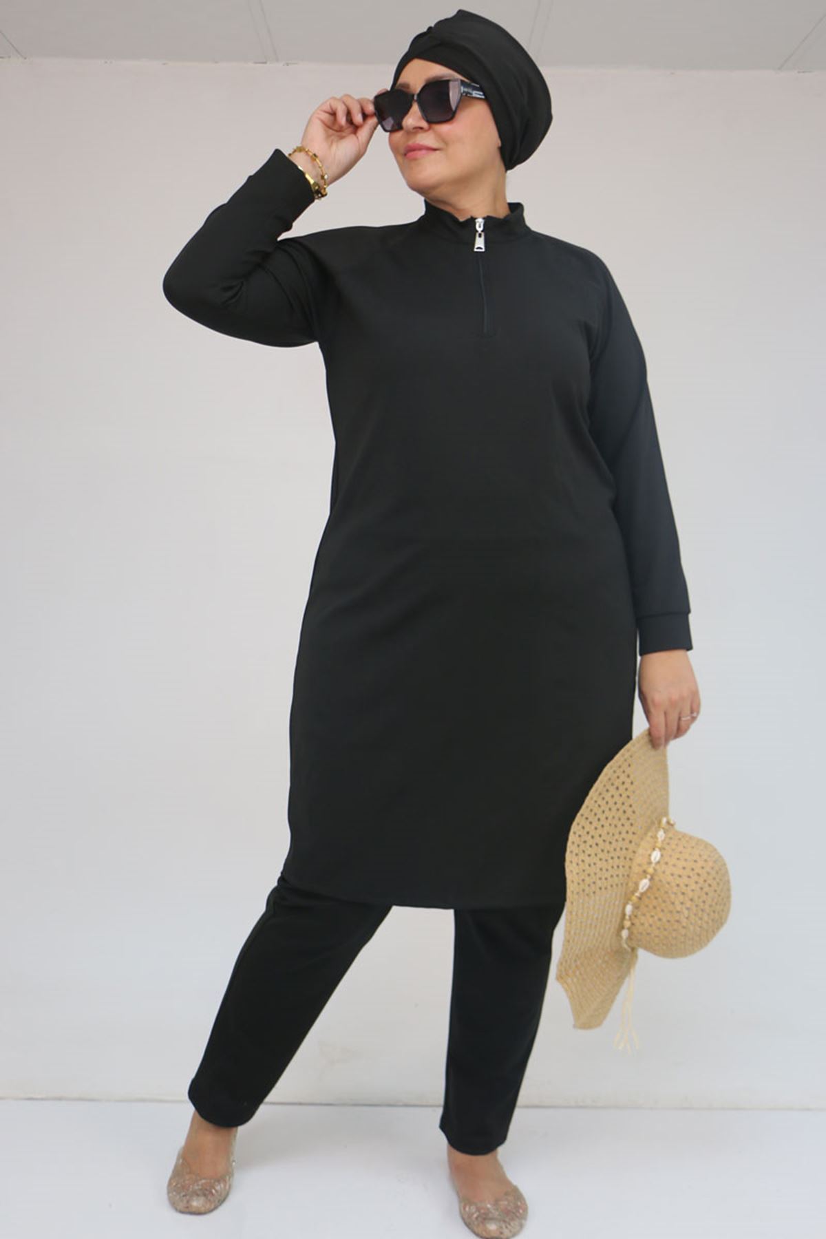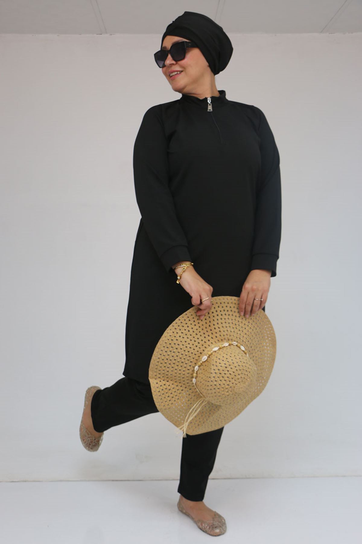 1732-E Büyük Beden Balıkçı Yaka Fermuarlı Mayo - Siyah