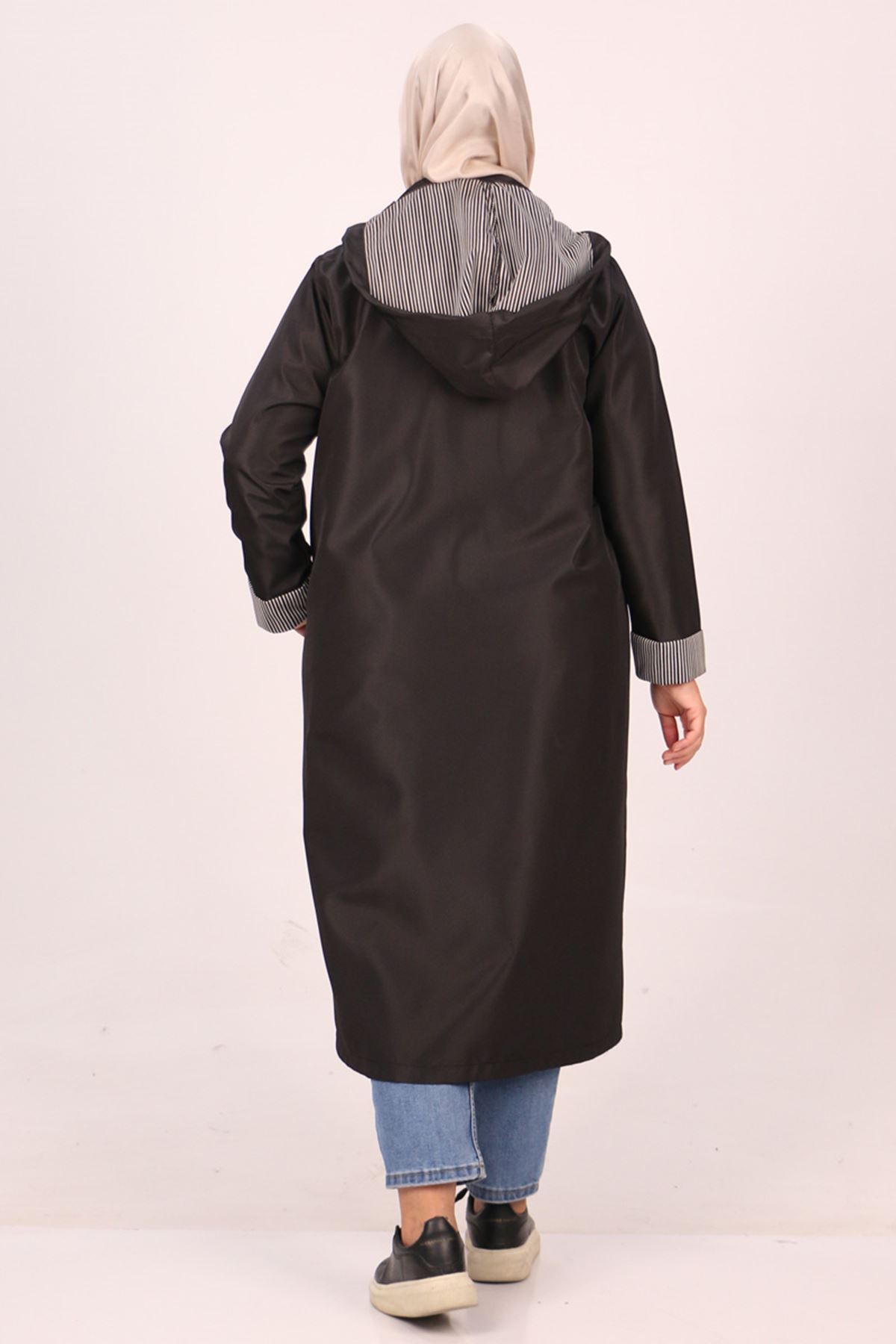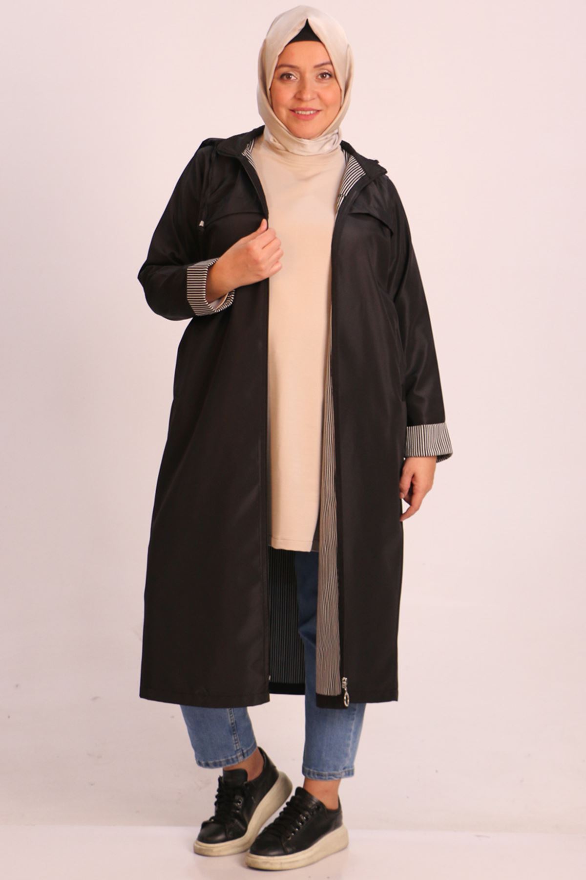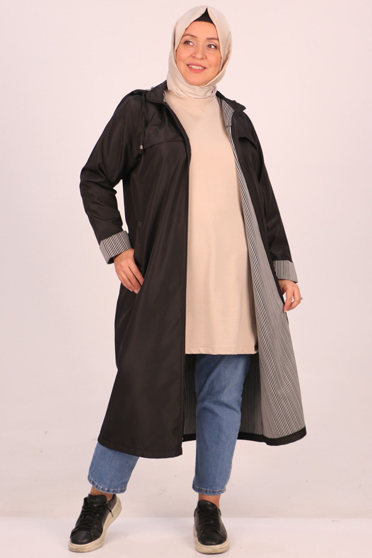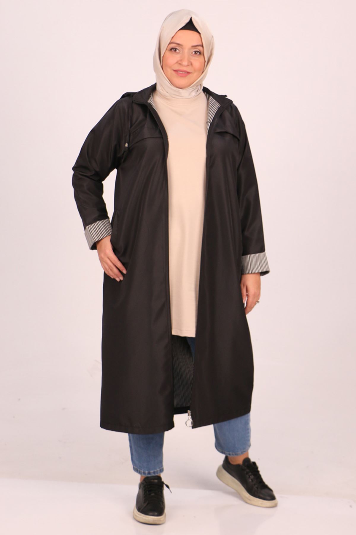 33068-E Büyük Beden Kapüşonlu Bondit Kap-Siyah