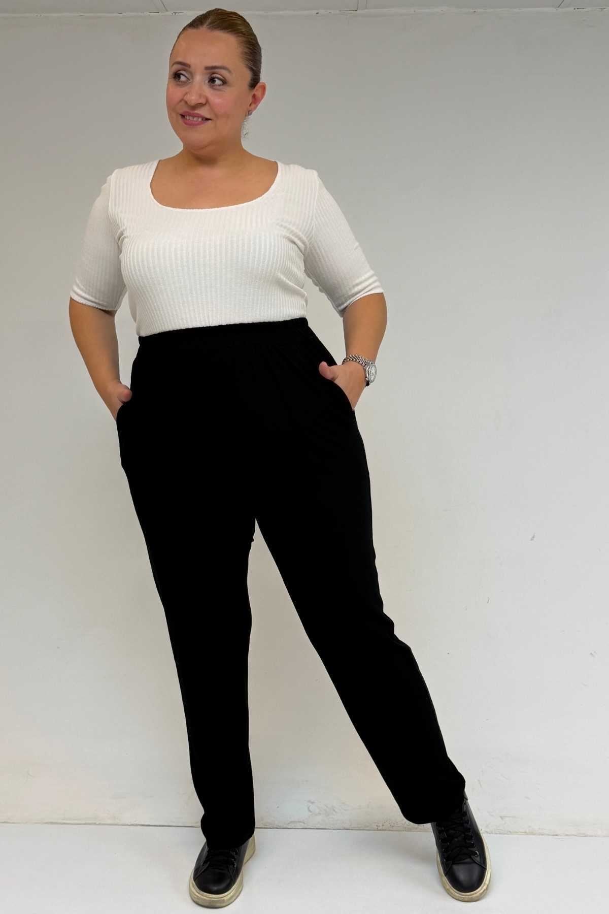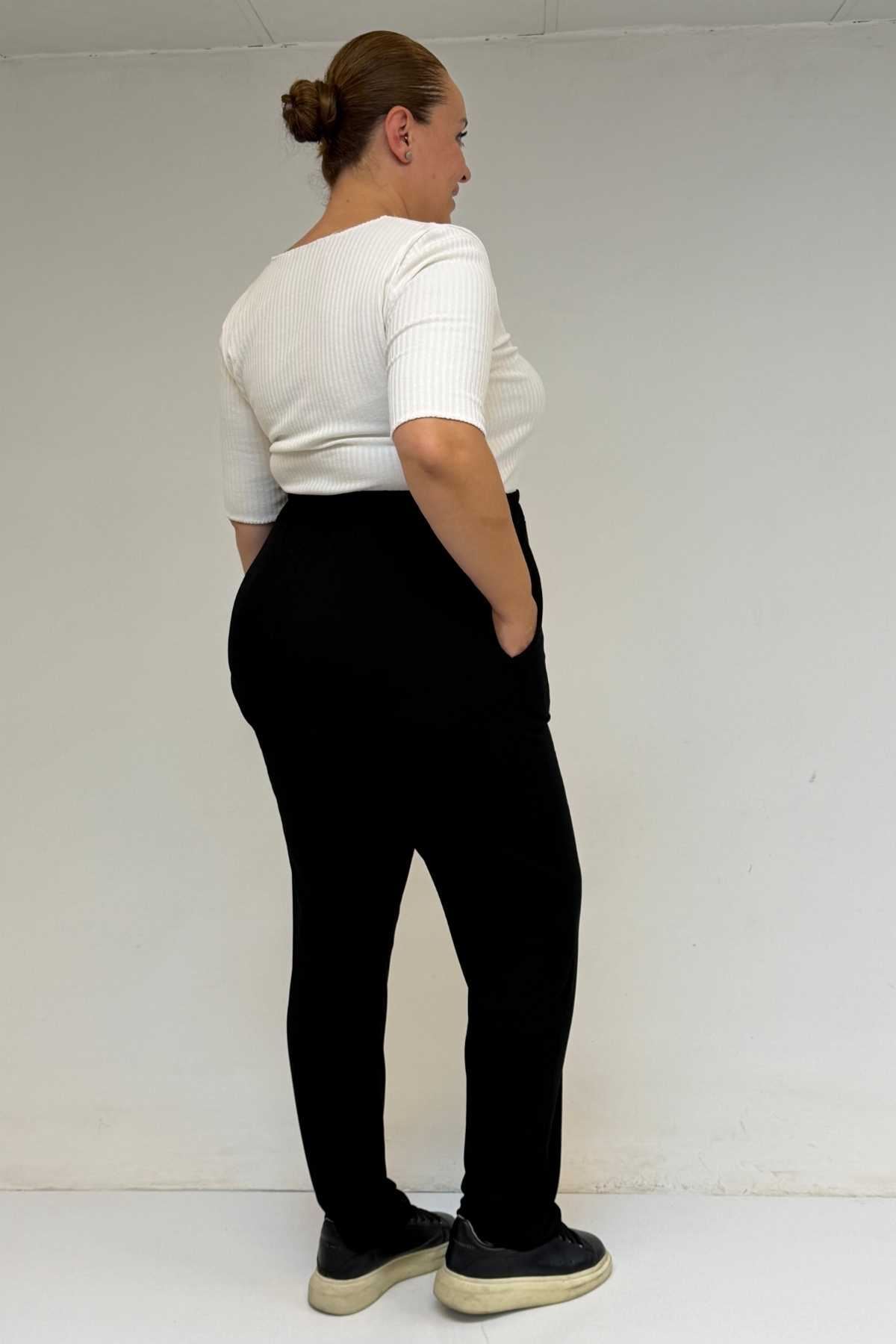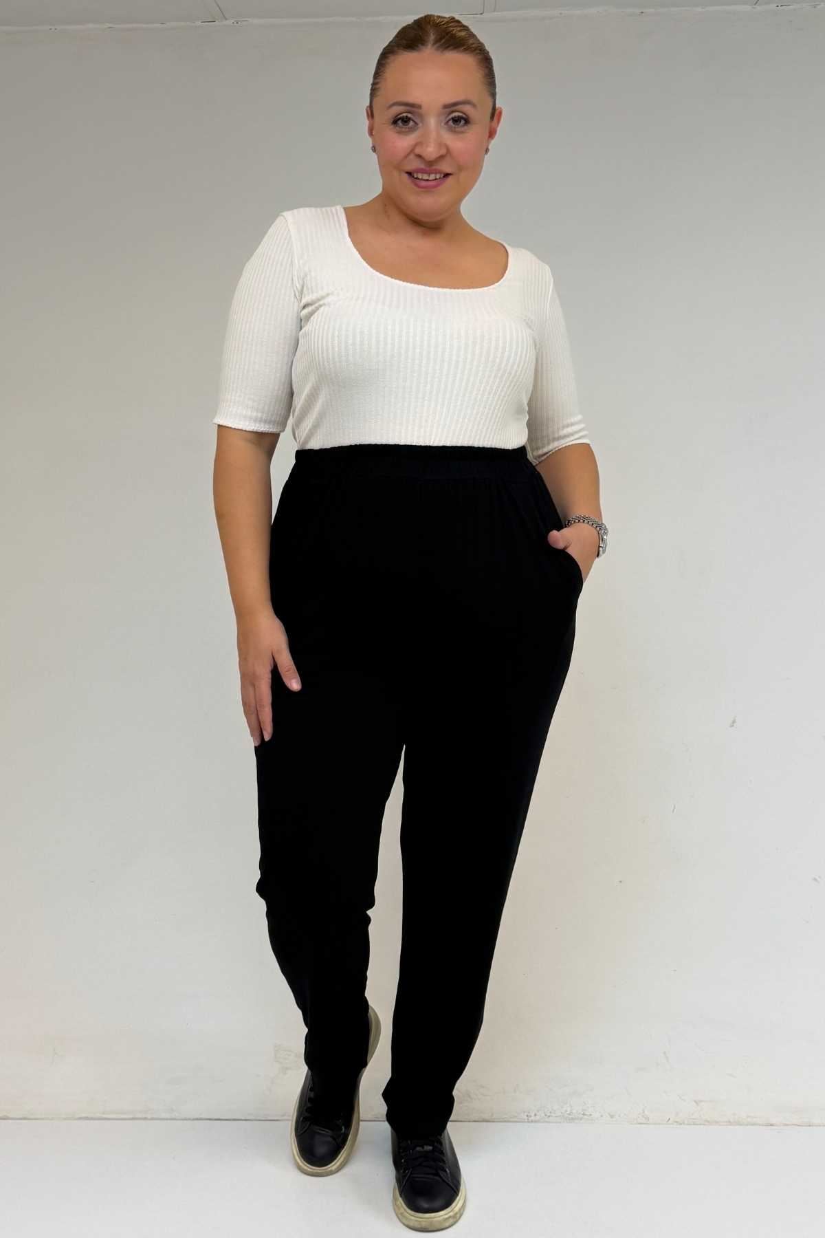 39001 Büyük Beden Yüksek Beli Lastikli Penye Pantolon - Siyah