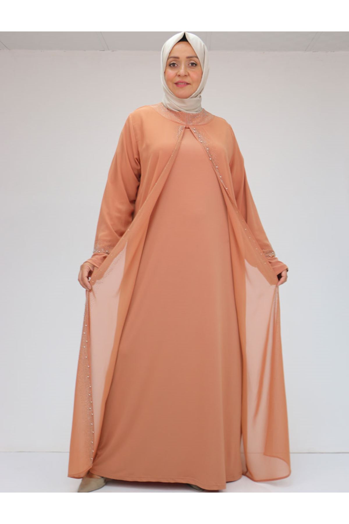 42018 Büyük Beden Taş Baskılı Sandy-Şifon Elbise - somon