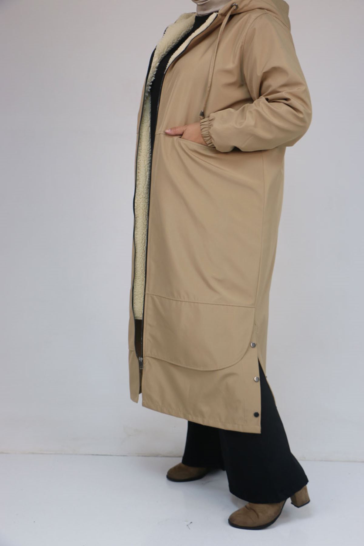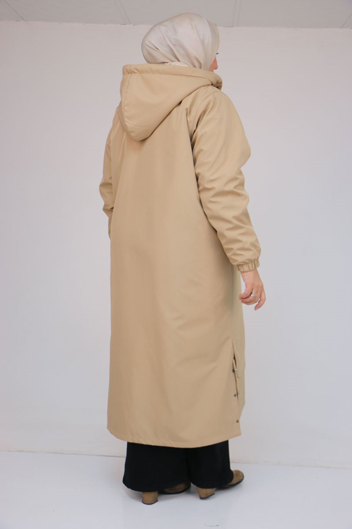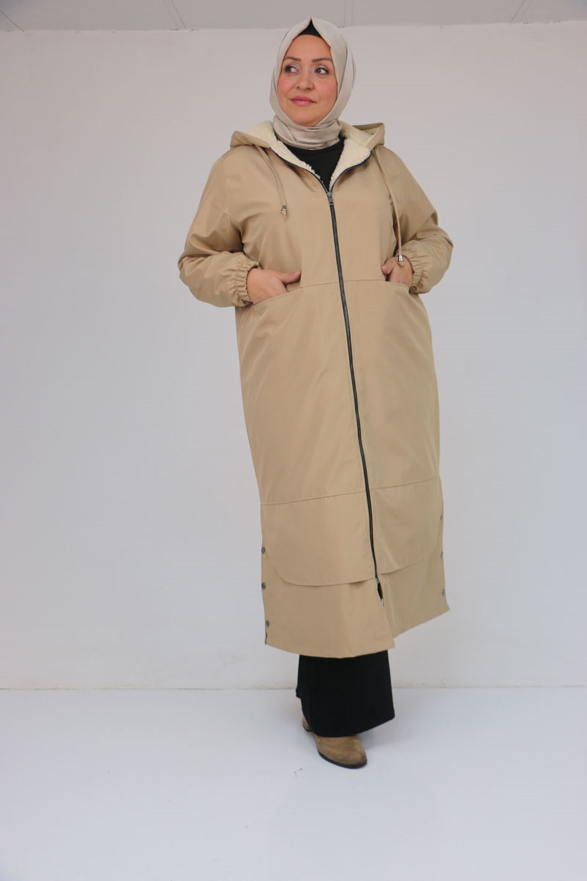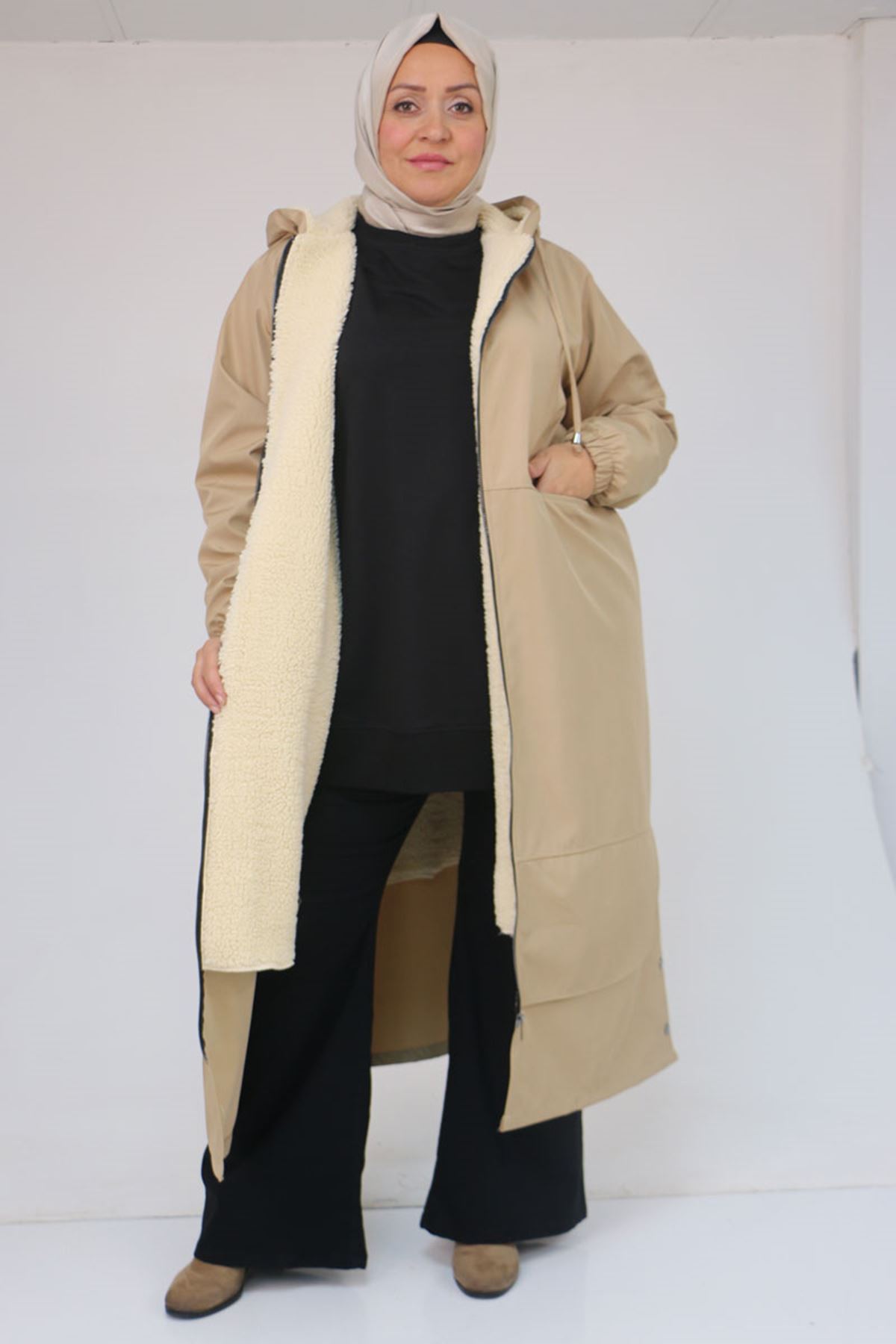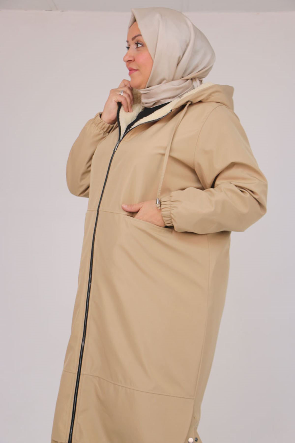 43062 Büyük Beden Kolları Lastikli Kapşonlu Bondit Kap - Bej