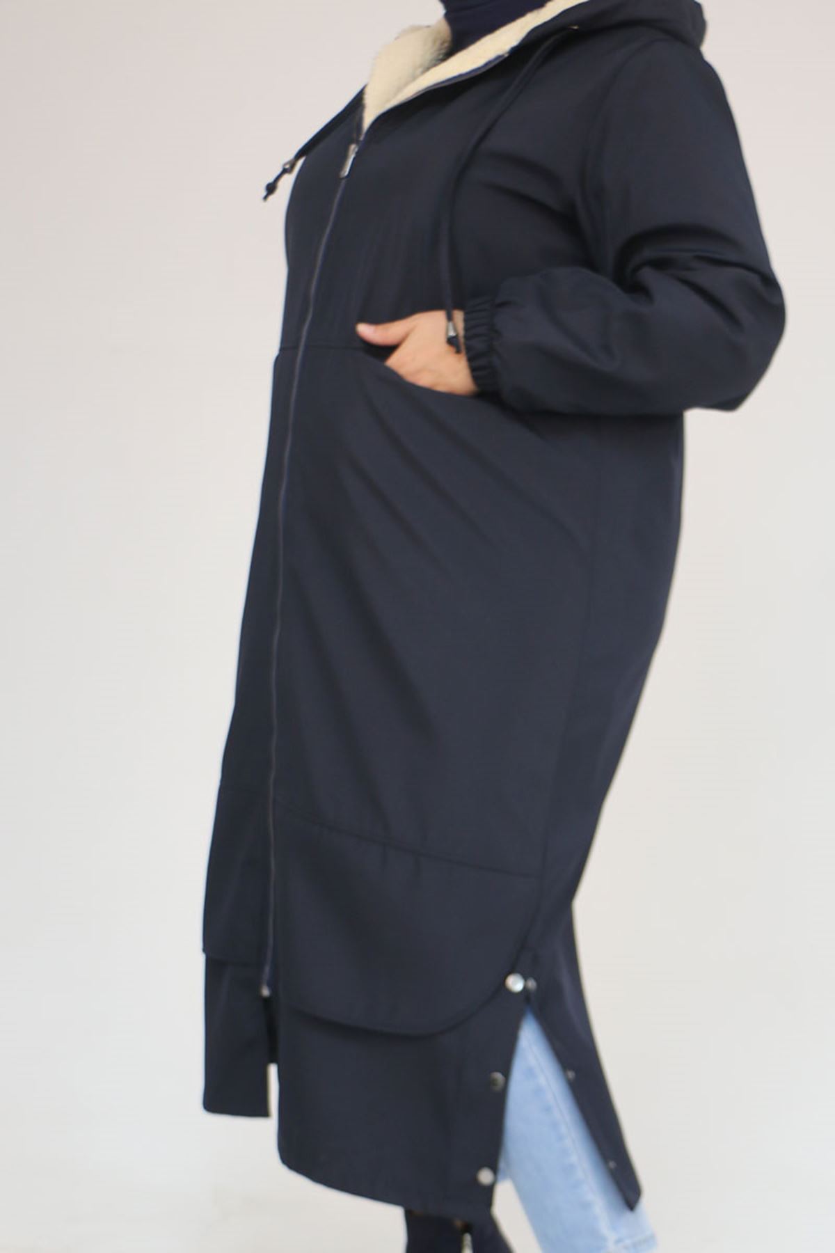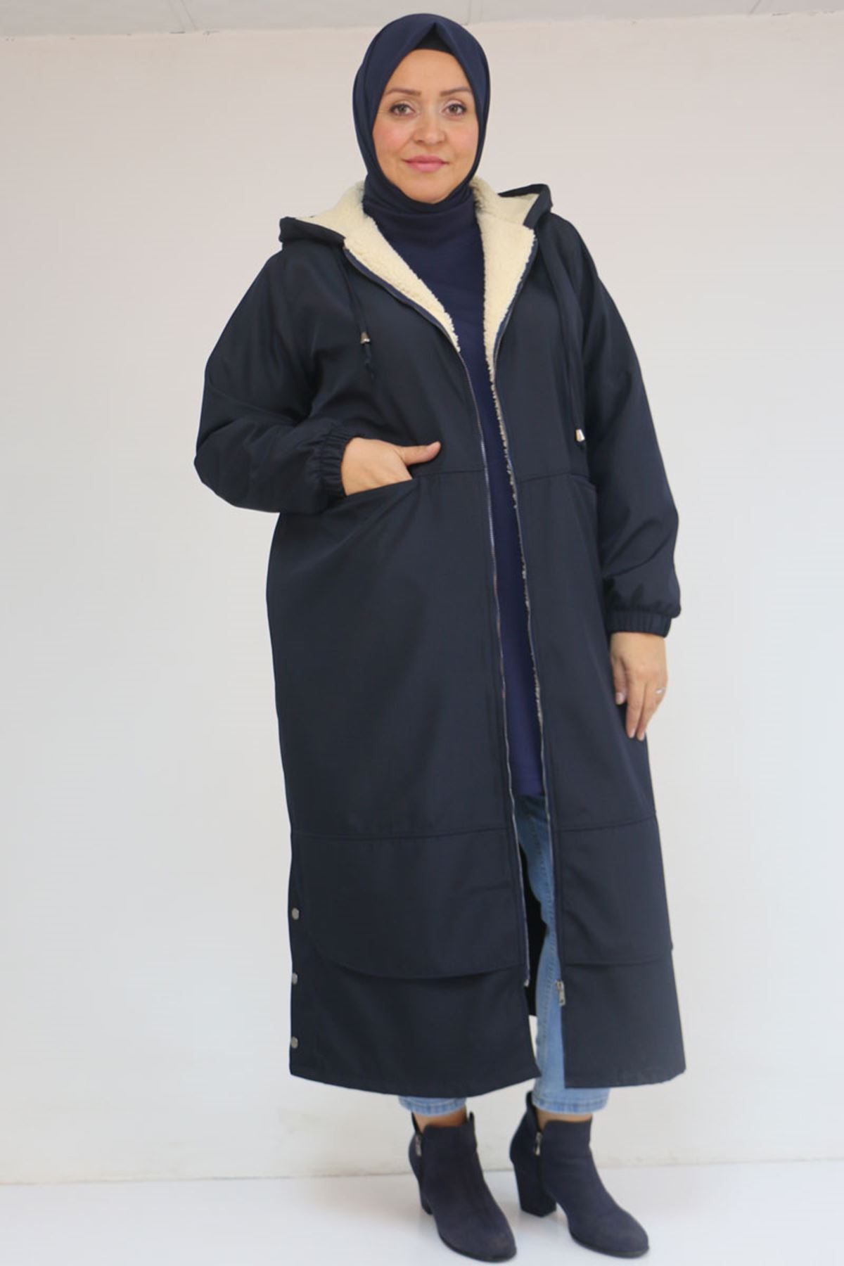 43062 Büyük Beden Kolları Lastikli Kapşonlu Bondit Kap - Lacivert