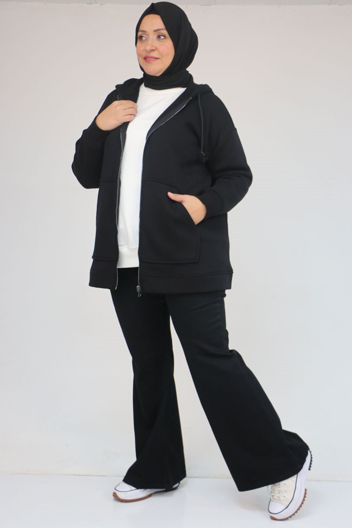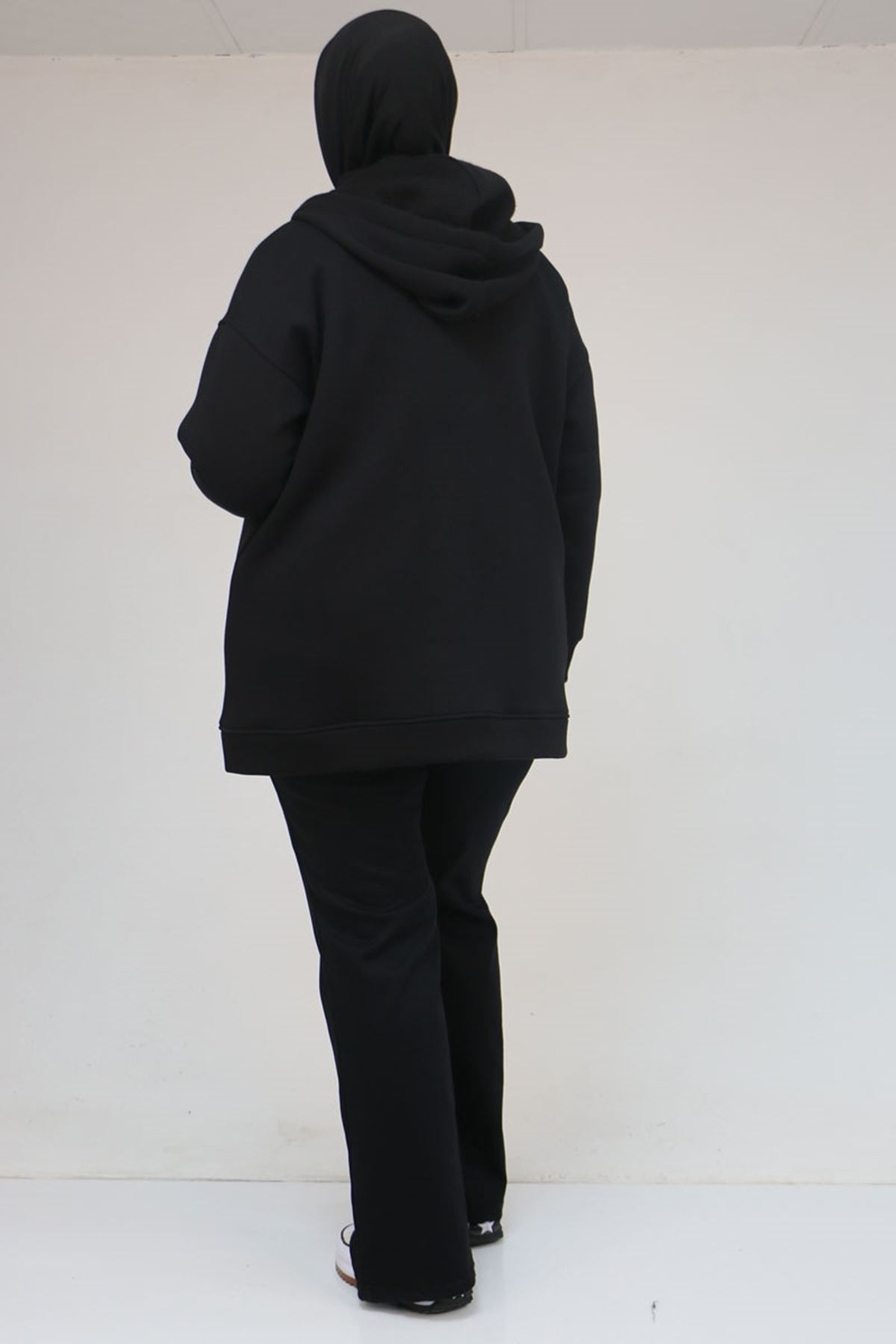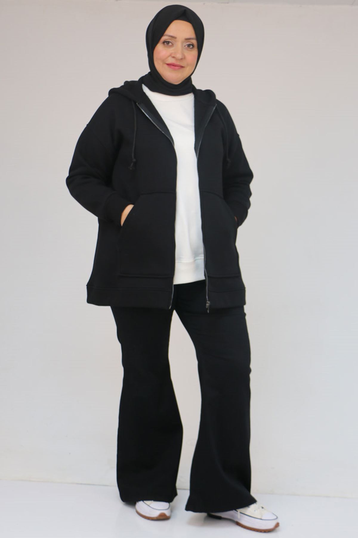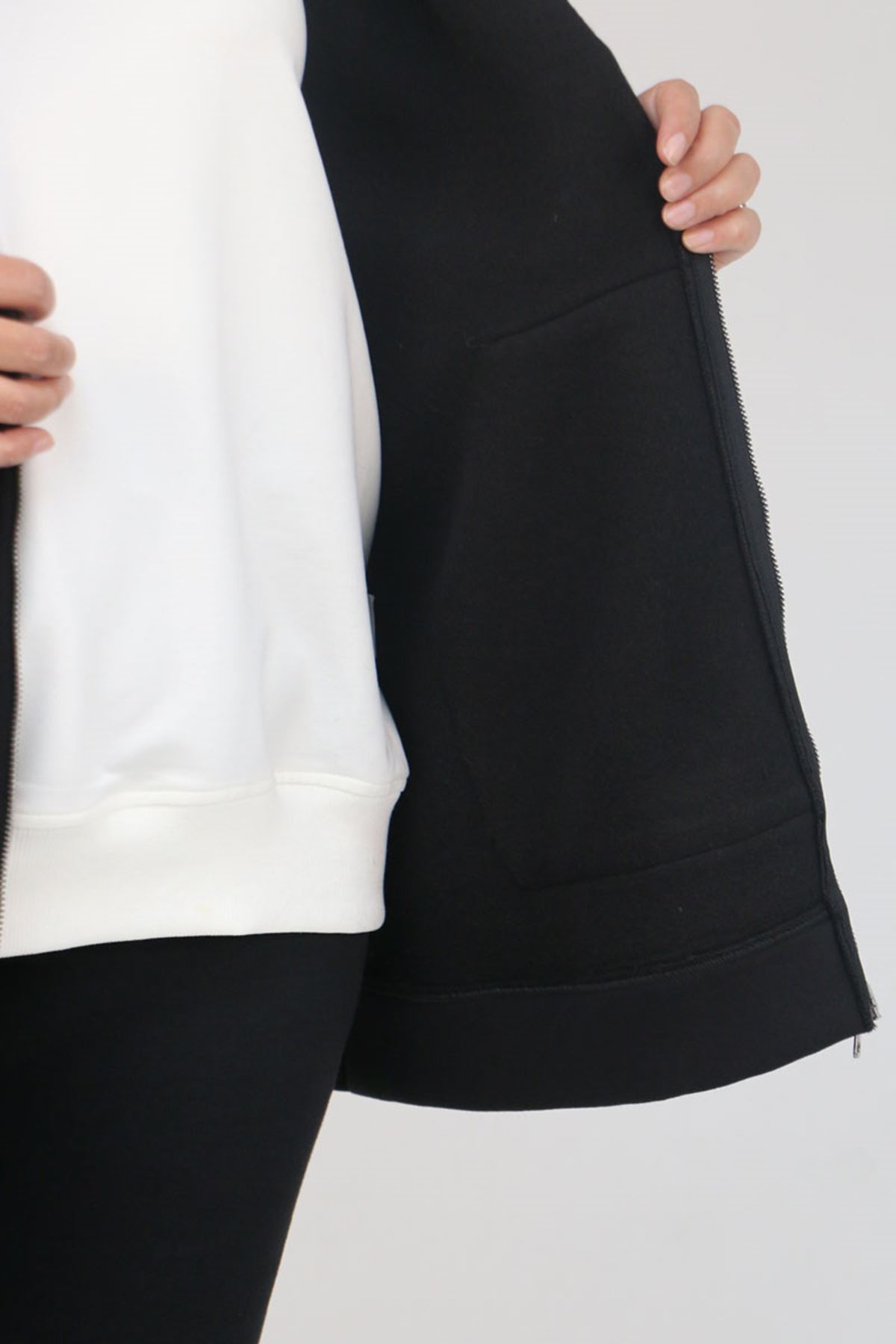 43069 Büyük Beden Eteği Ribanalı Üç İplik Ceket - Siyah