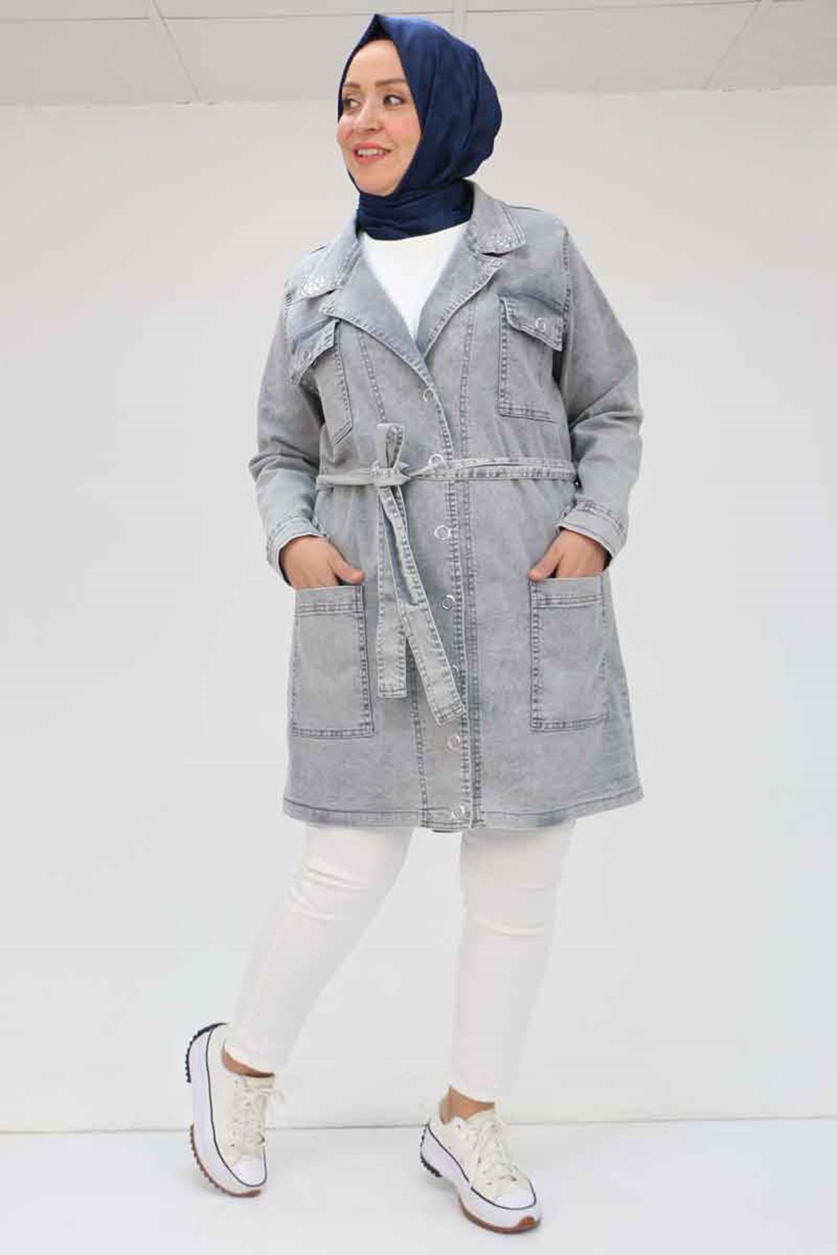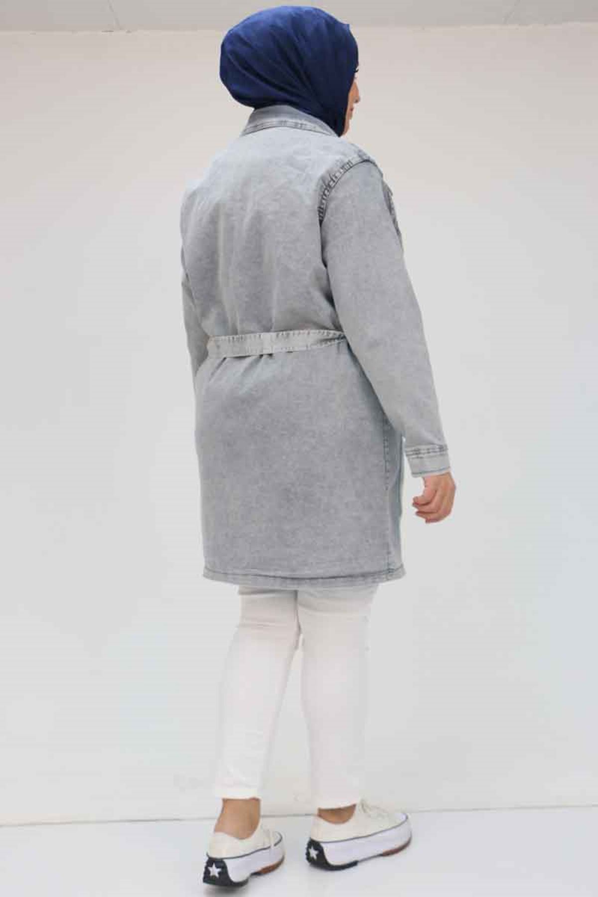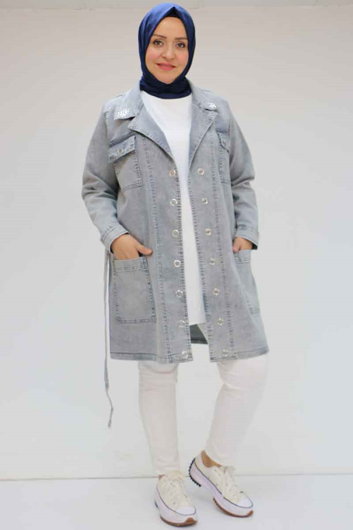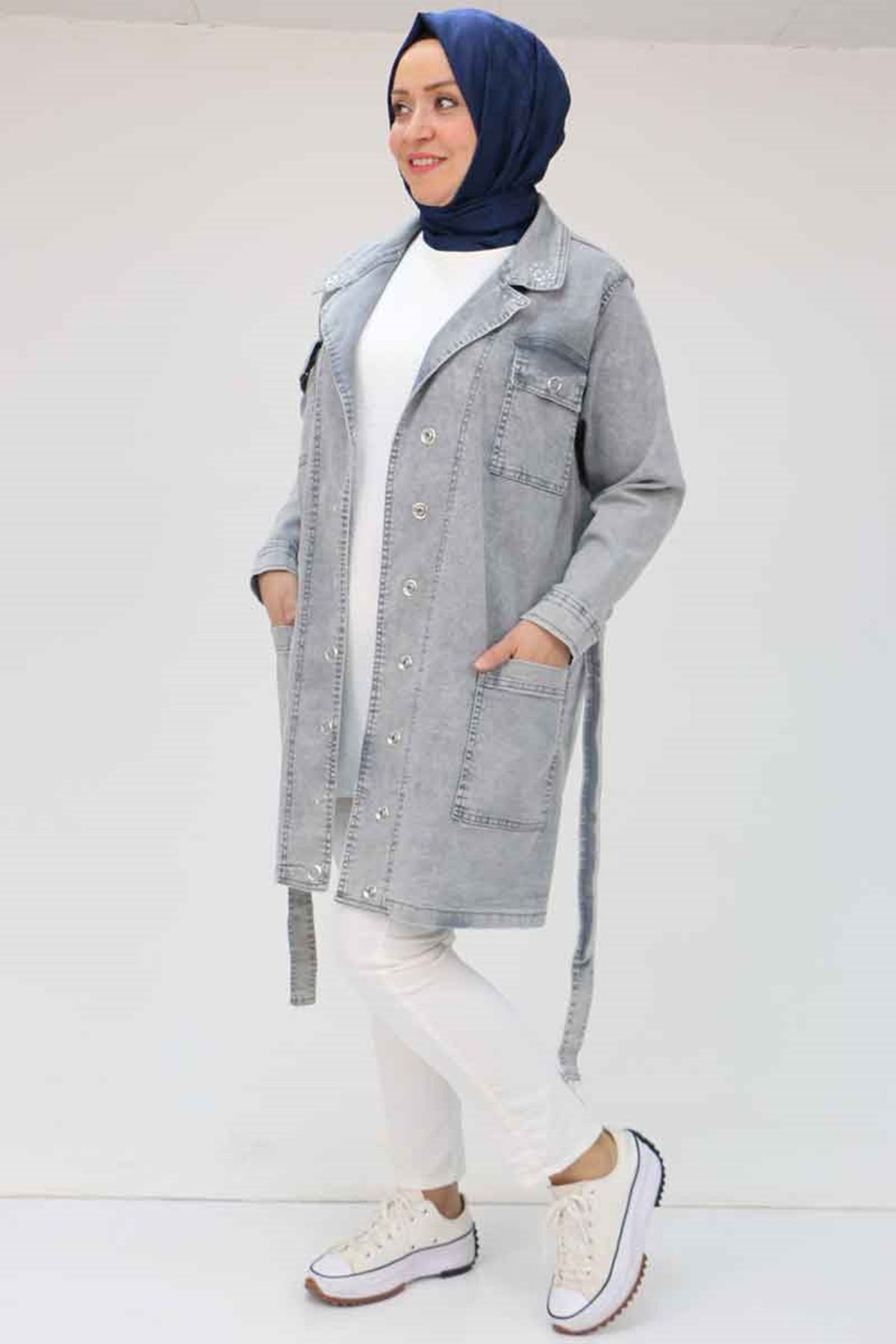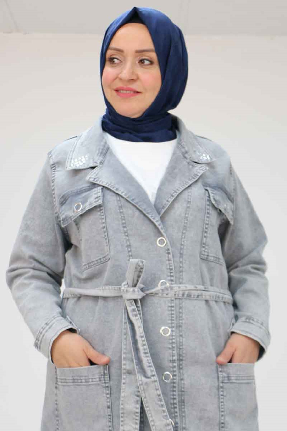 43070-E Büyük Beden Taş İşlemeli Manşetli Kot Ceket - Gri