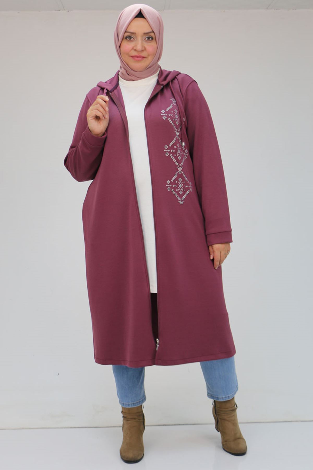 43085 Büyük Beden Kapşonlu Osyho Baskı Detaylı Kap - Mürdüm