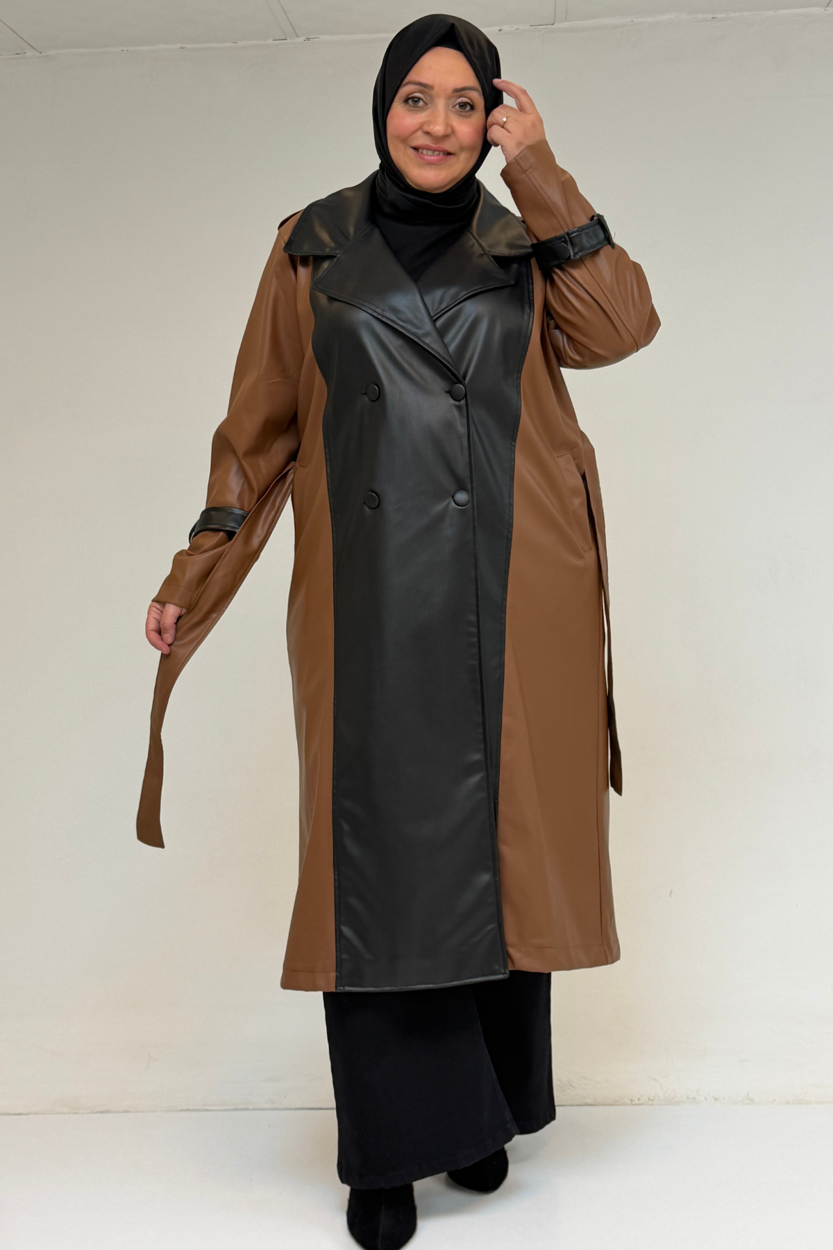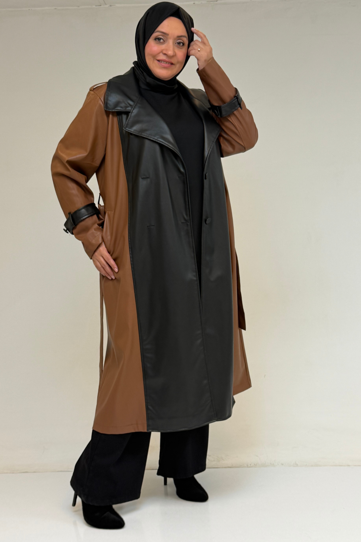 43099 Büyük Beden Deri Kombinli Düğmeli Kap - Taba