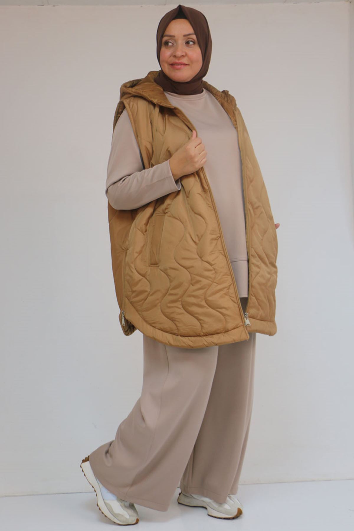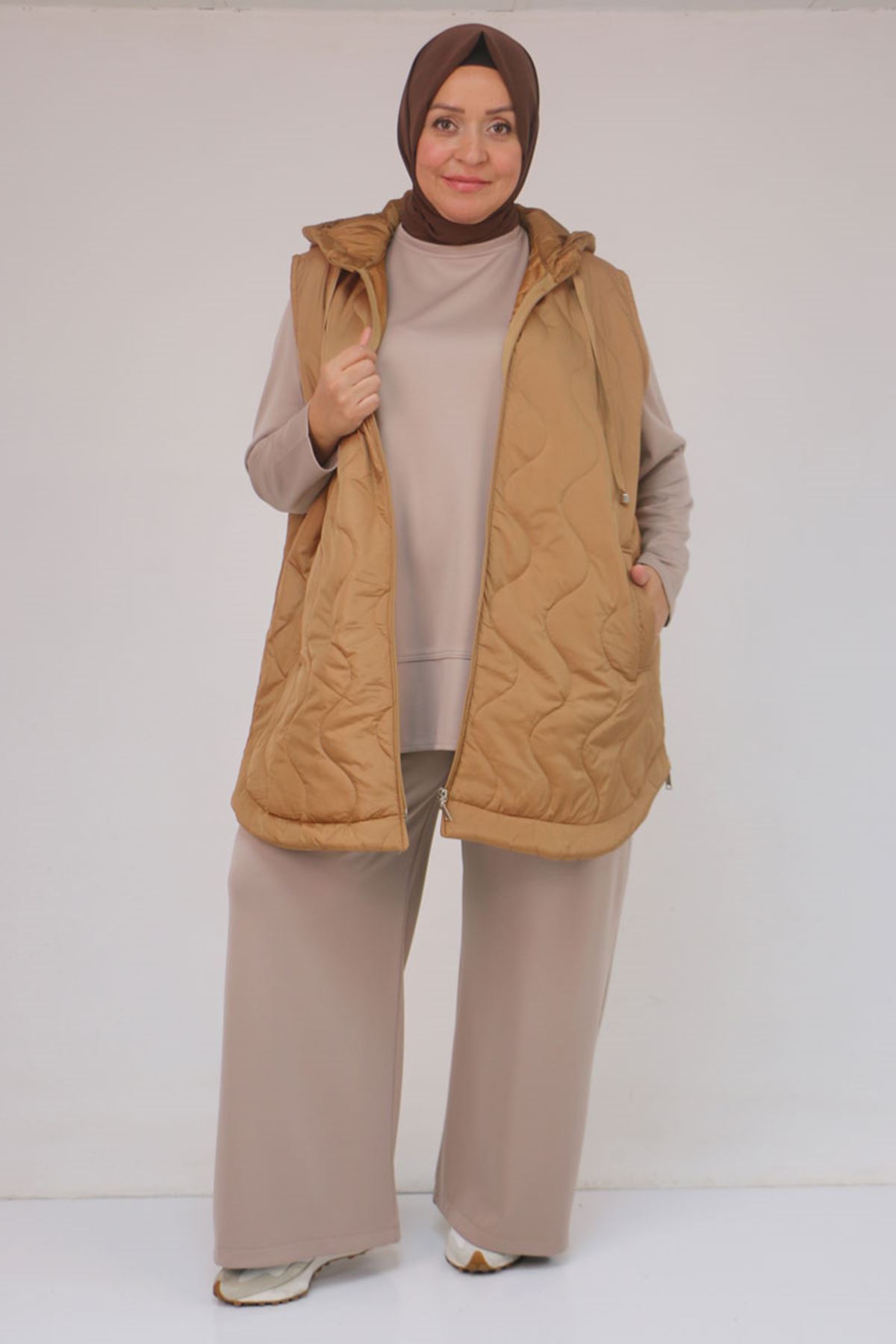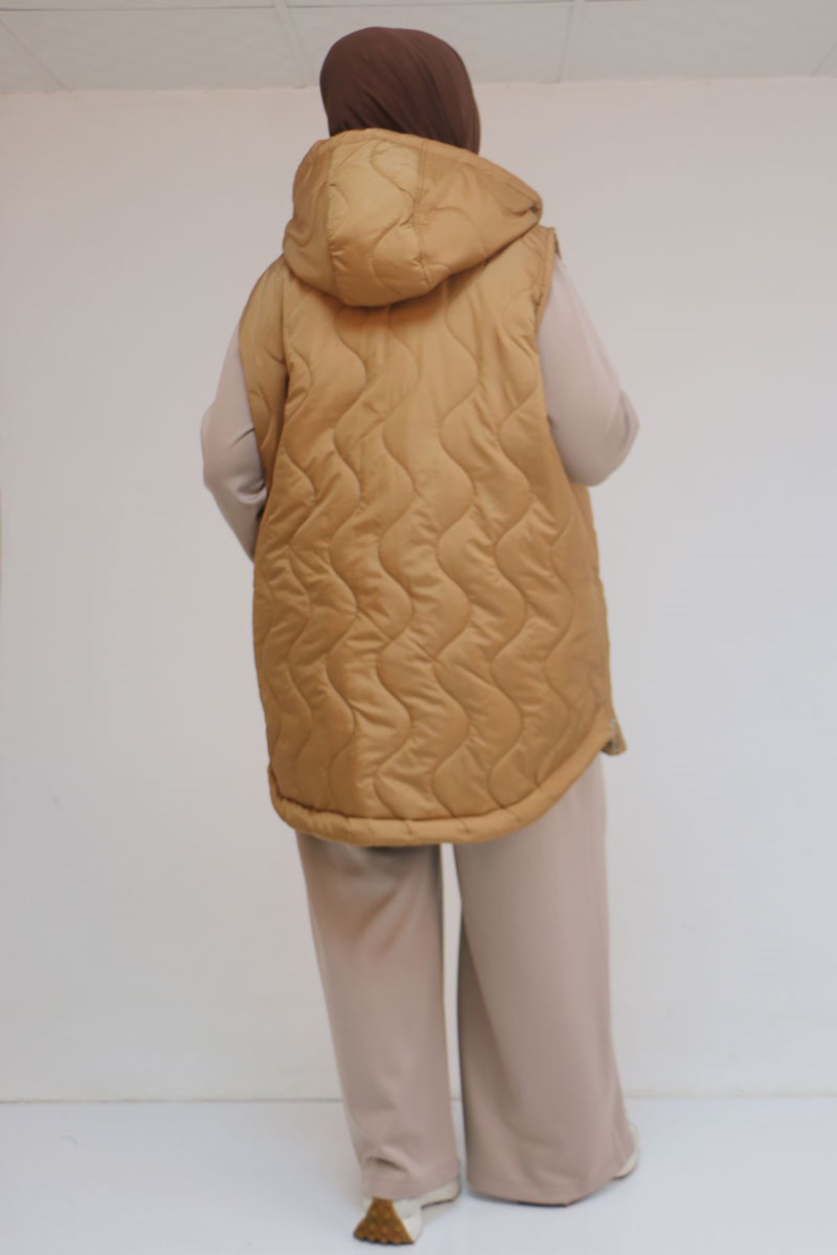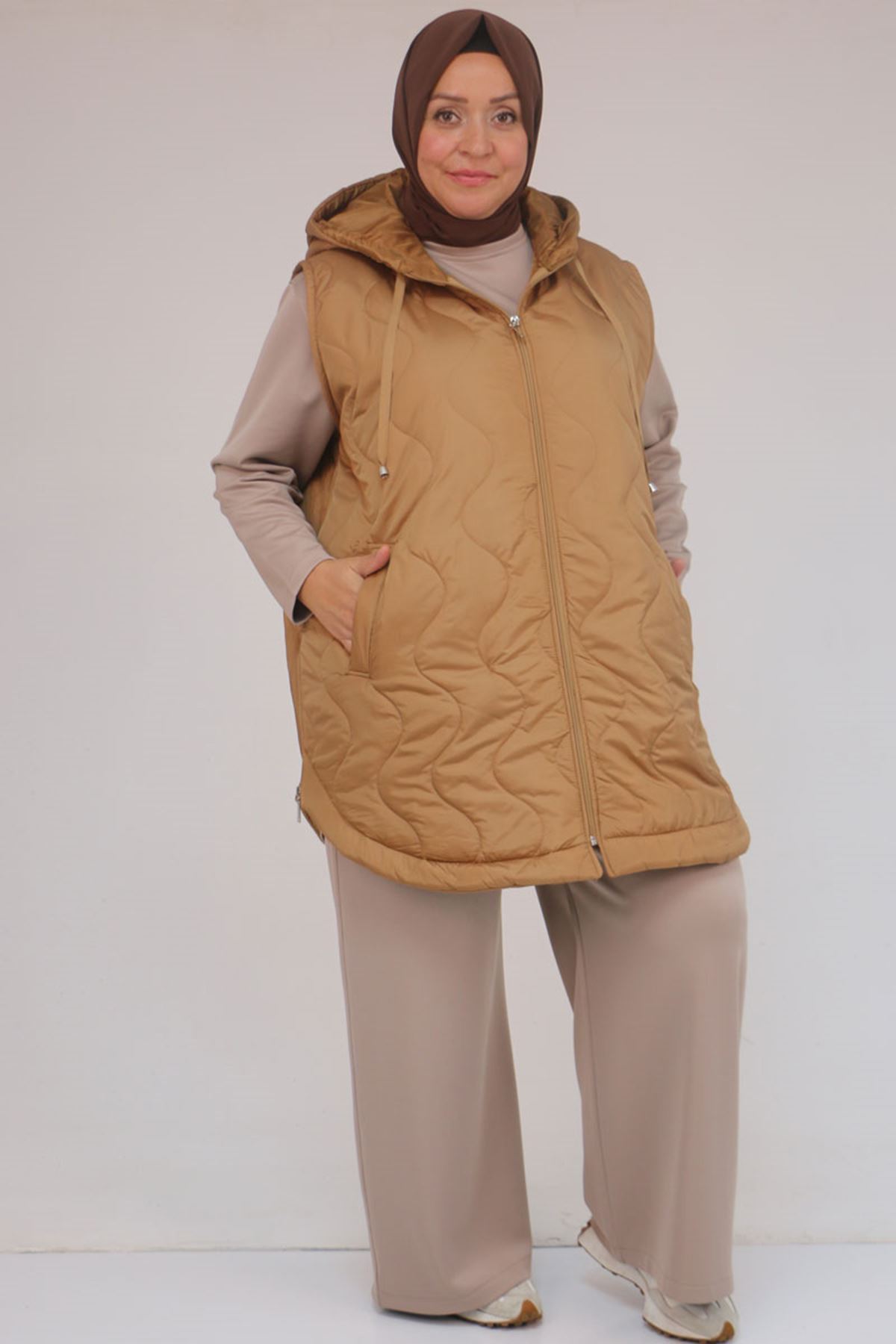44007 Büyük Beden Yanı Yırtaçlı Oval Kesim Kapitone Yelek - Taba