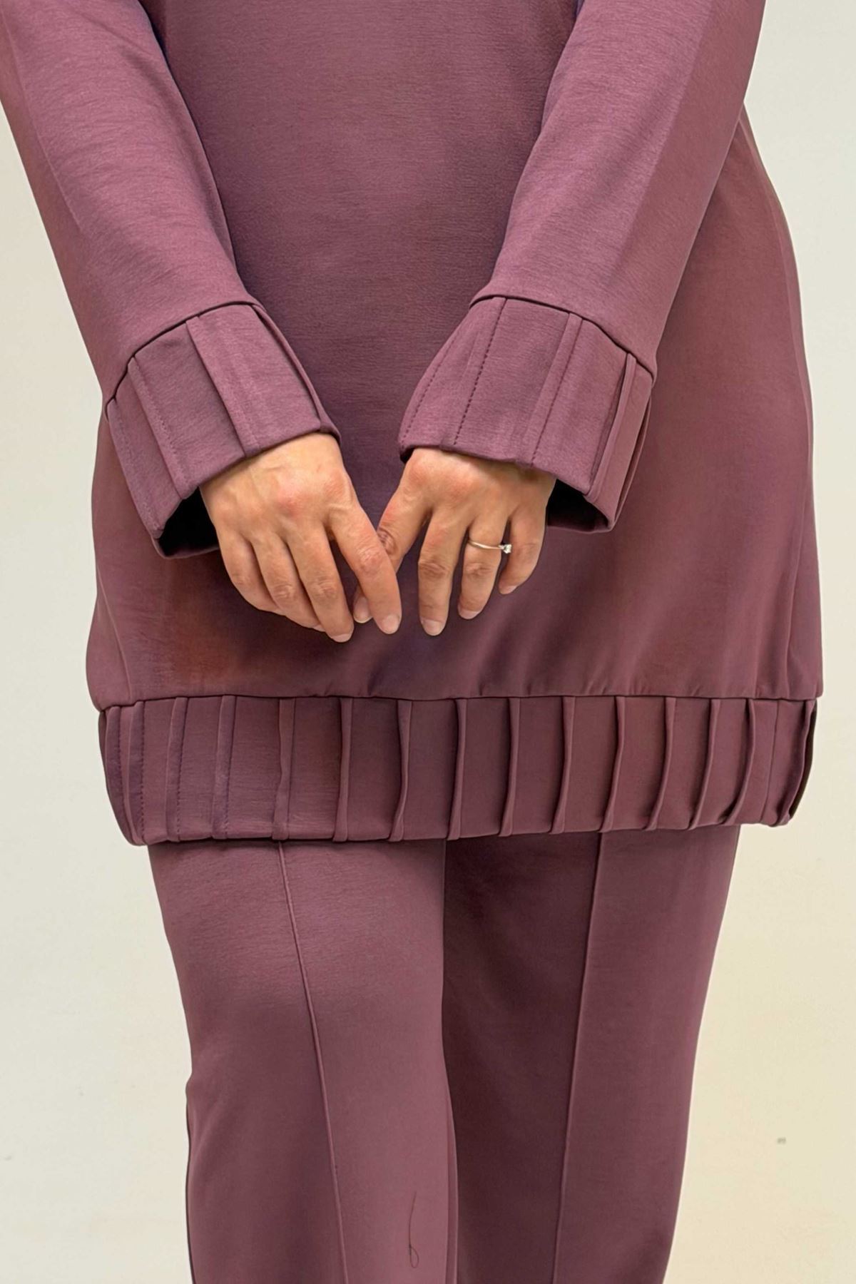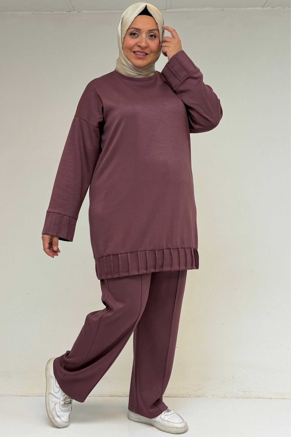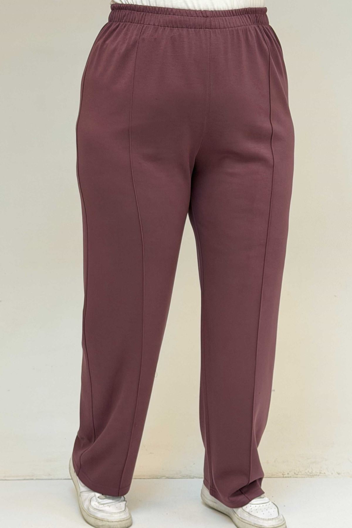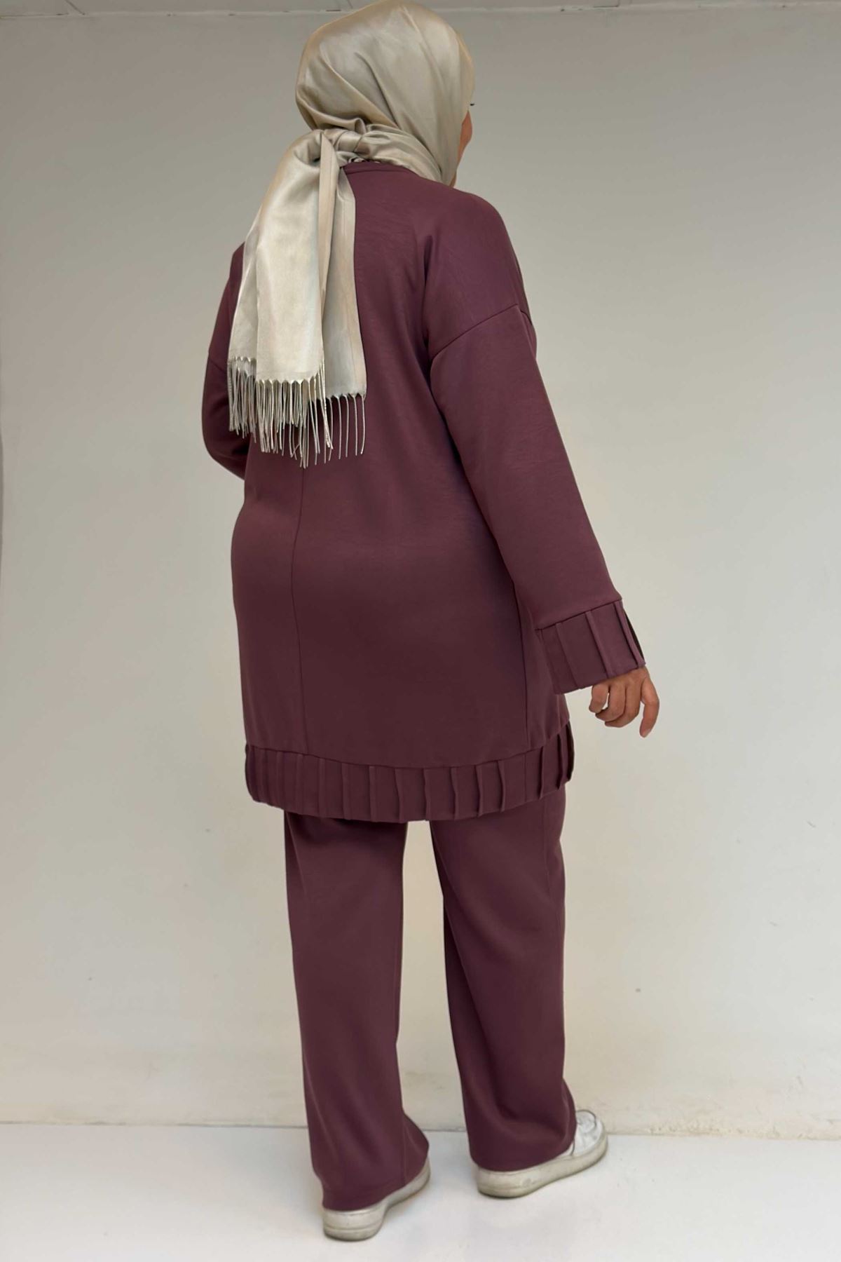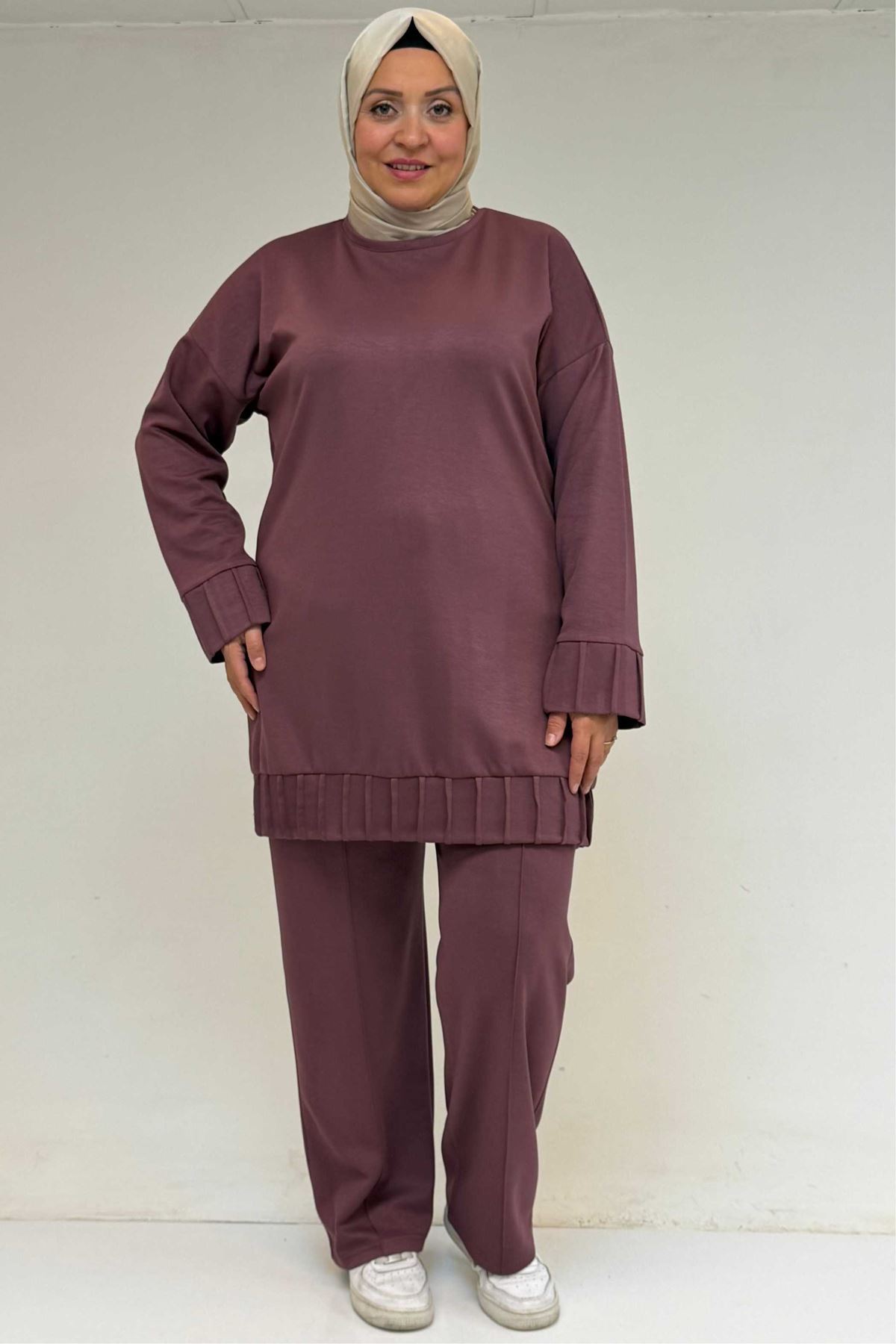 47069 Büyük Beden Çıma Detaylı Modal Pantolonlu Takım - Gül Kurusu