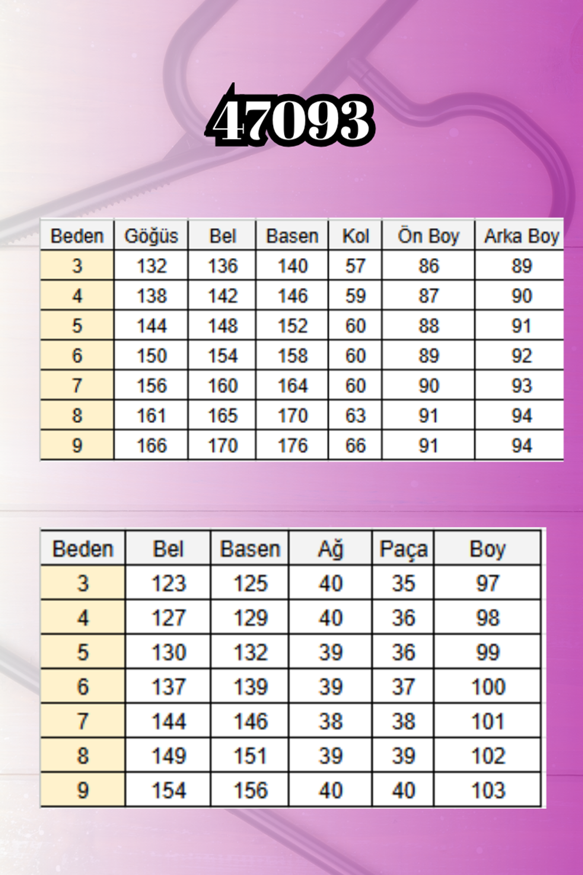 BEL GENİŞLİĞİ :88 cm GÖĞÜS GENİŞLİĞİ :103 cm BASEN :116 cm