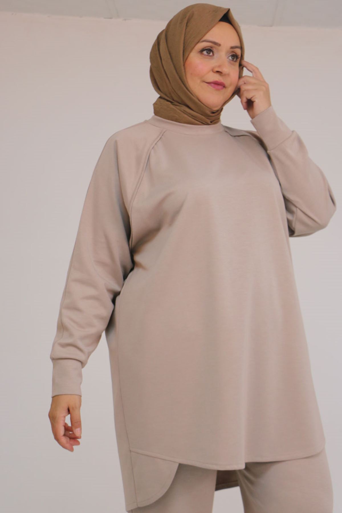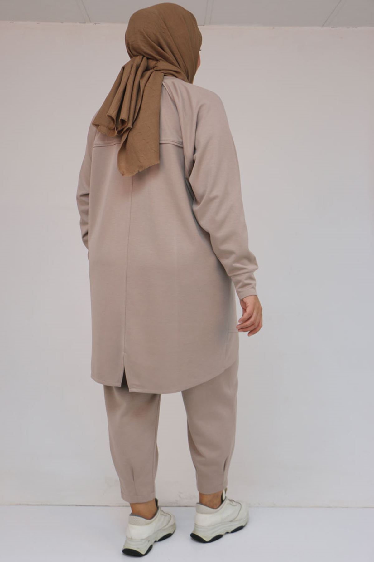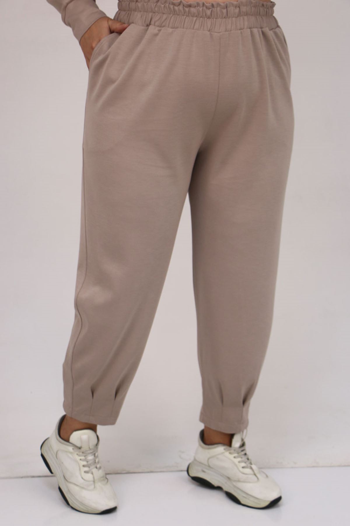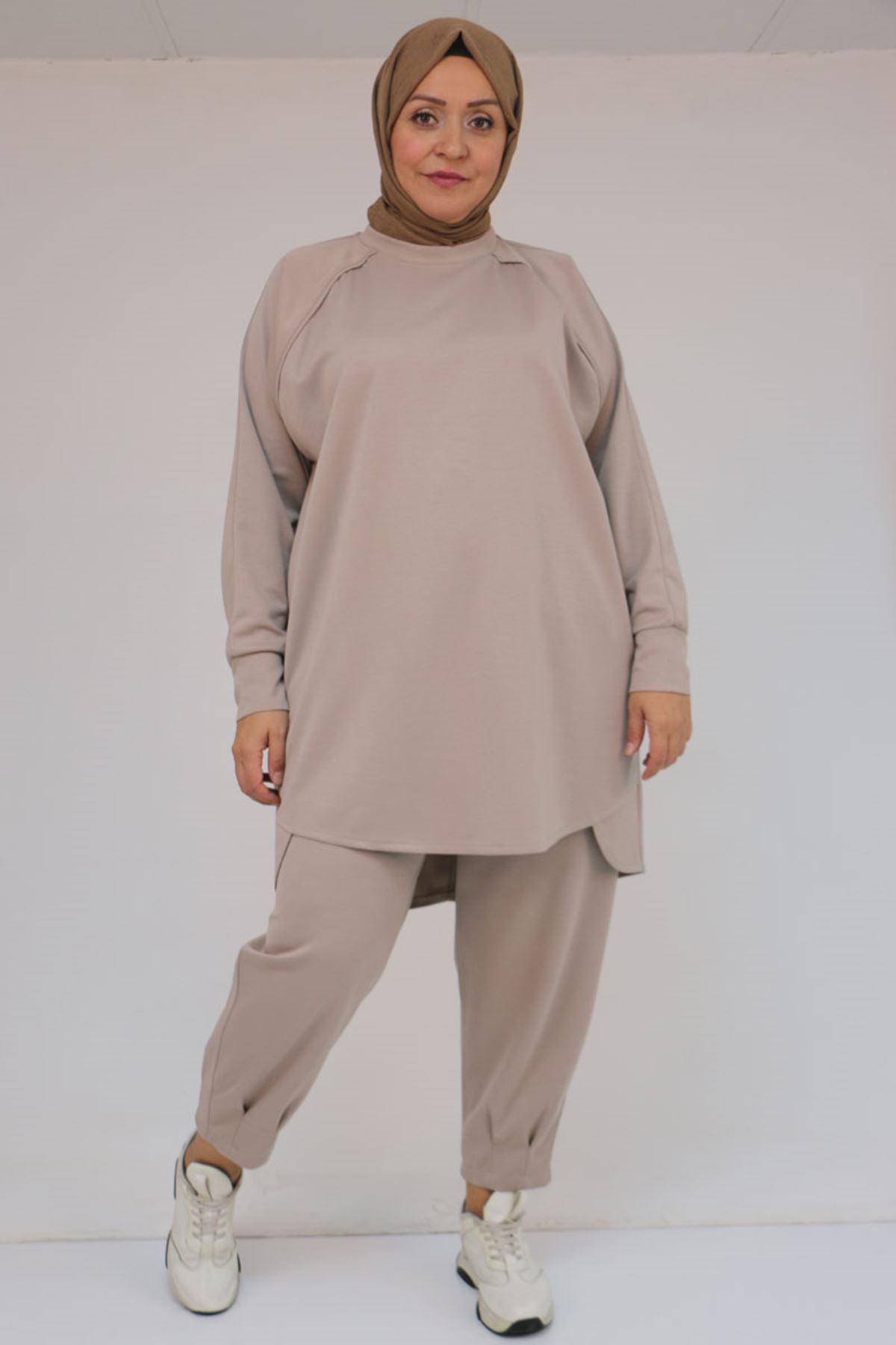 47093 Büyük Beden Eteği Parça Detaylı Pantolonlu Modal Takım - Vizon