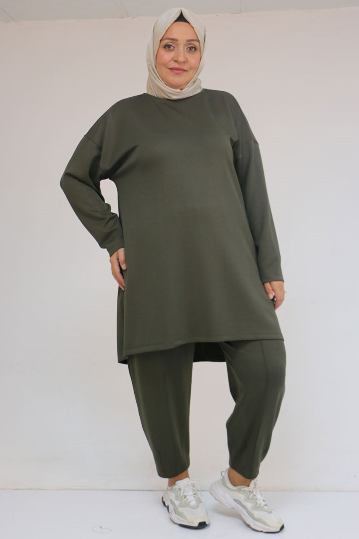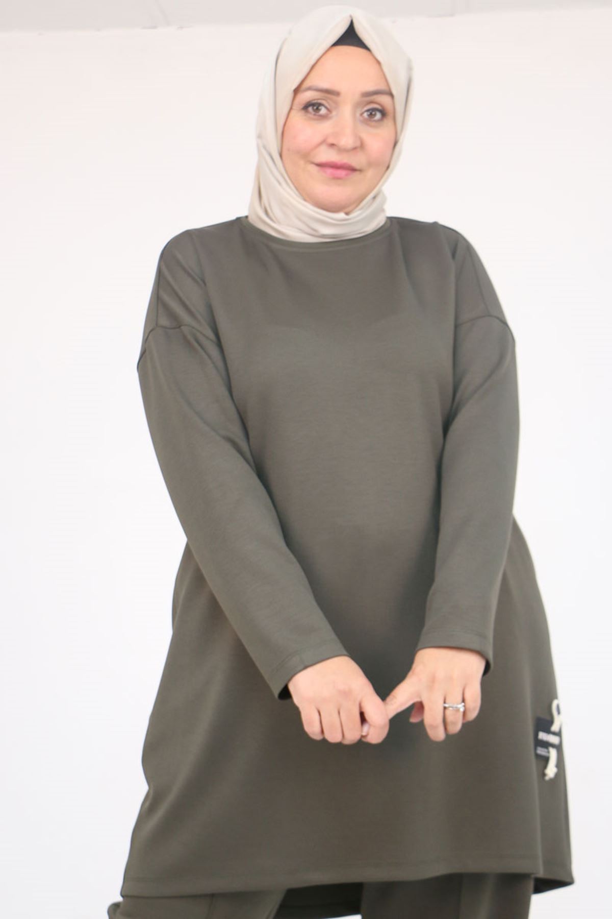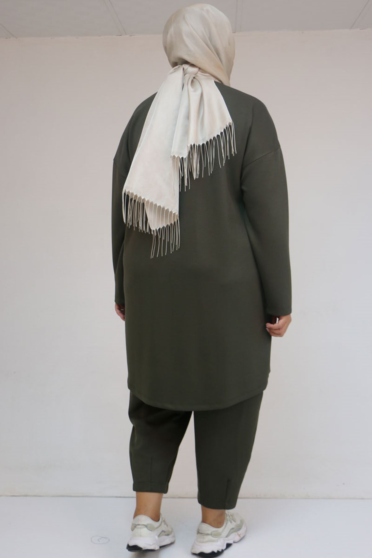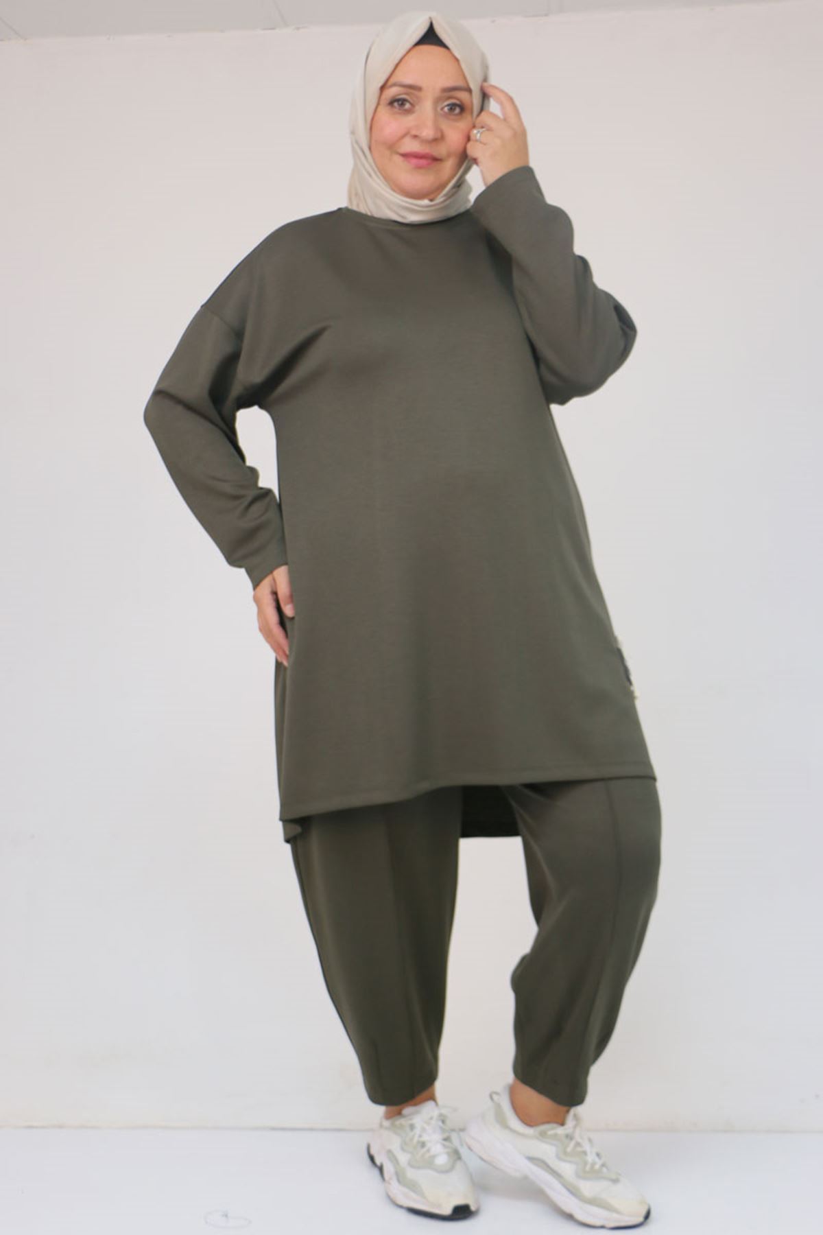 47095 Büyük Beden Yan Tarafı Arma Detaylı Modal Pantolonlu Takım - Haki