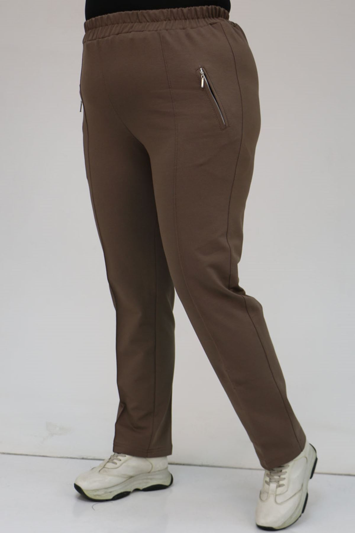 49514 Büyük Beden İki İplik Cepleri Fermuarlı Çimalı Eşofman Altı - Vizon