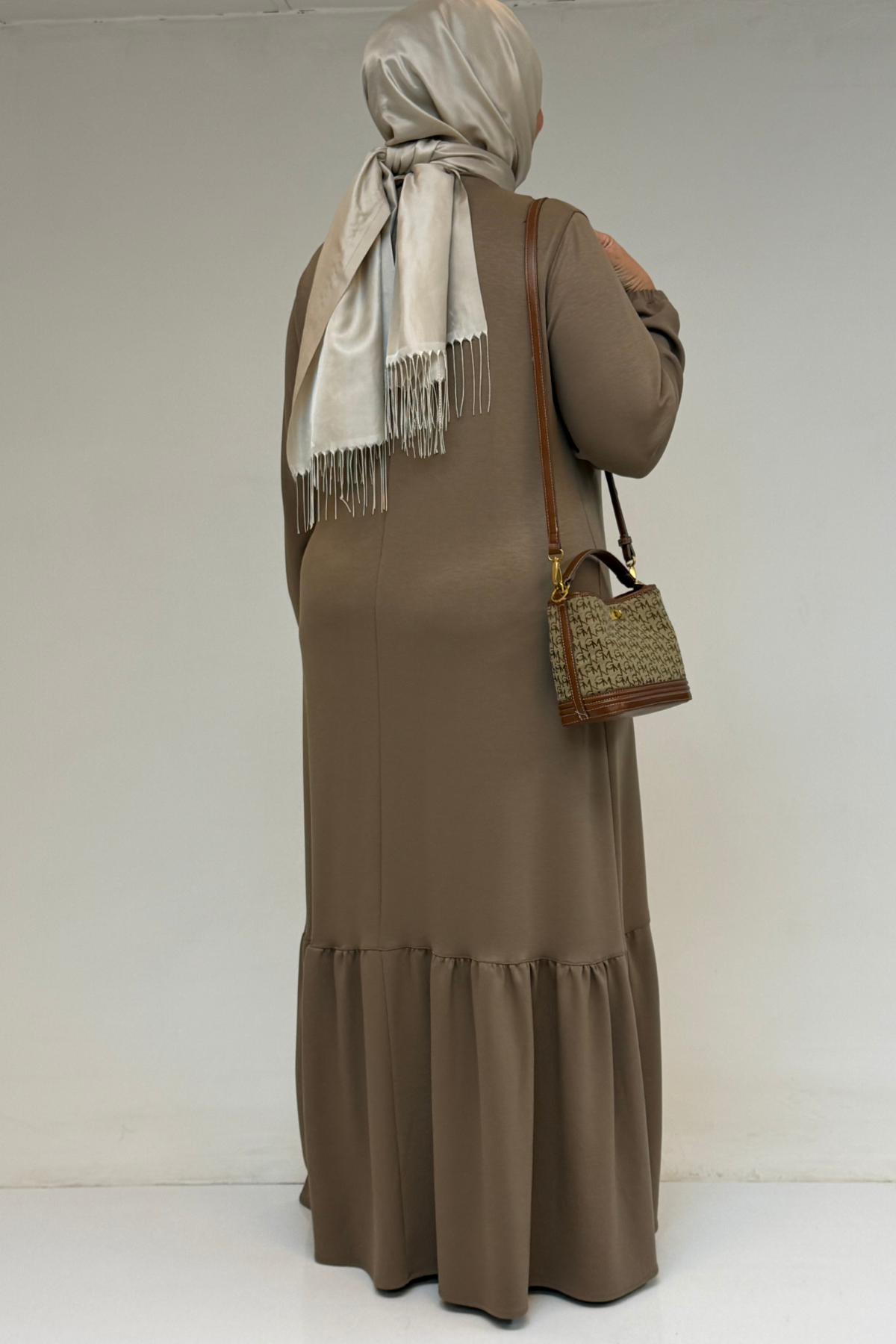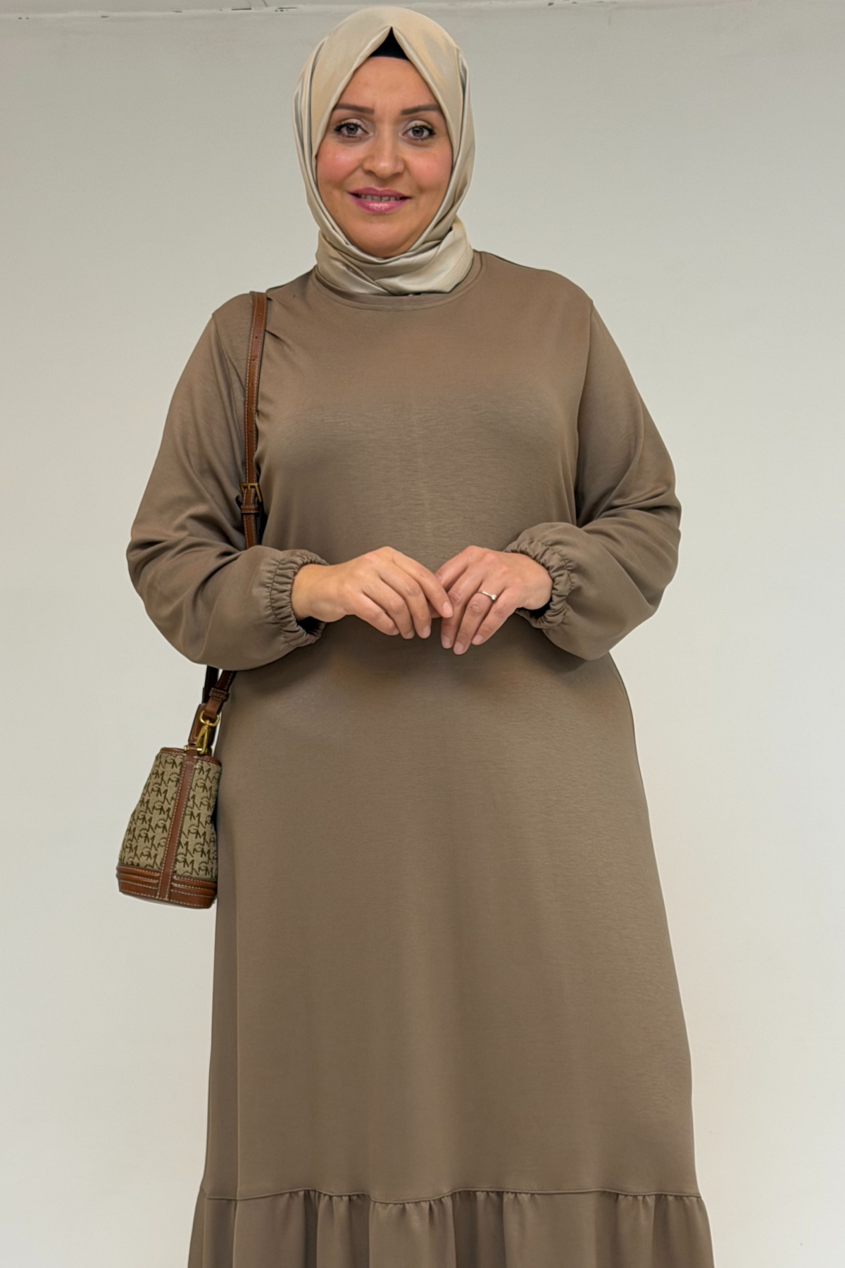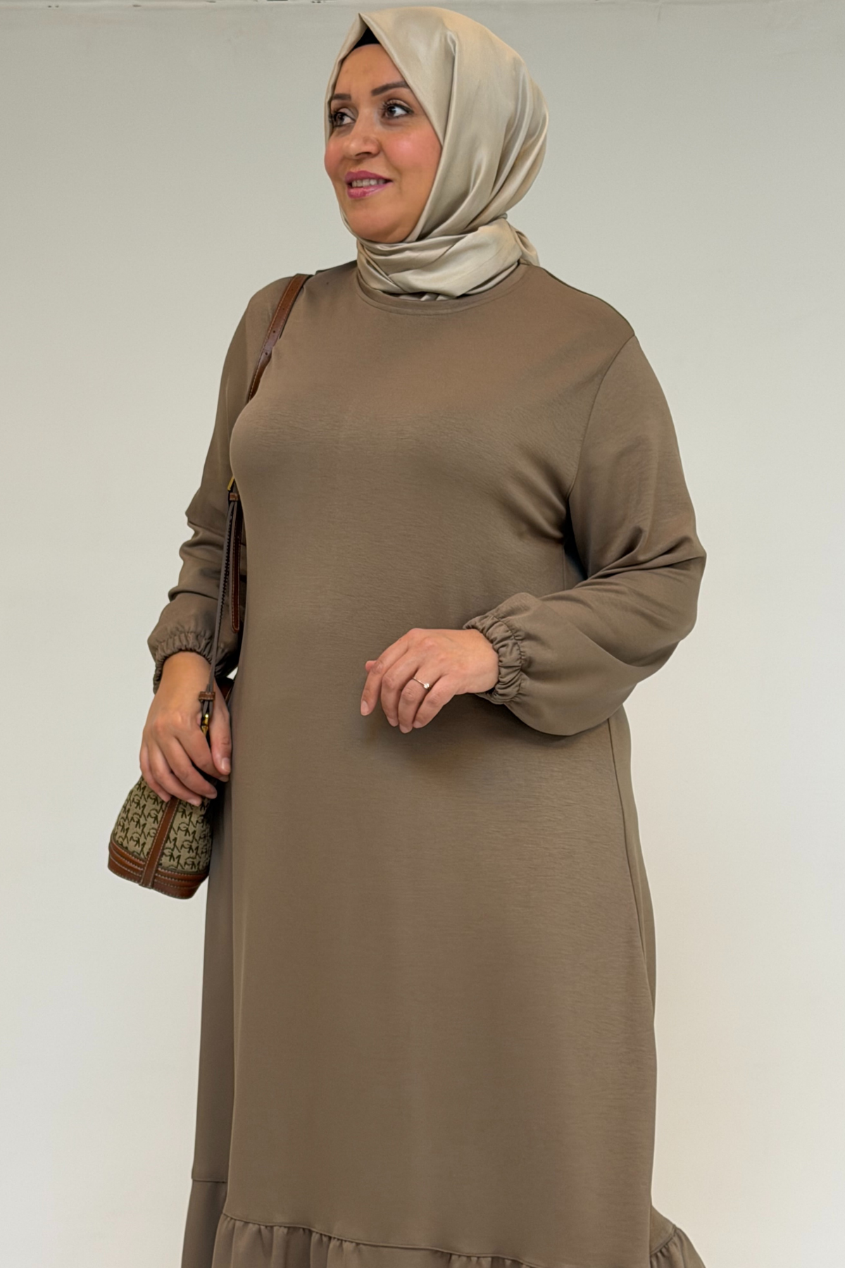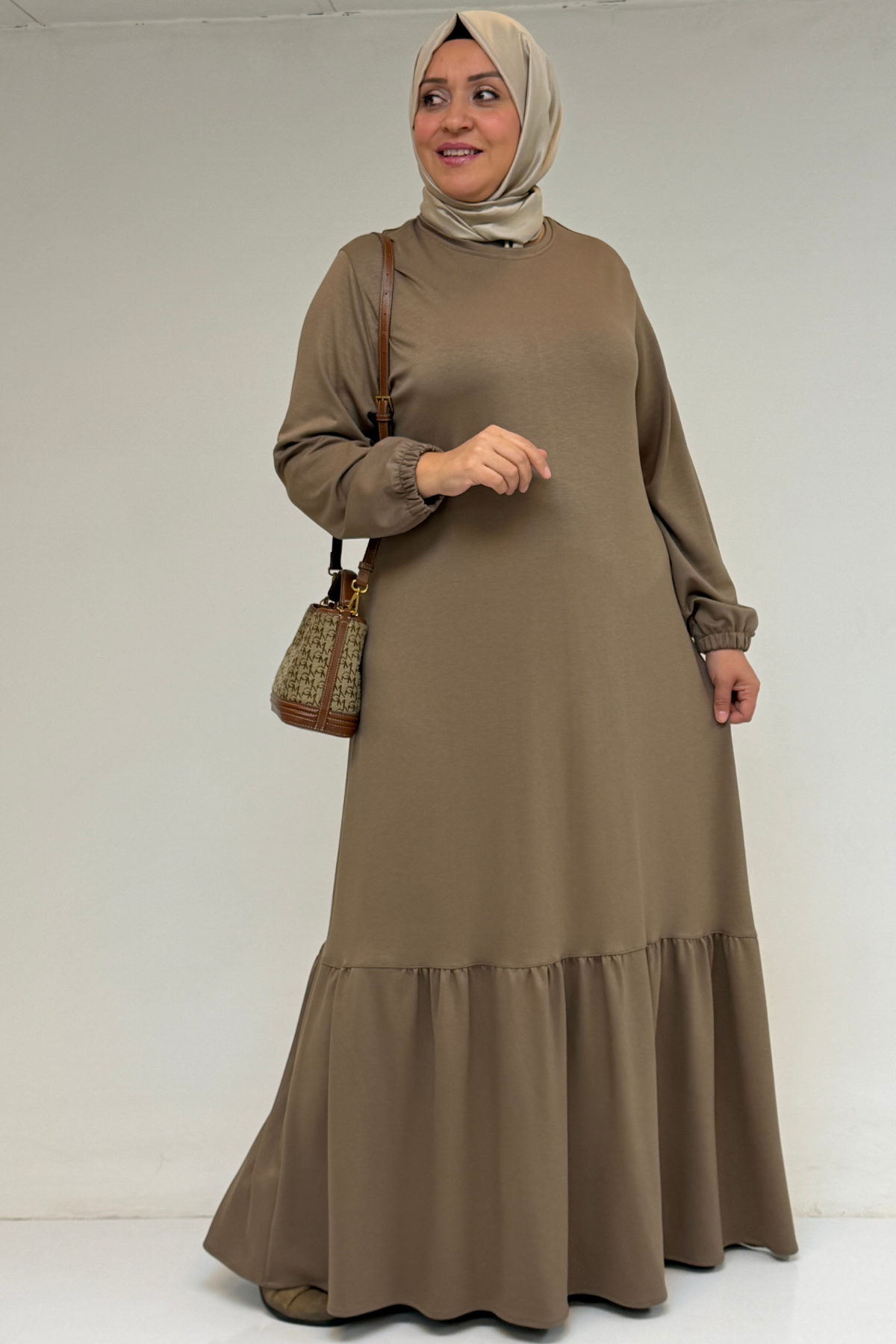 52033 Büyük Beden Eteği Fırfırlı Modal Elbise - Vizon