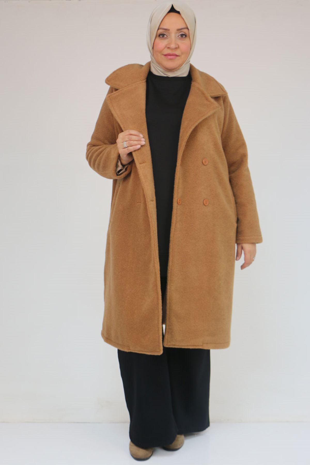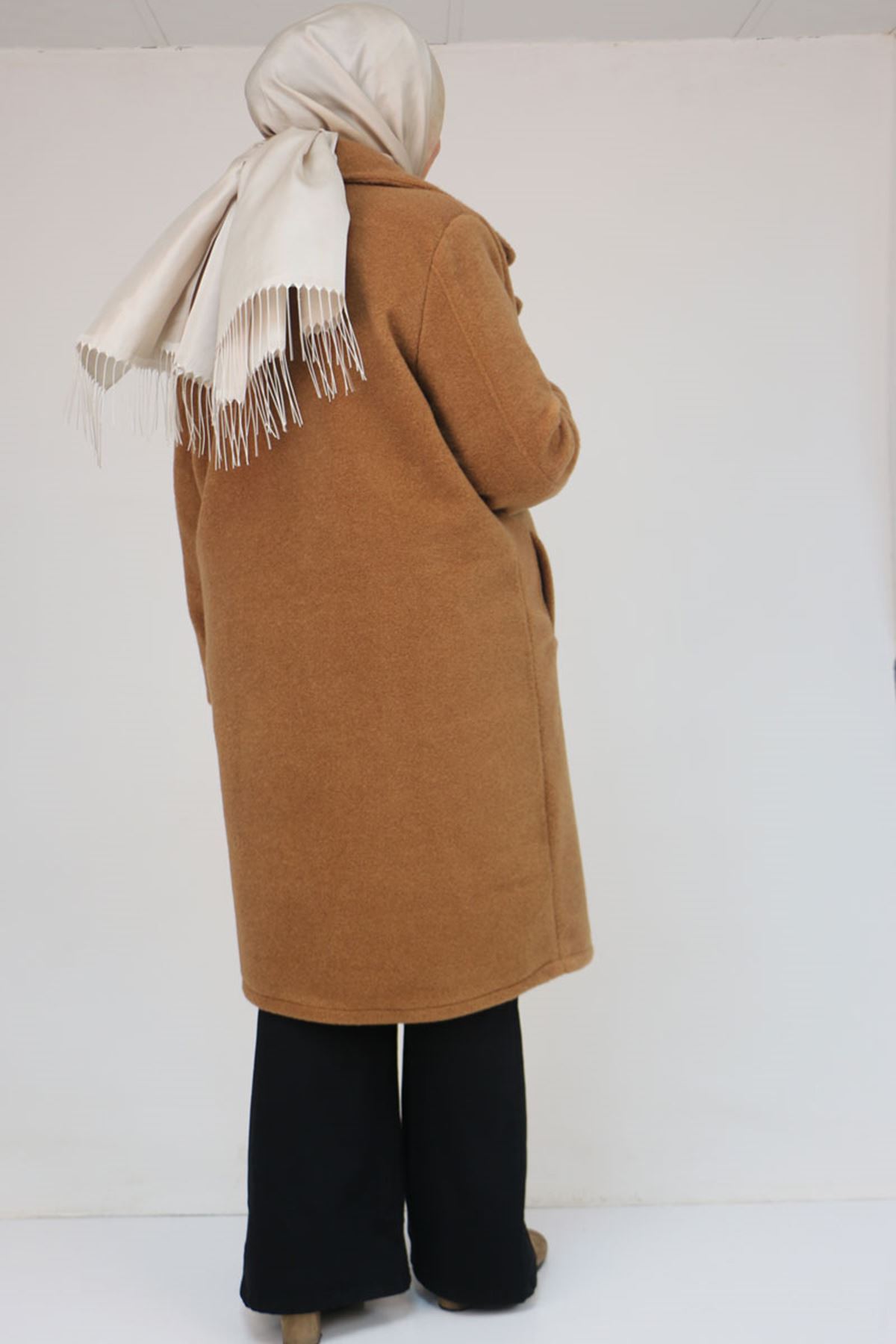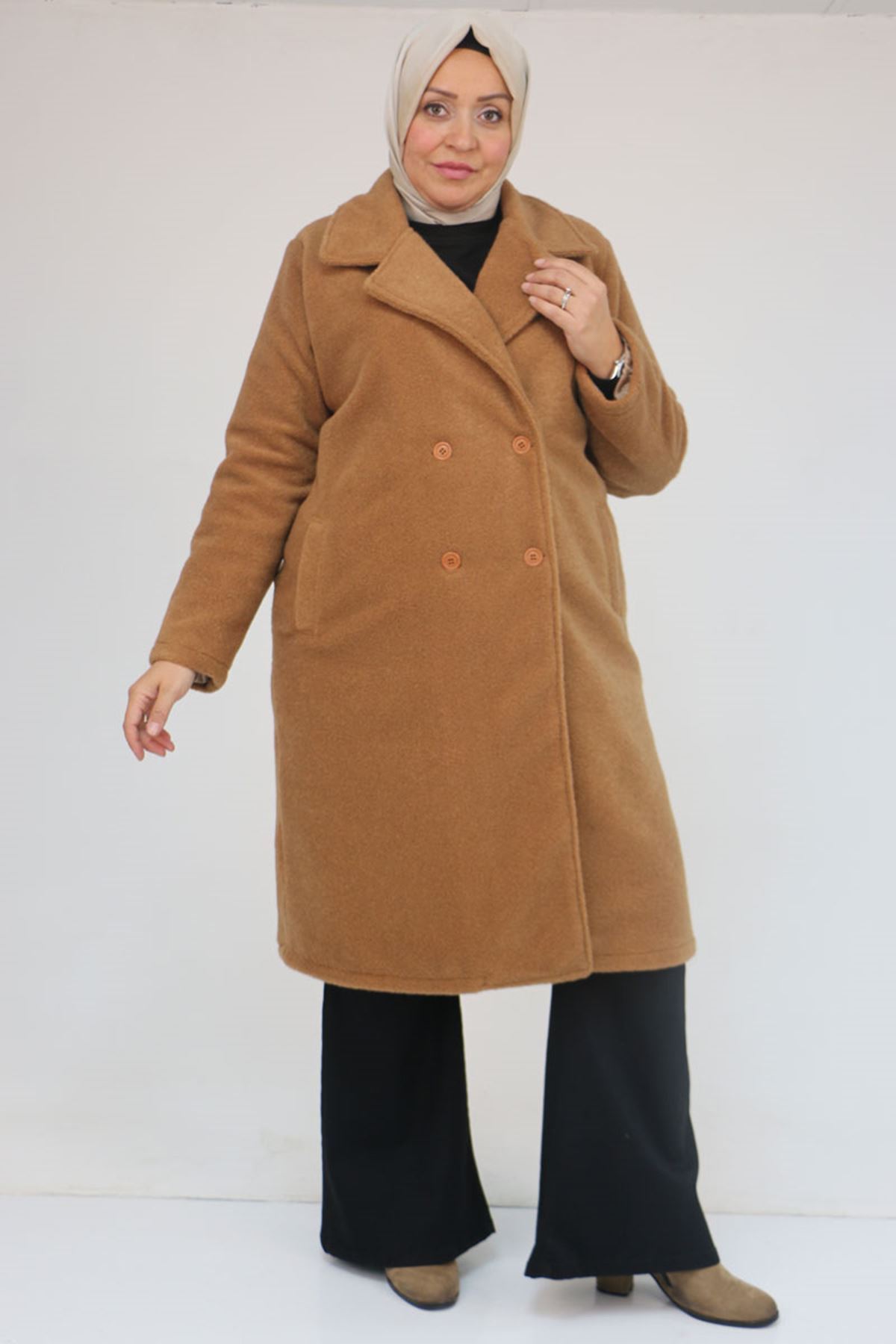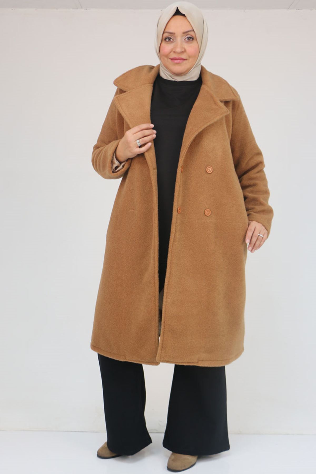 33059 Büyük Beden Düğme Detaylı Keçe Kaban - Taba