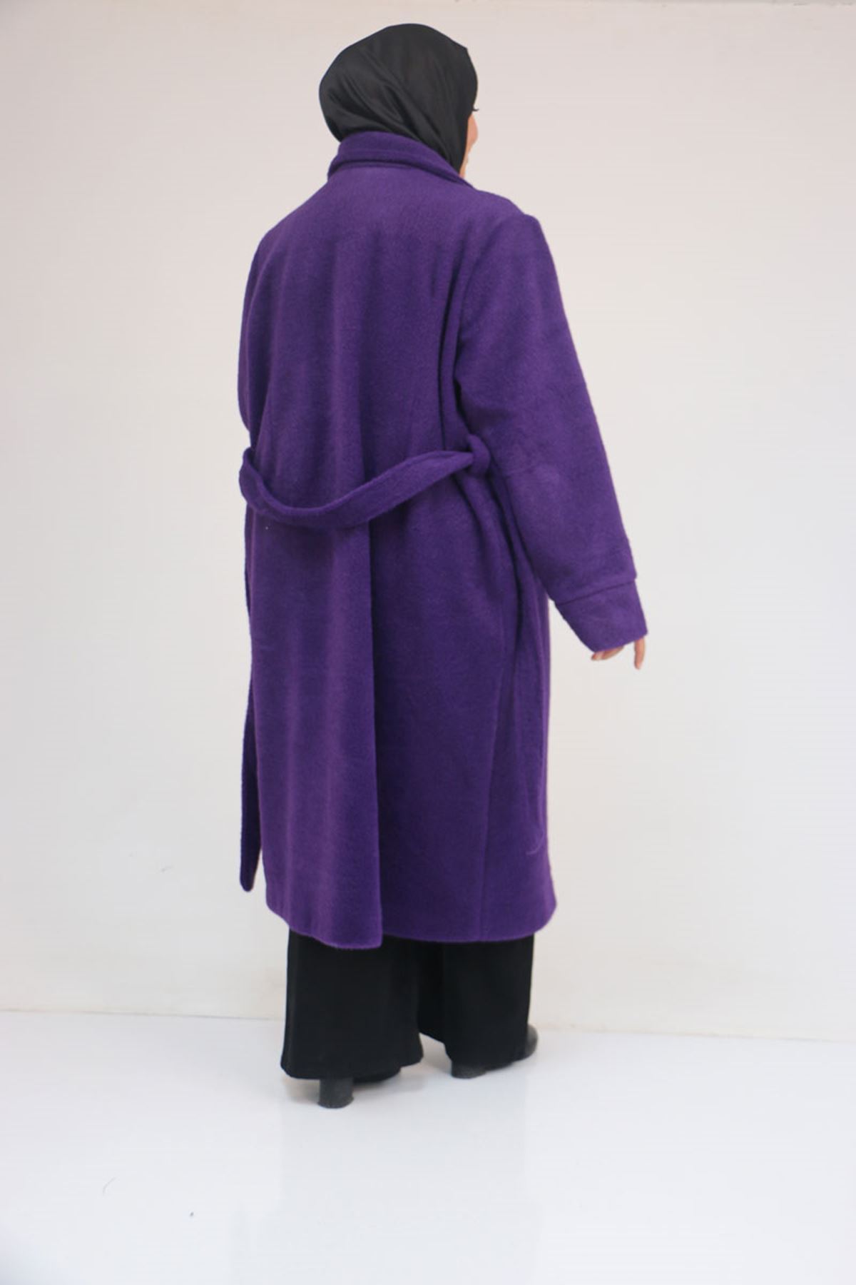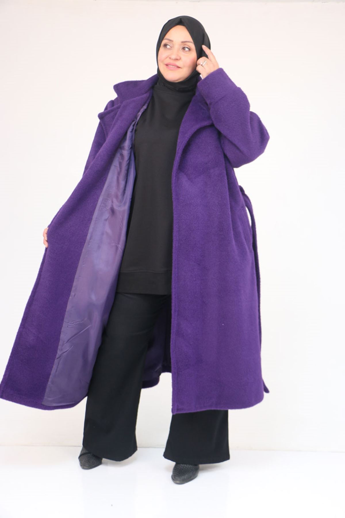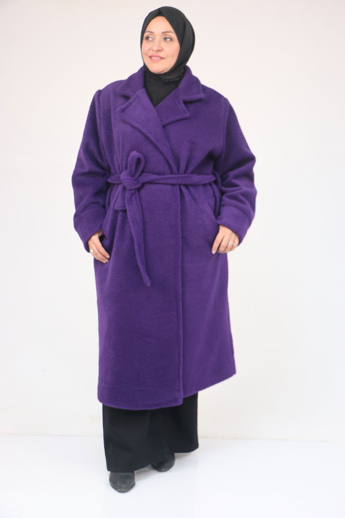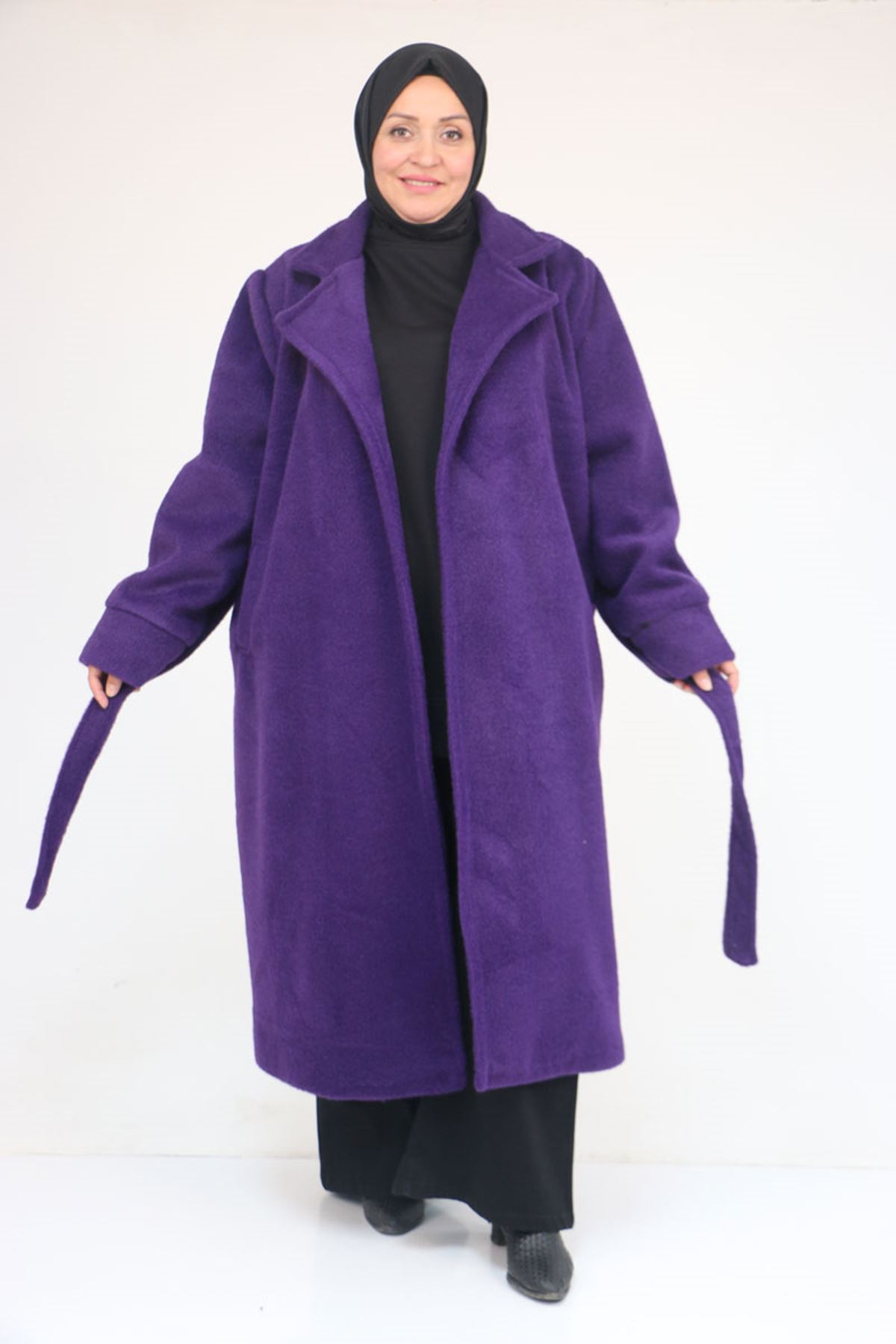 53049 Büyük Beden Keçe Kalın Manşetli Kaban - Mor