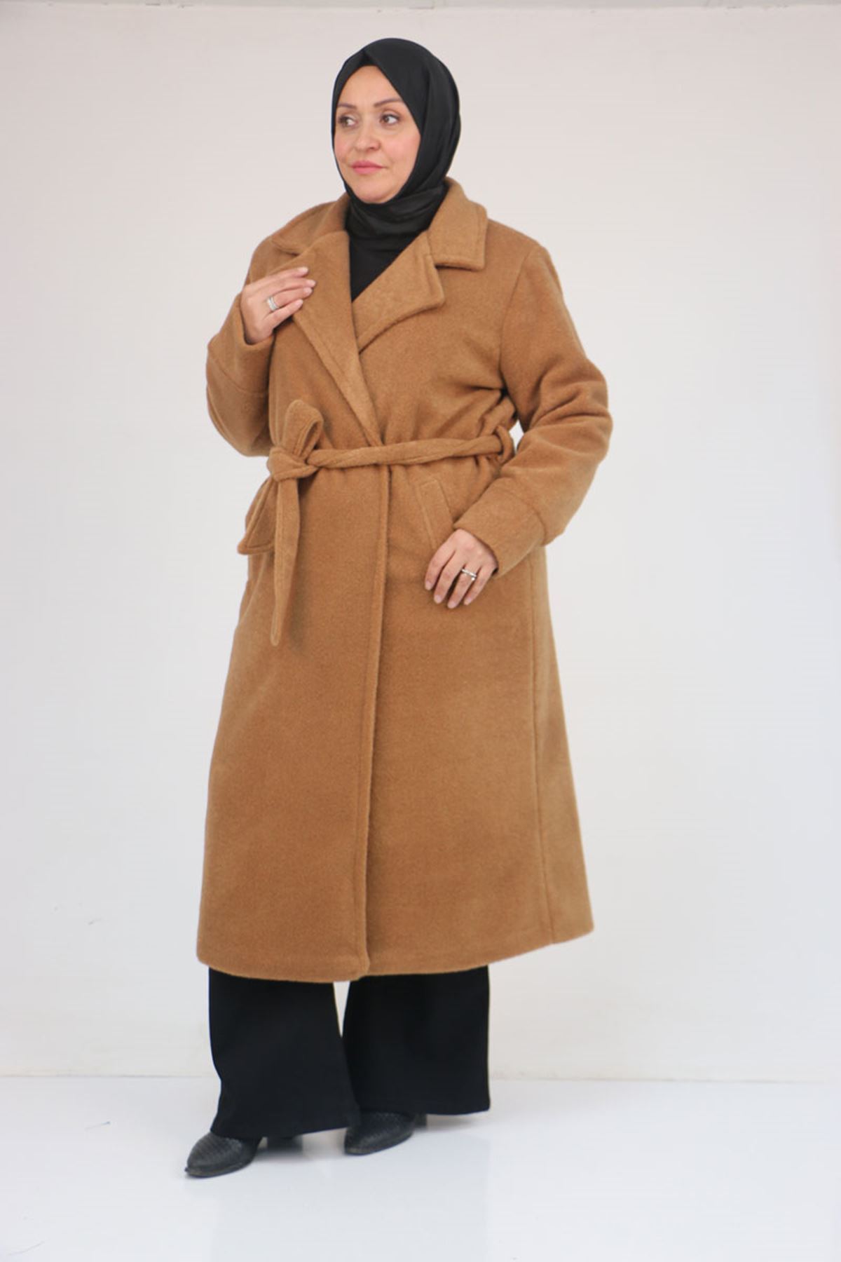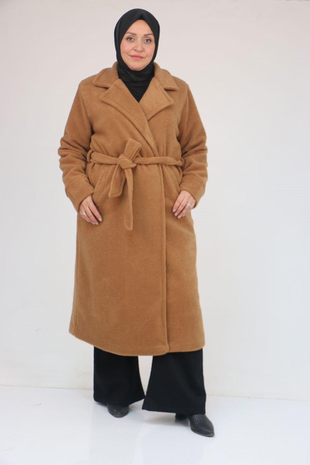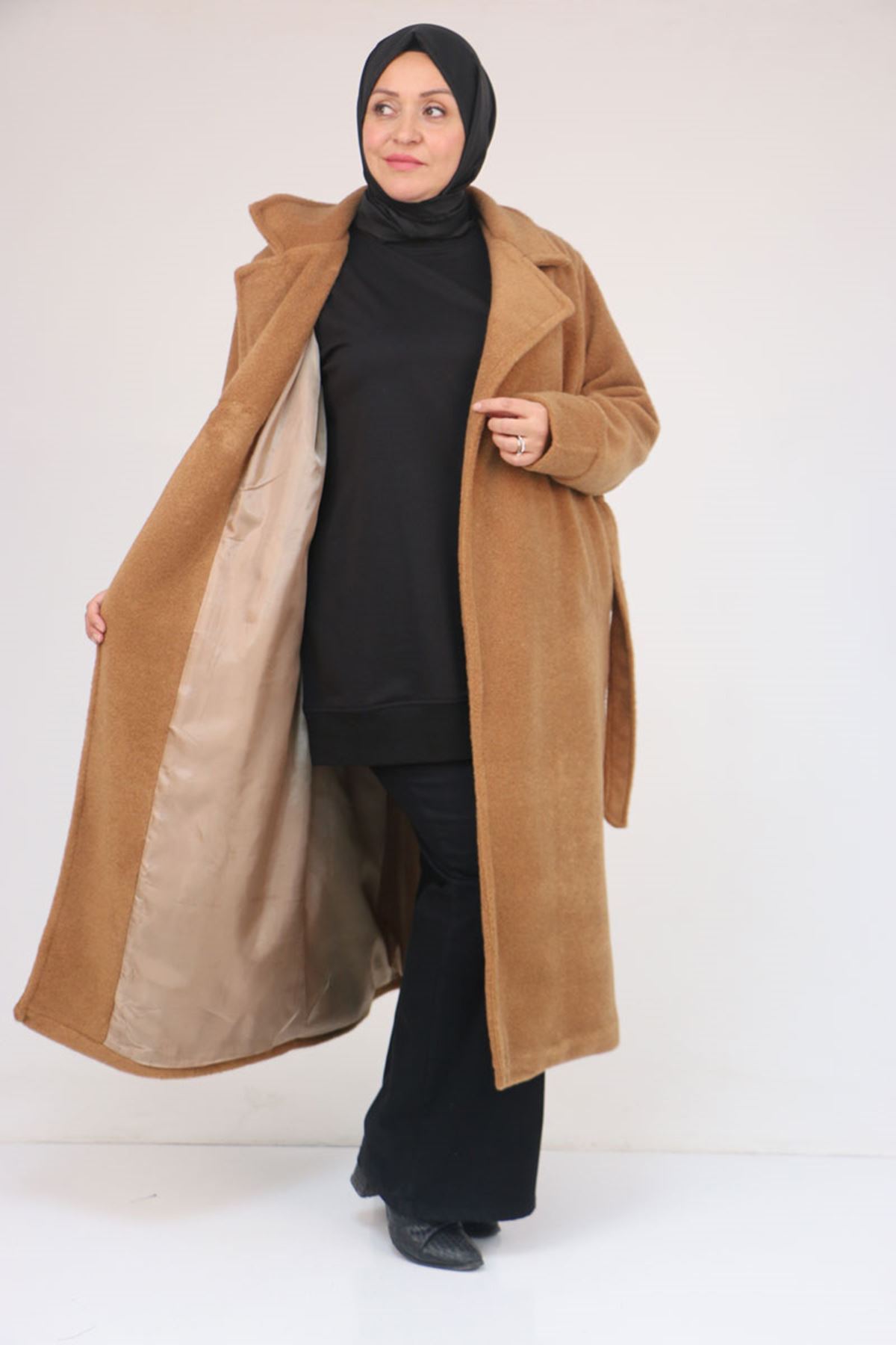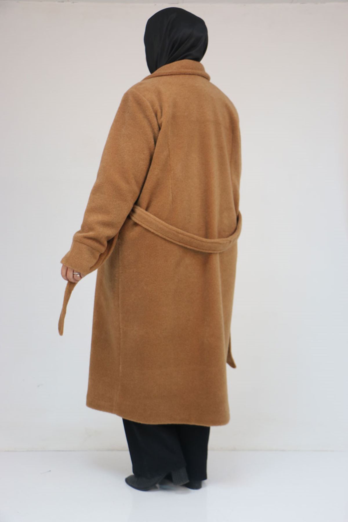 53049 Büyük Beden Keçe Kalın Manşetli Kaban - Taba