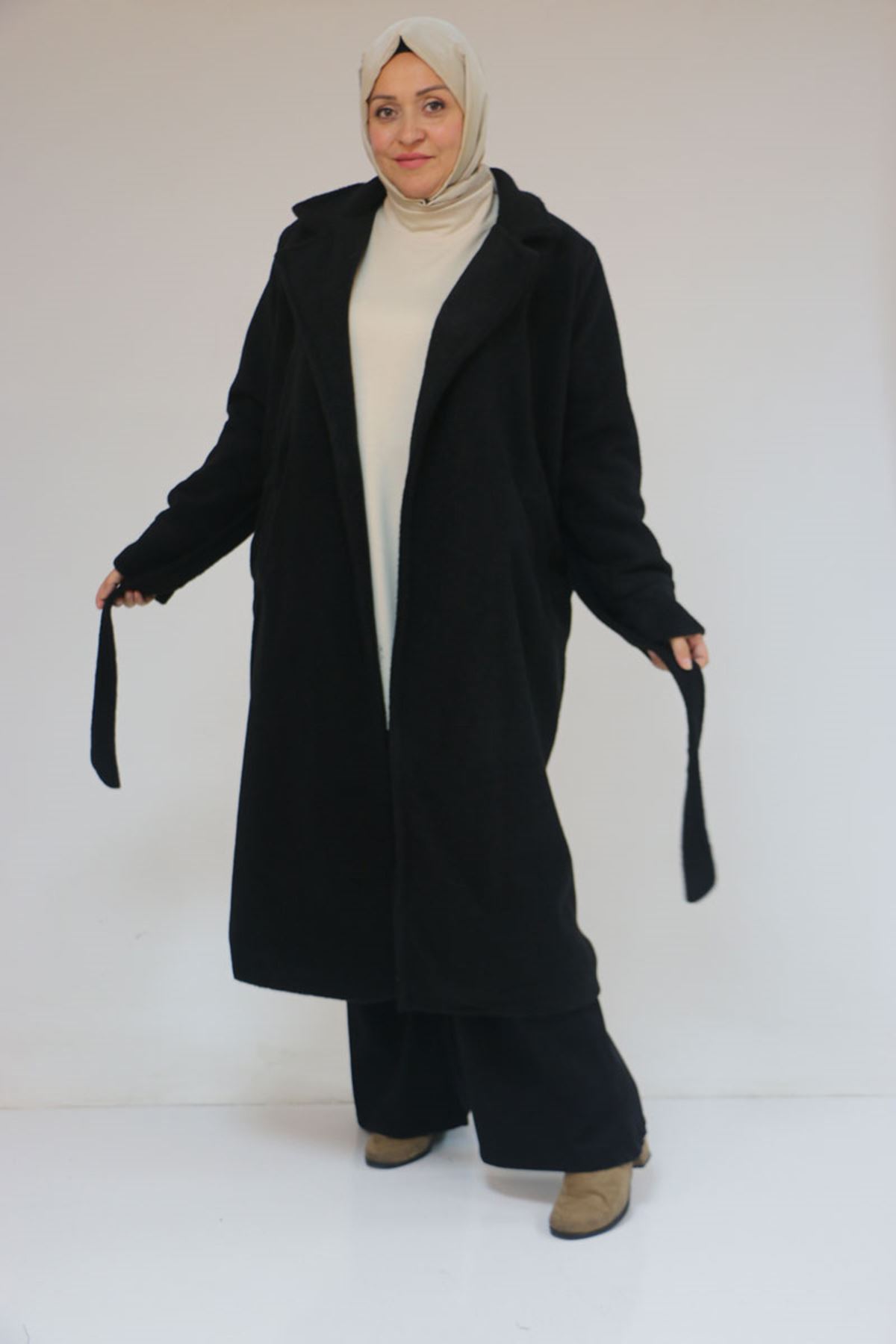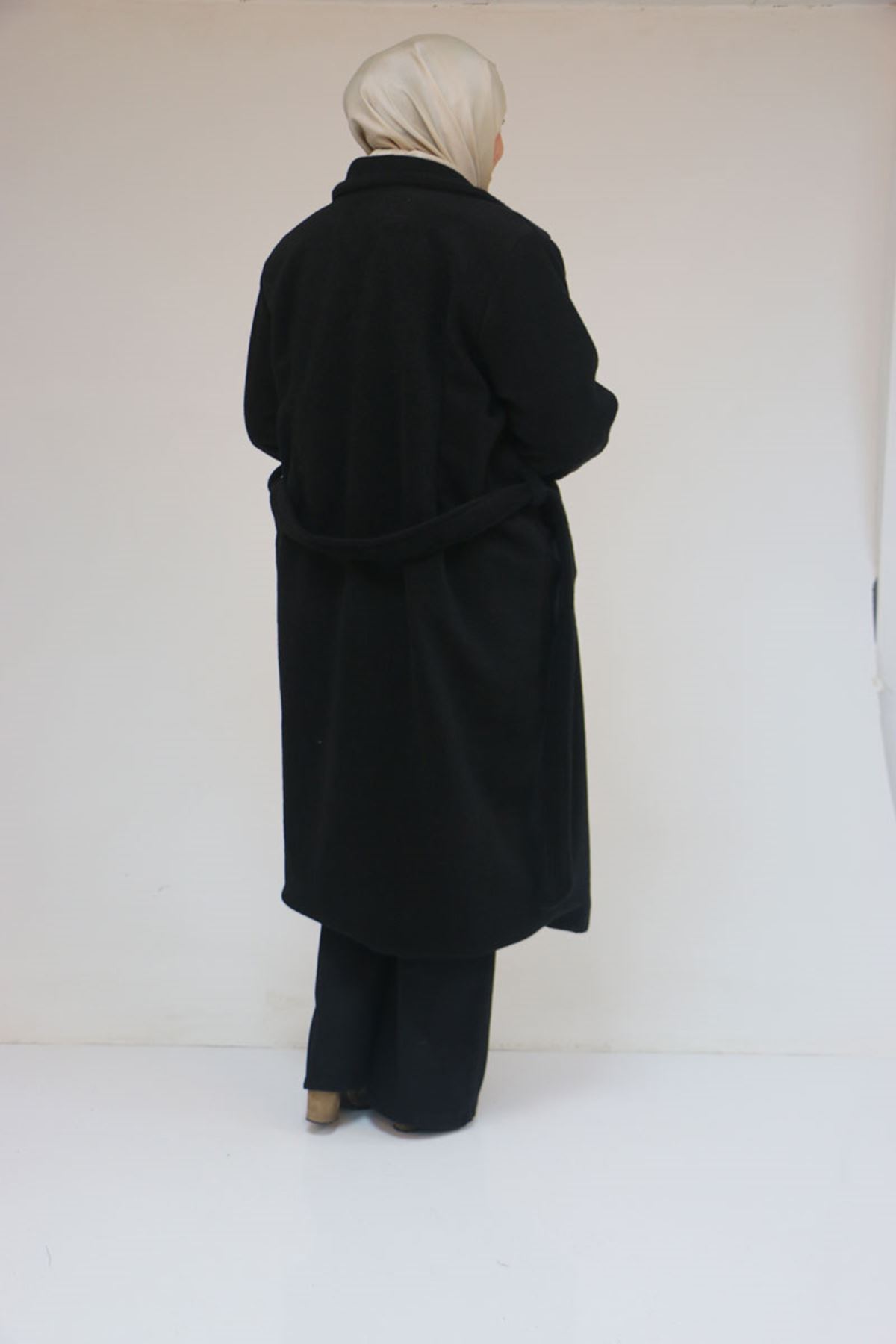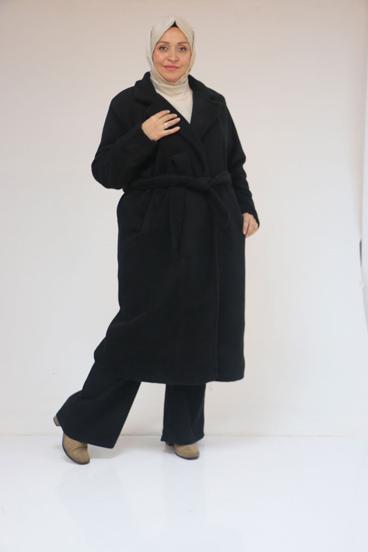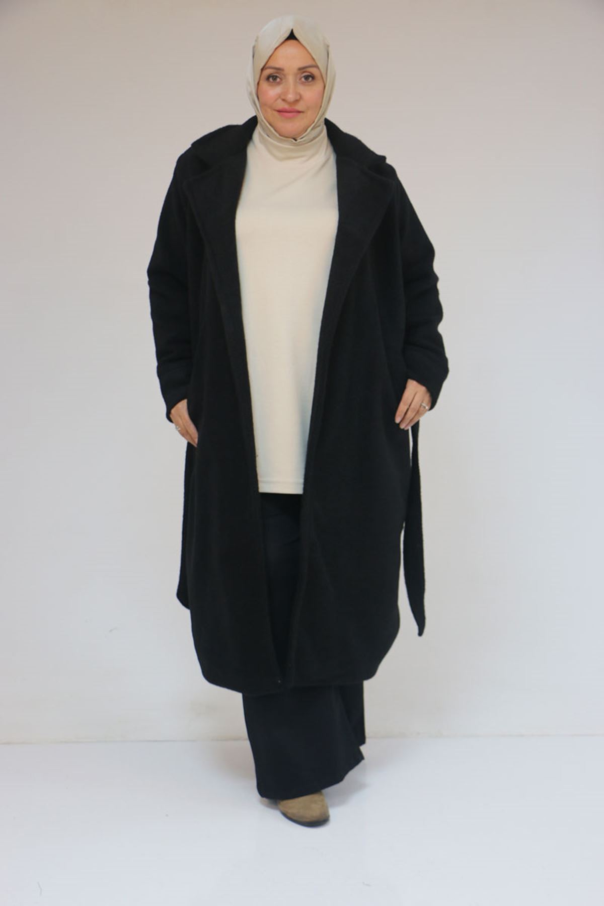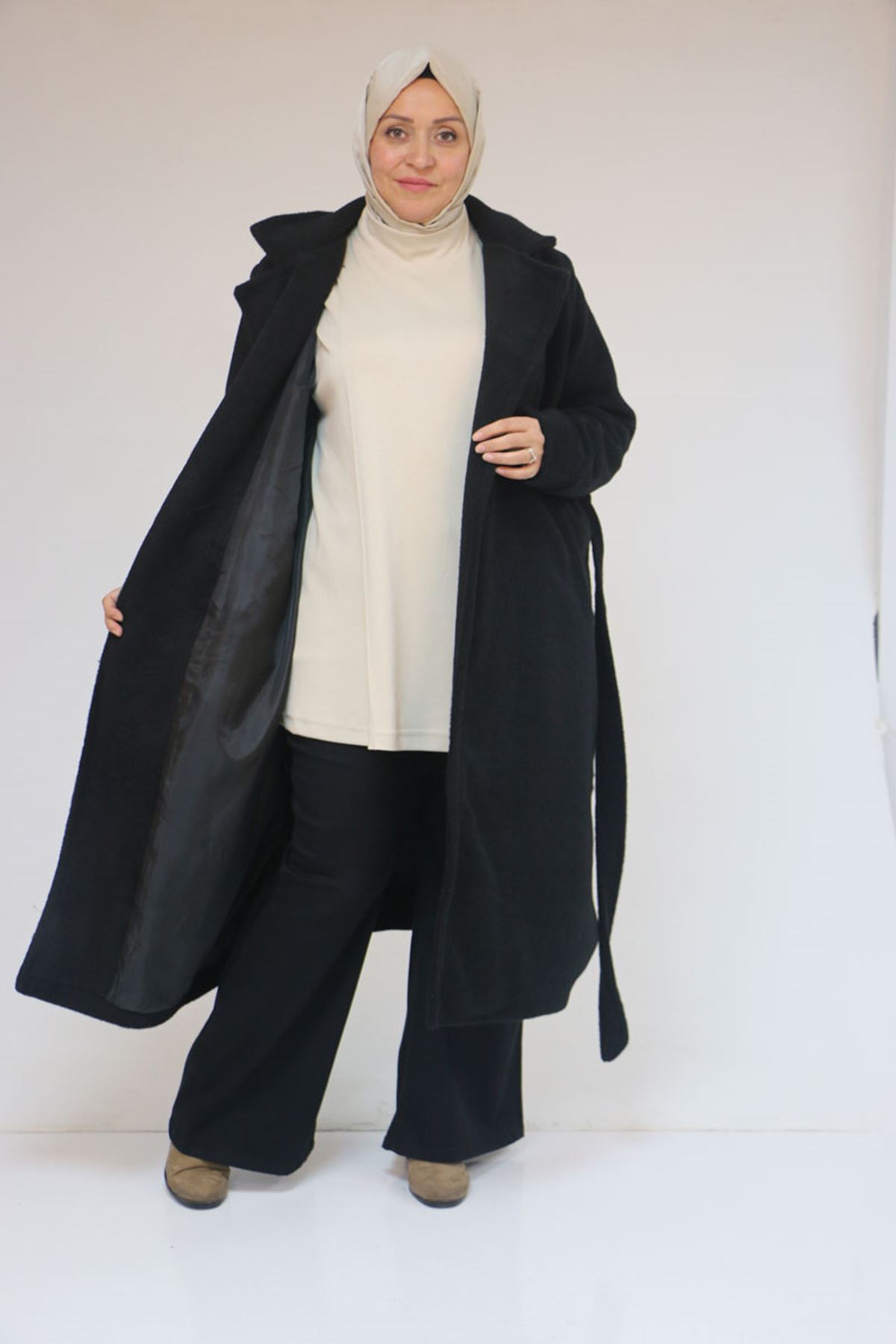 53049-E Büyük Beden Keçe Kalın Manşetli Kaban - Siyah