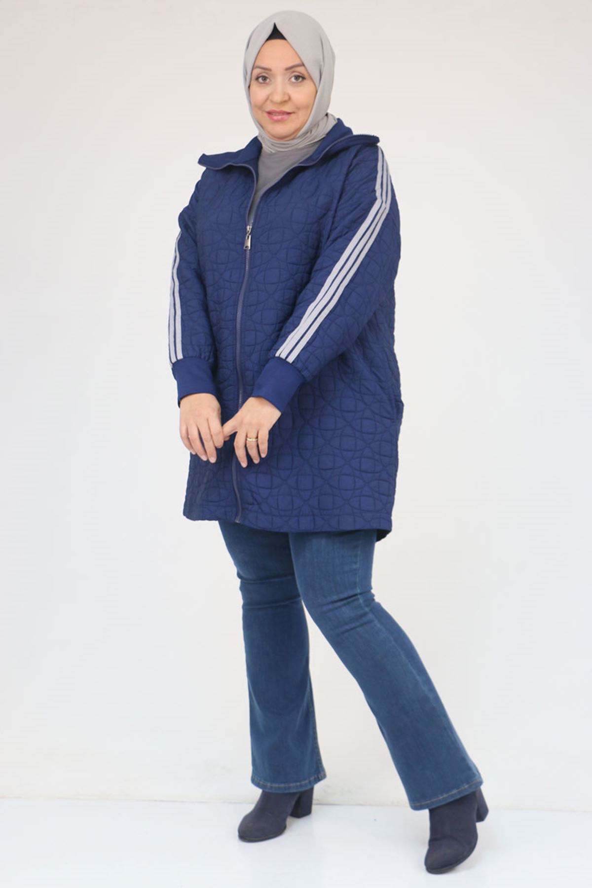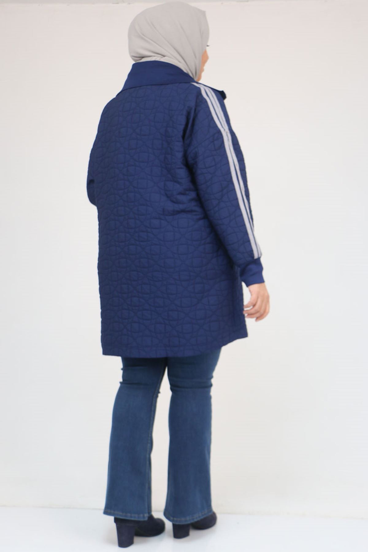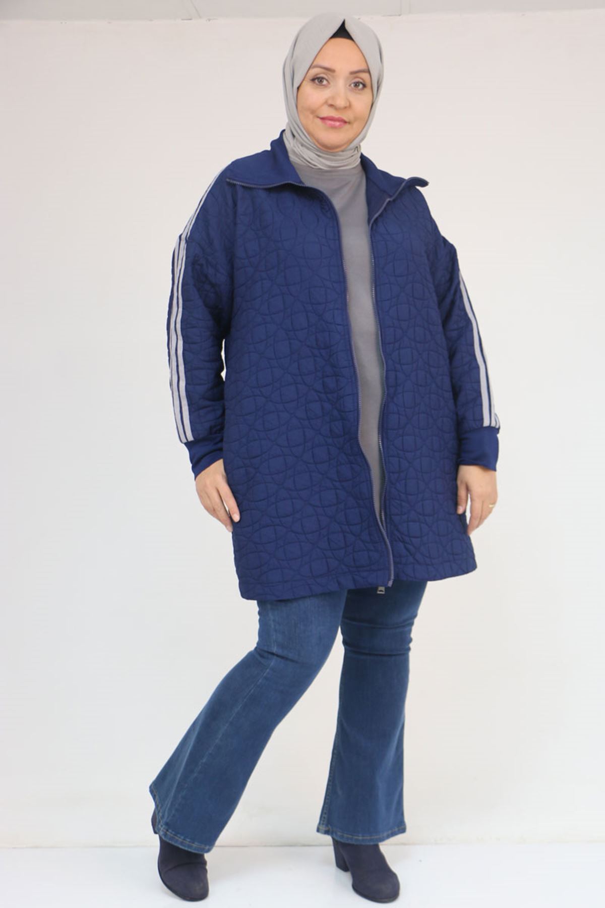 53060 Büyük Beden Omuzdan Şeritli Kapitone Fermuarlı Ceket - İndigo-Gri