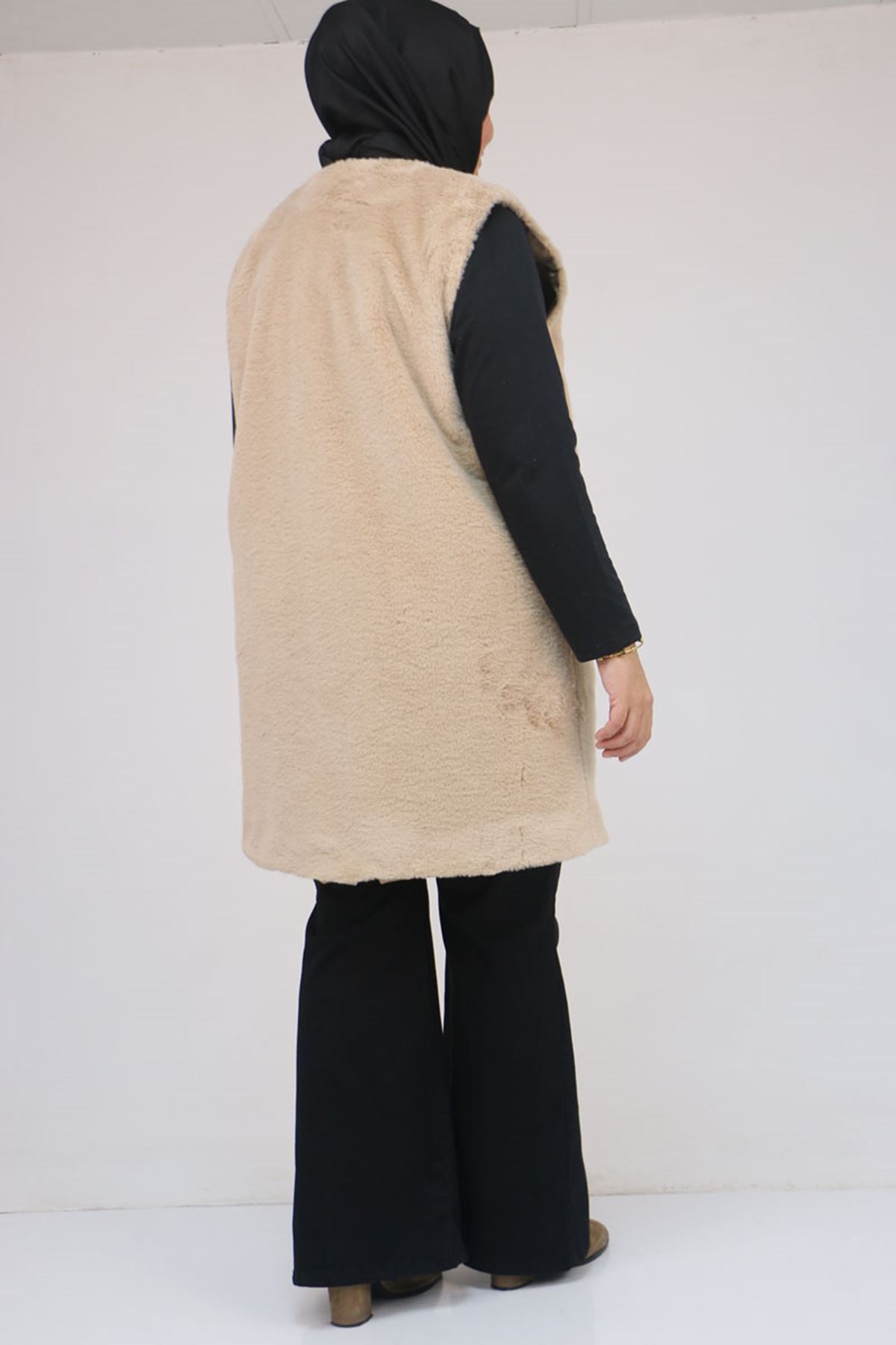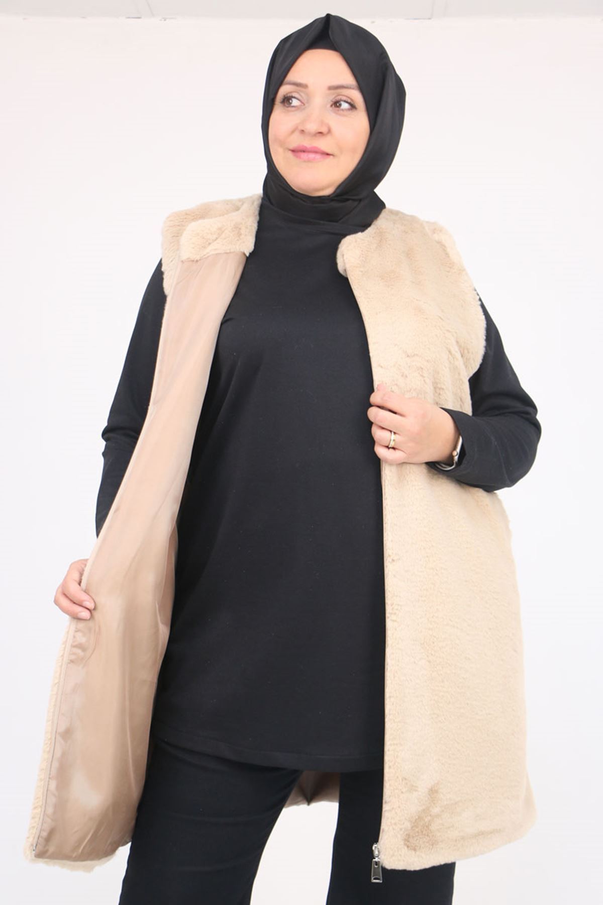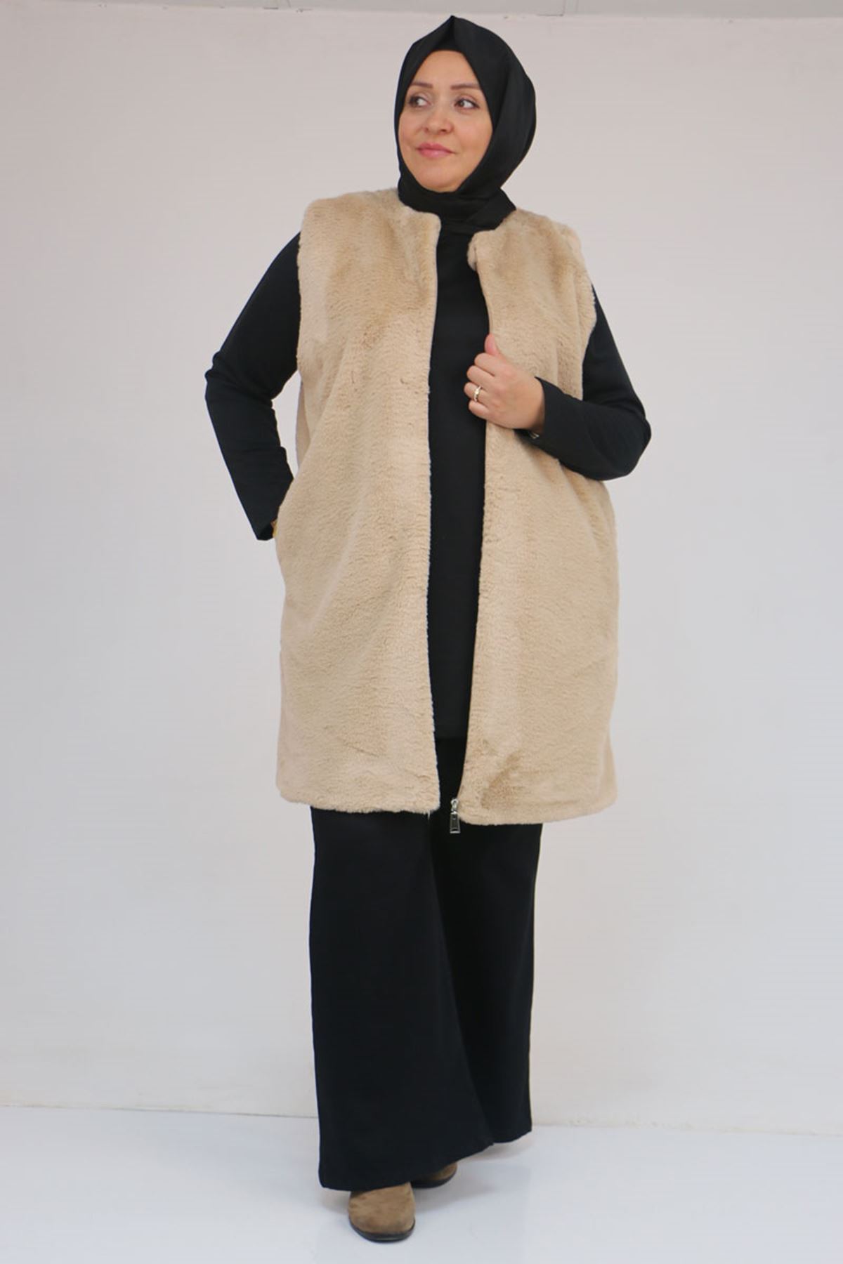 54013 Büyük Beden Cepli Rabbit Astarlı Yelek - Bej