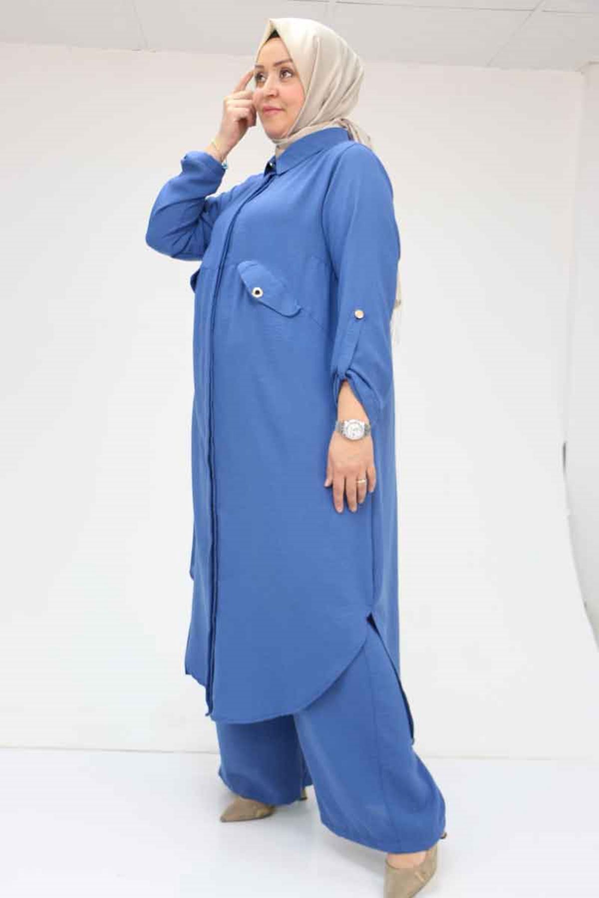 57024 Büyük Beden Erkek Yakalı Önü Patlı Pantolonlu Takım - İndigo