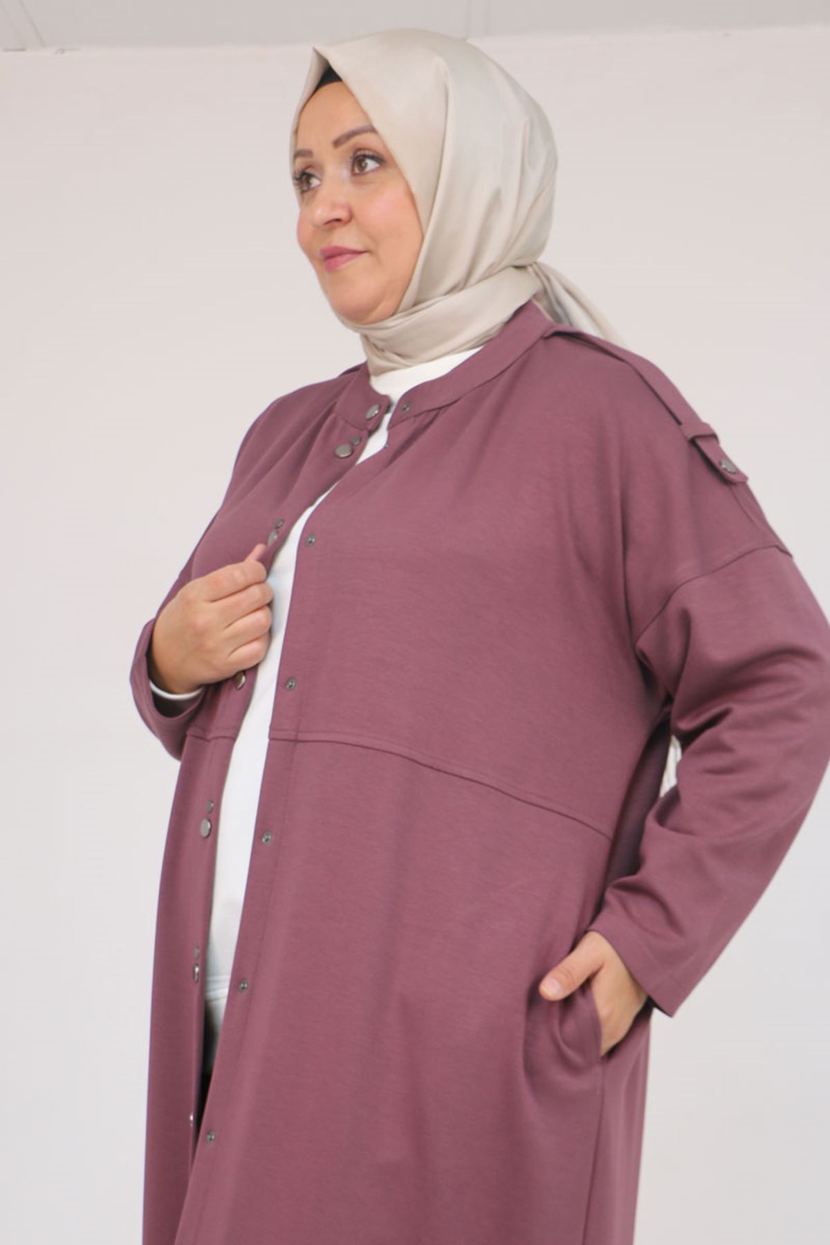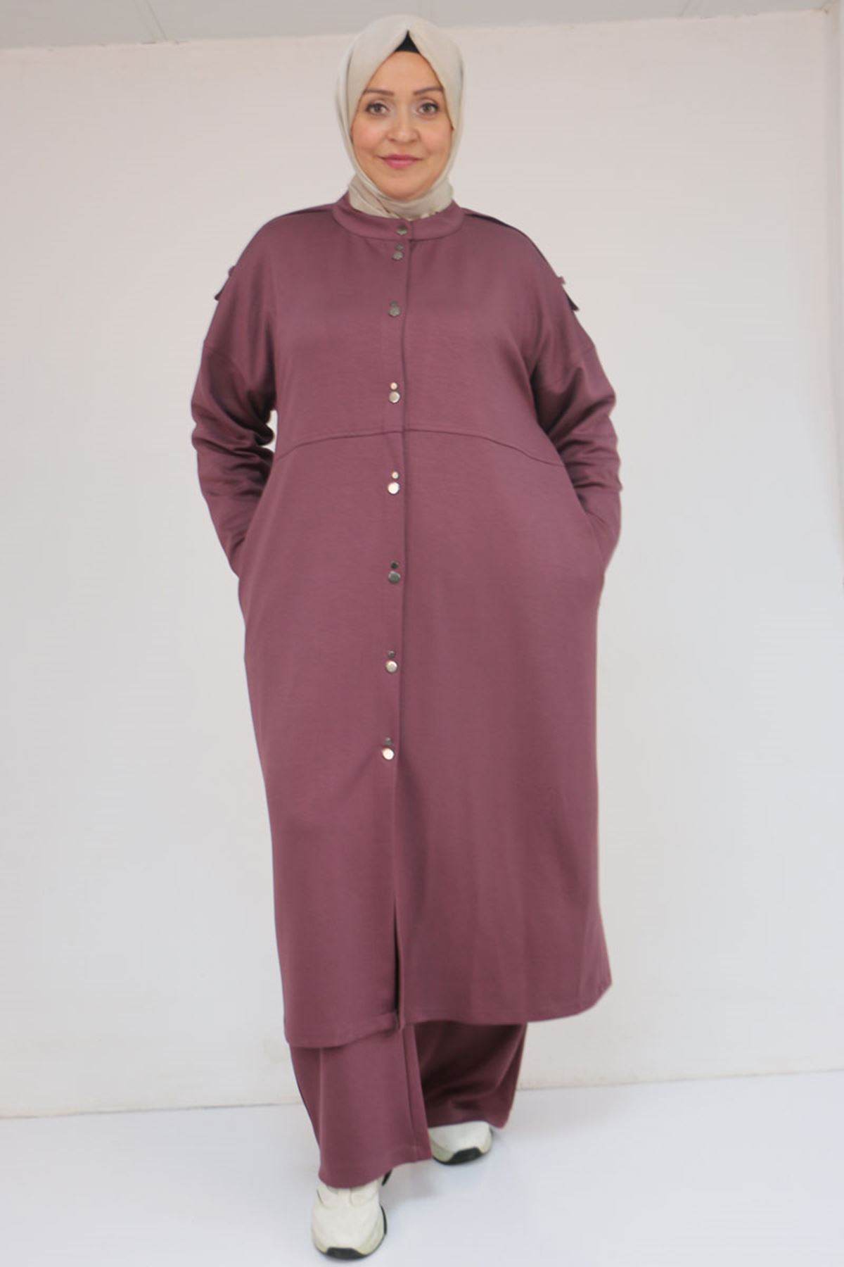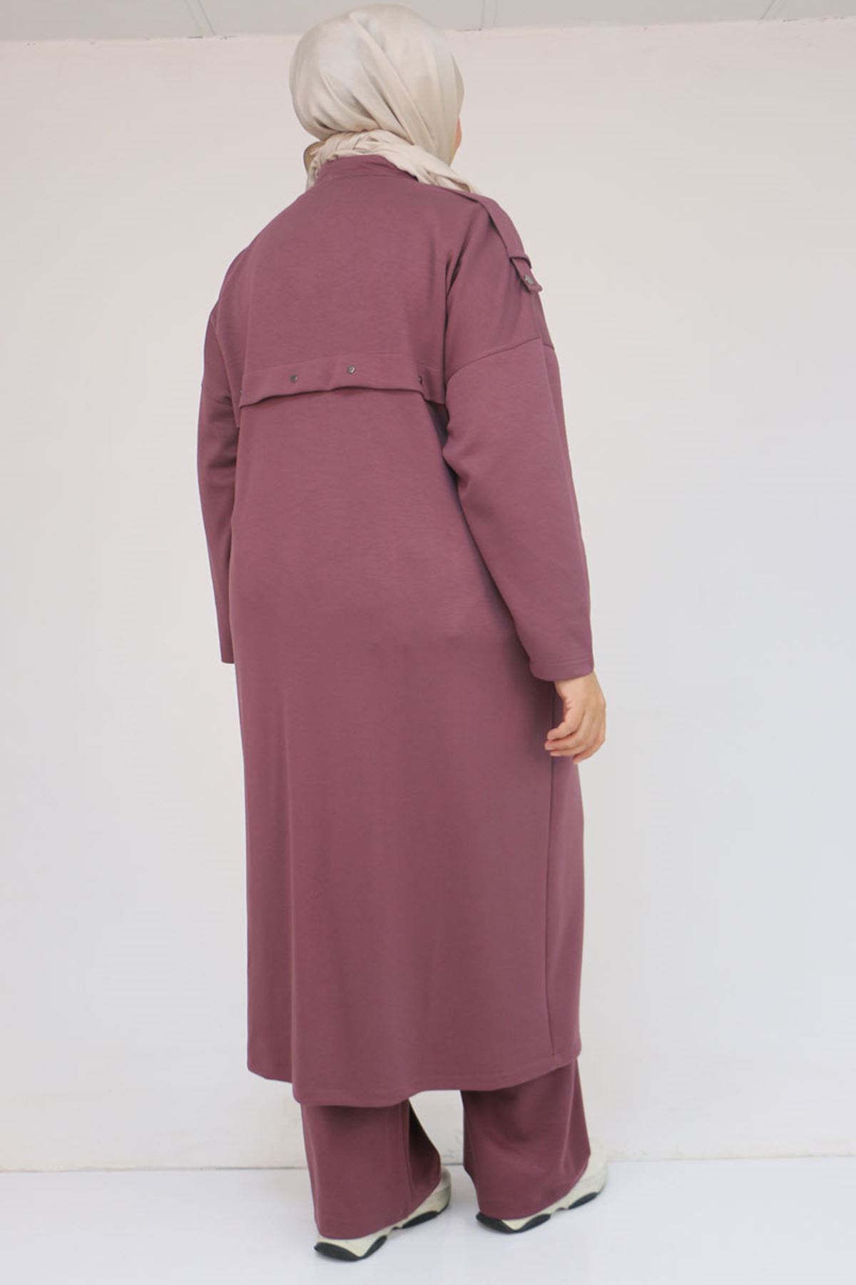 57035 Büyük Beden Omzu Apoletli Çıtçıt Detaylı Modal Takım - Gül Kurusu