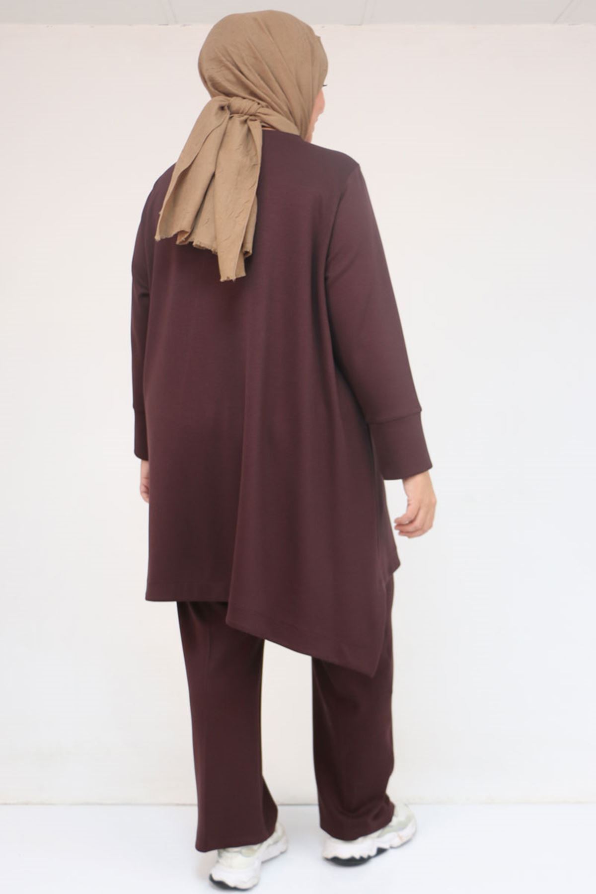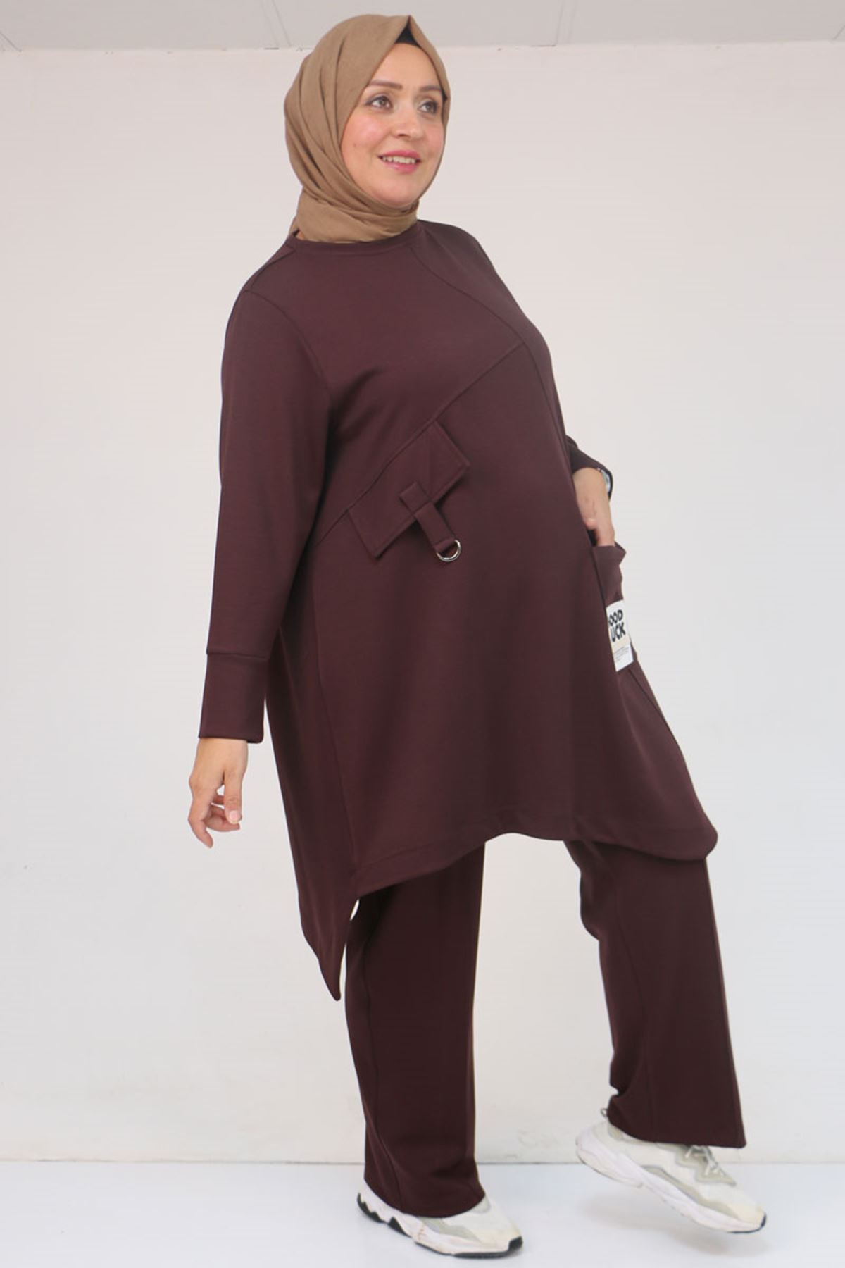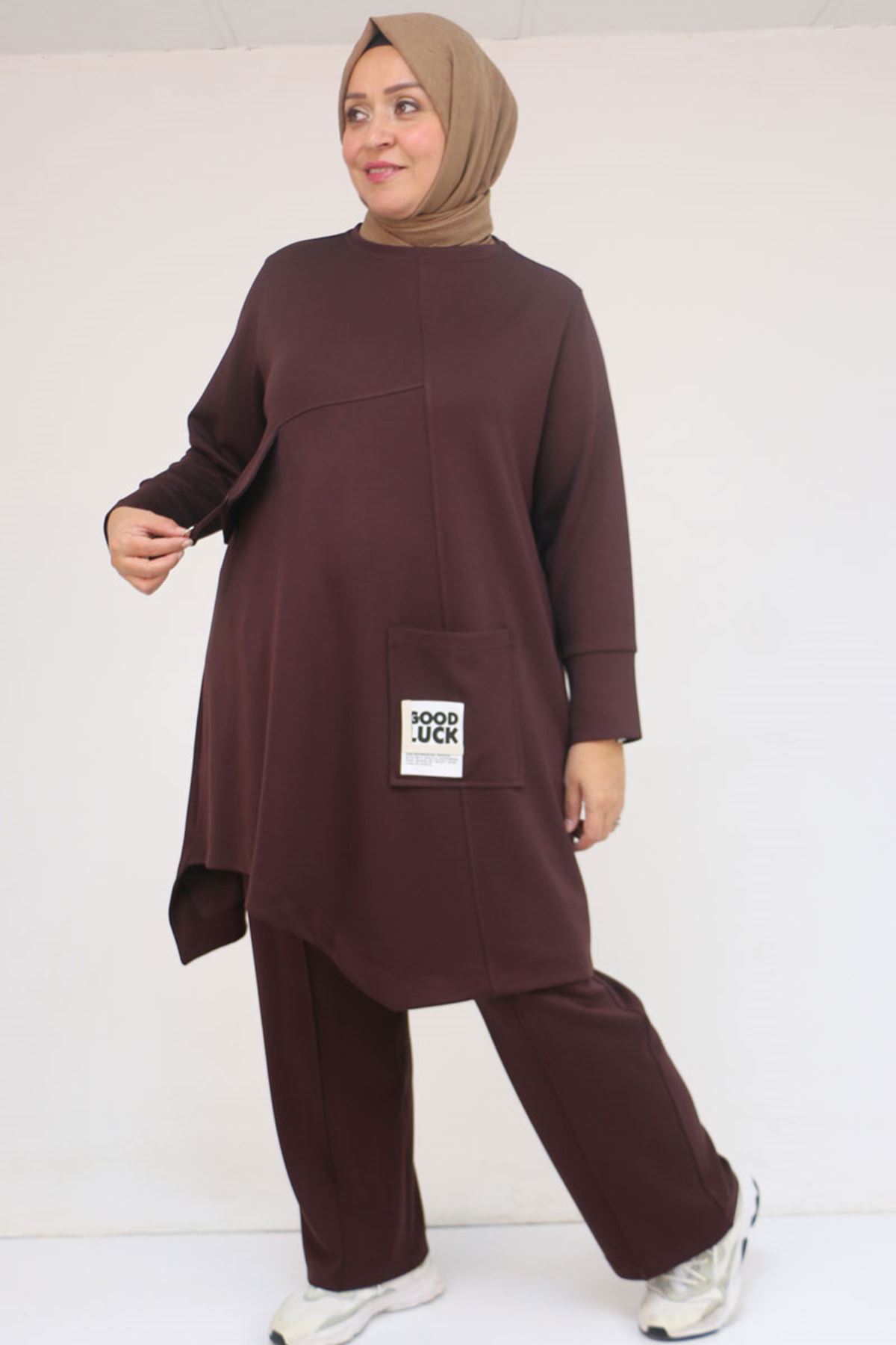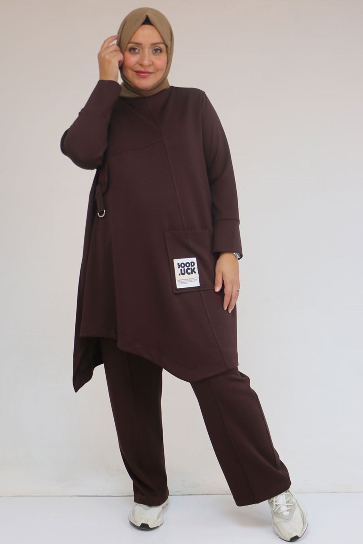 57041 Büyük Beden Cepte Arma Detaylı Modal Pantolonlu Takım - Kahve