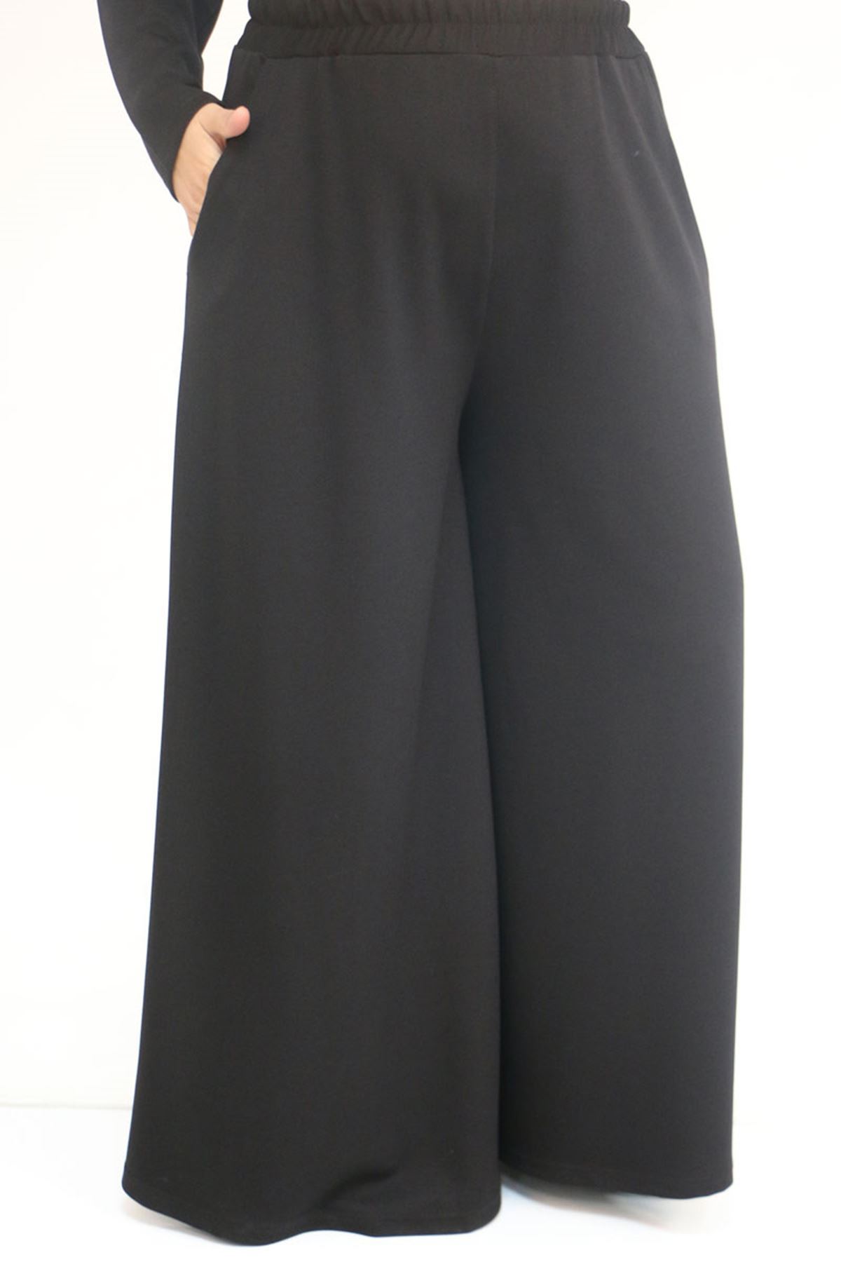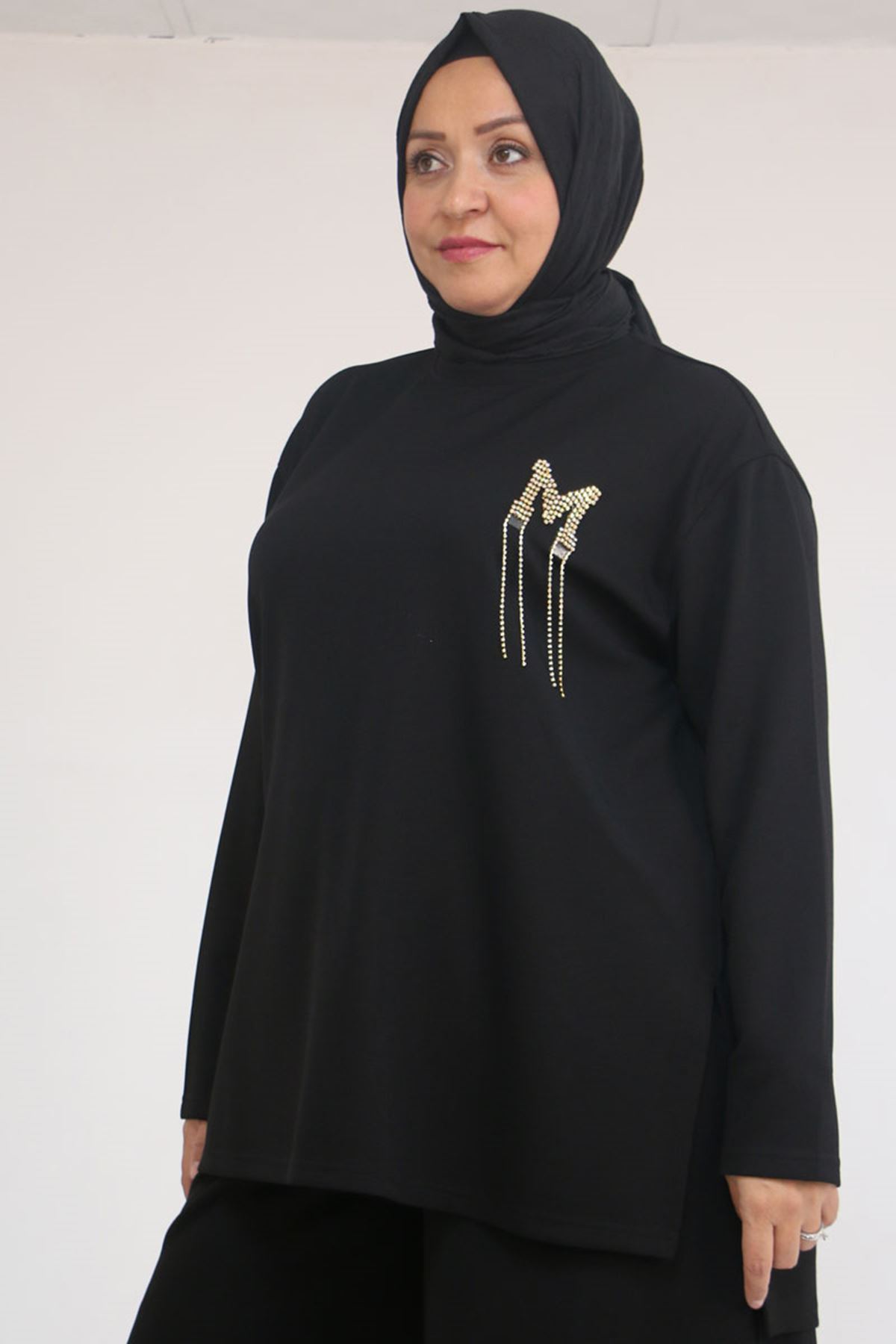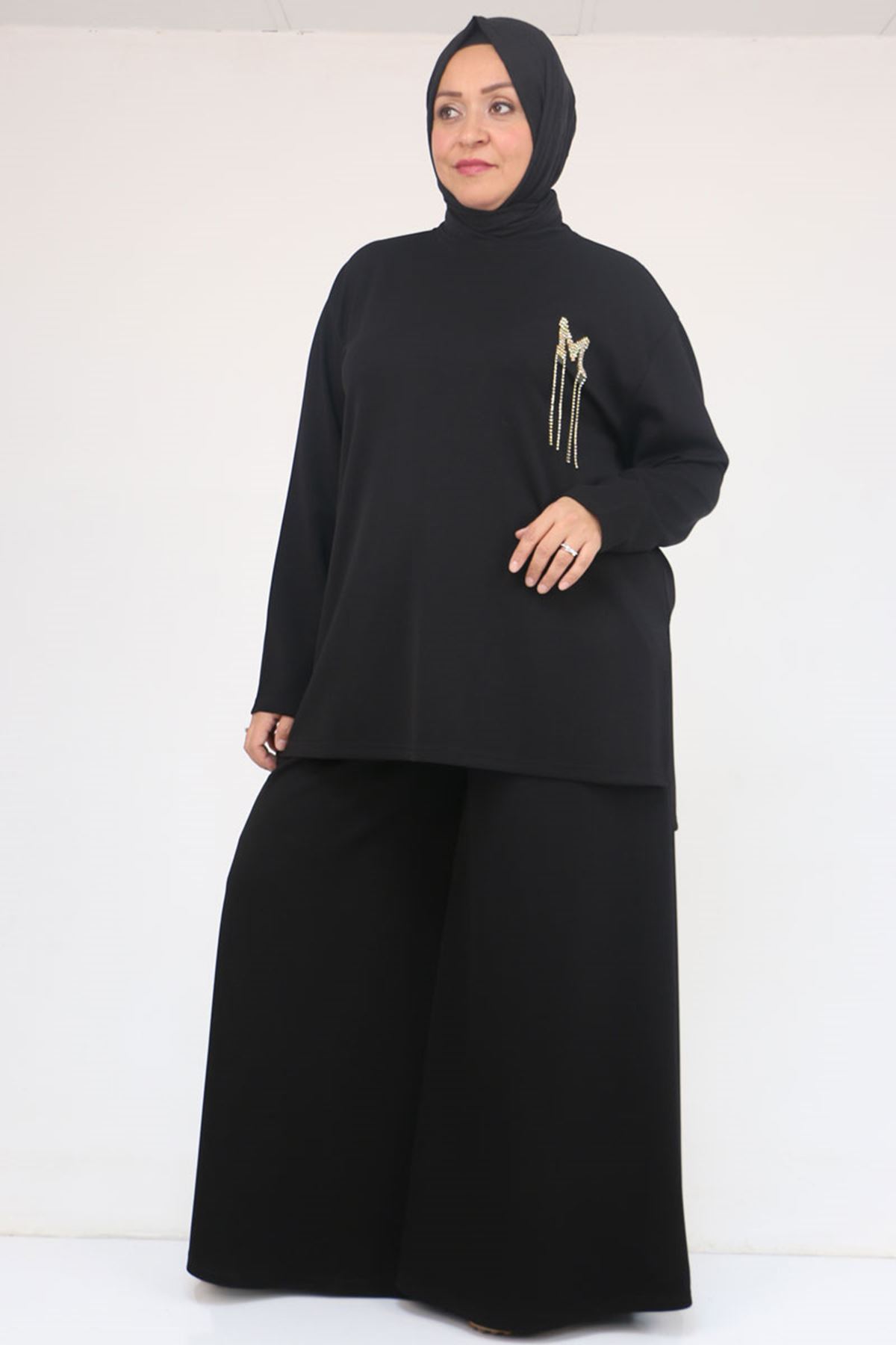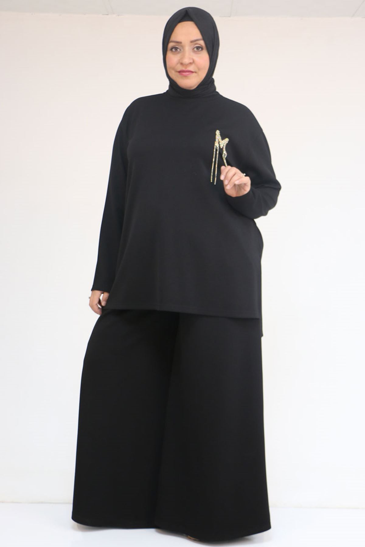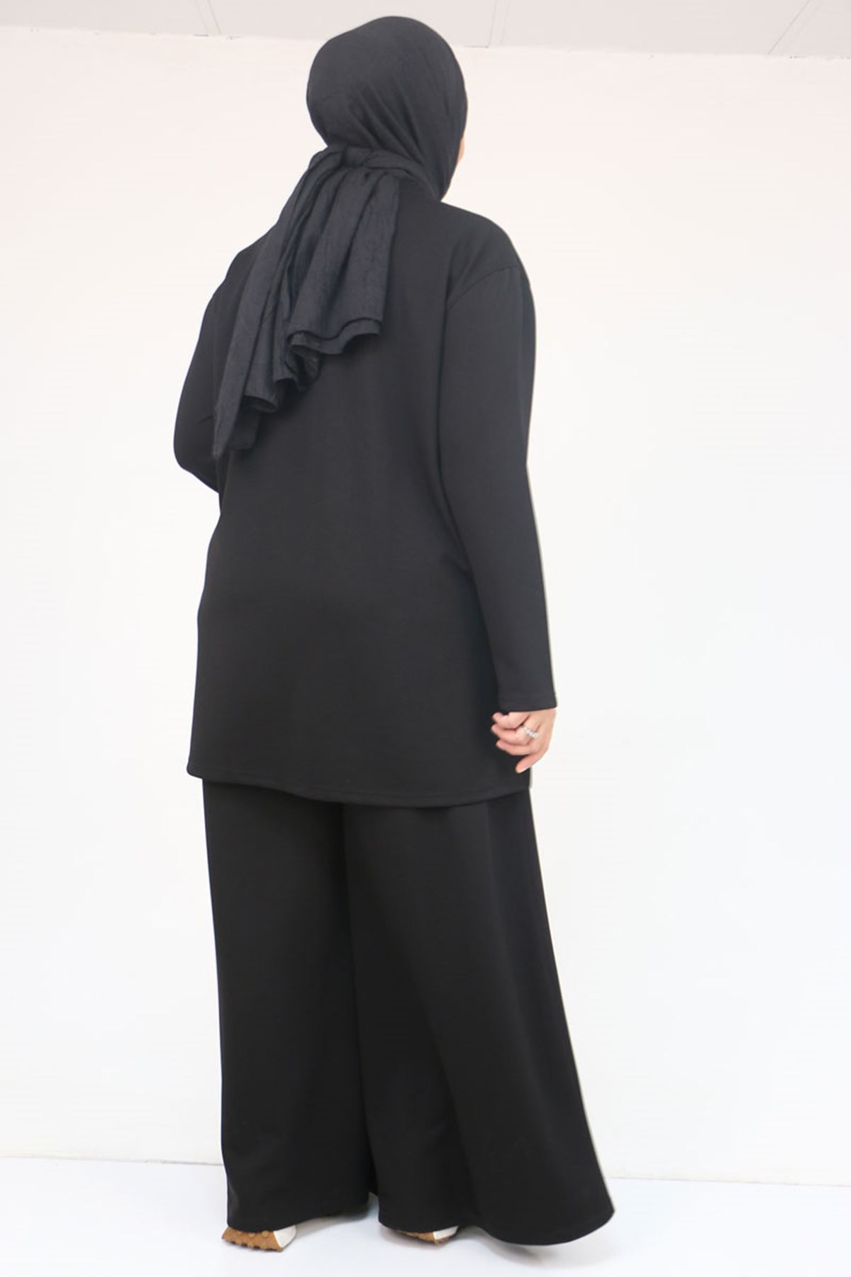 57043 Büyük Beden Yanı Yırtmaçlı Modal Pantolonlu Takım - Siyah