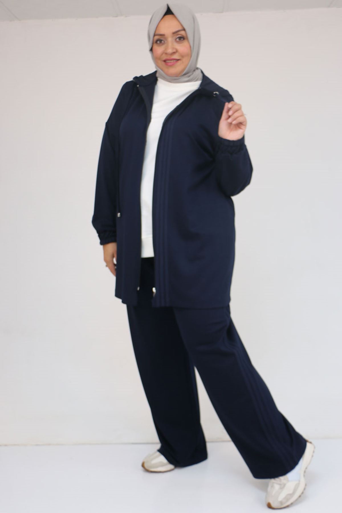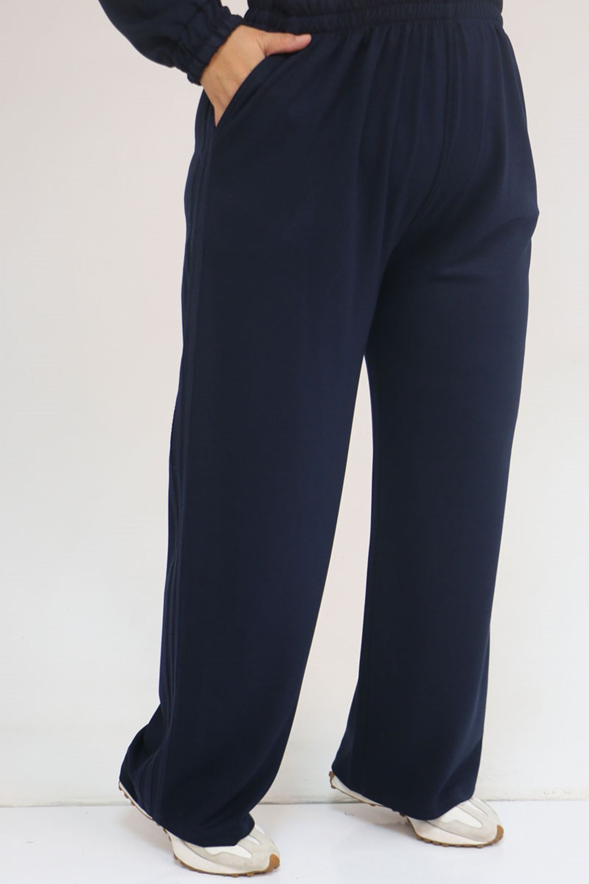 57056 Büyük Beden Renge Renk Garnili Modal Pantolonlu Takım - Lacivert