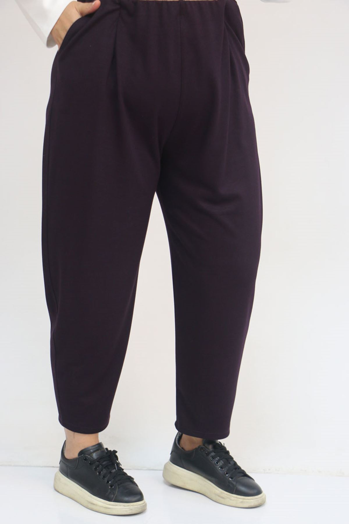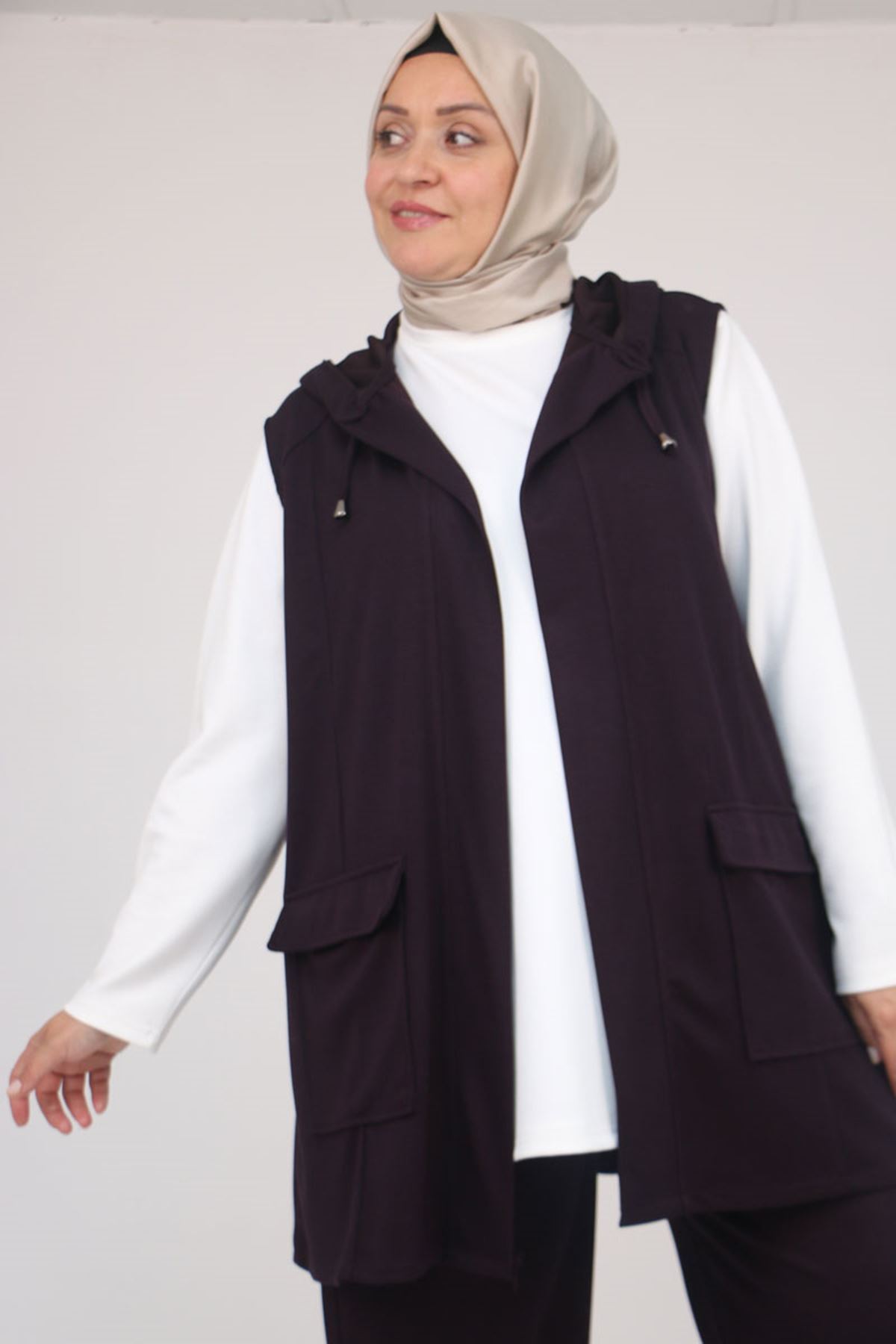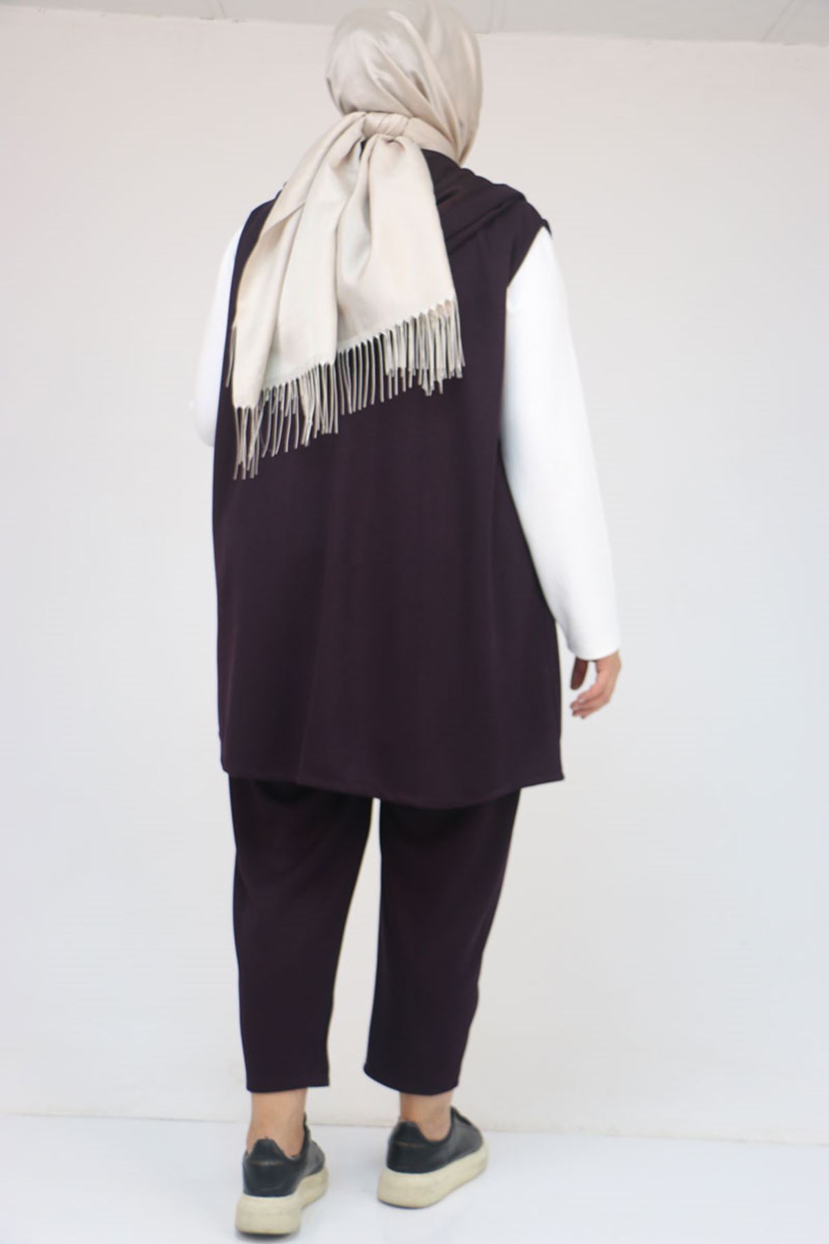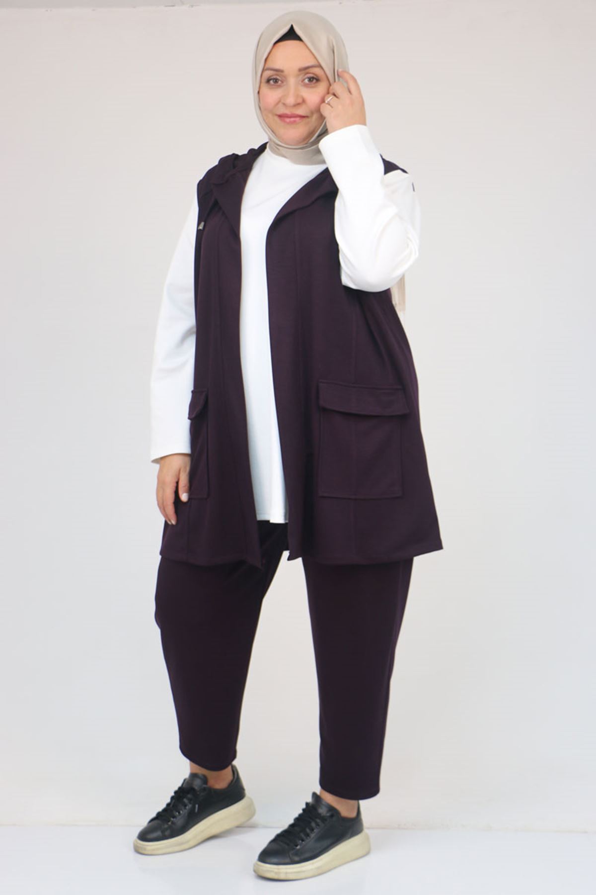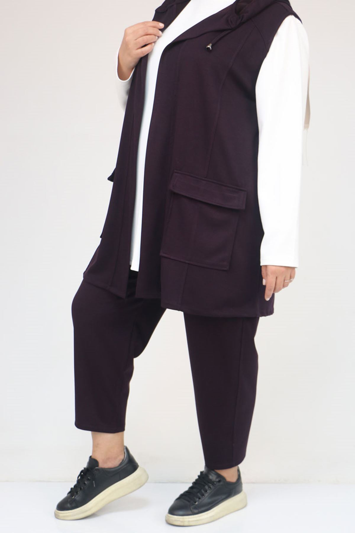57305 Büyük Beden Modal Yeleği Cepli Üçlü Takım - Mürdüm