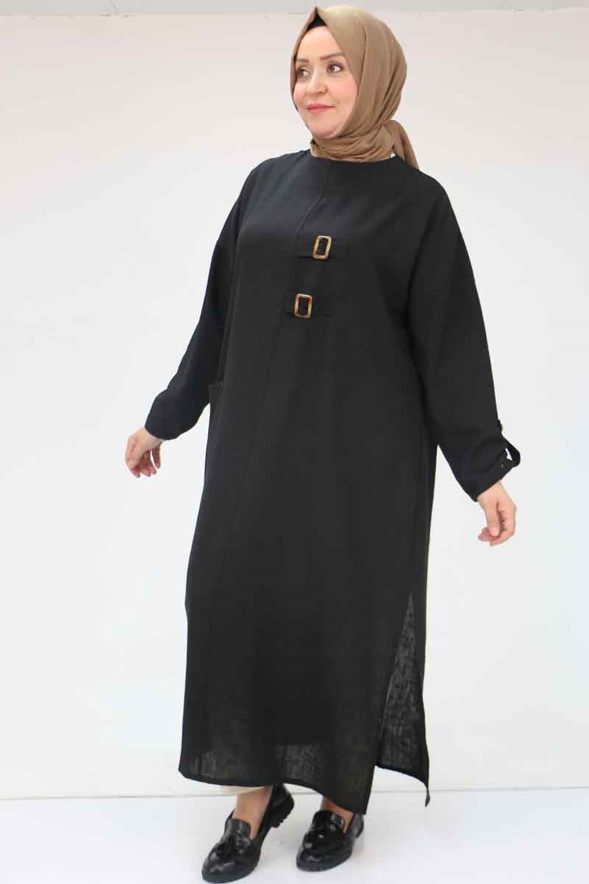 58014-E Büyük Beden Toka Detaylı Keten Tunik - Siyah