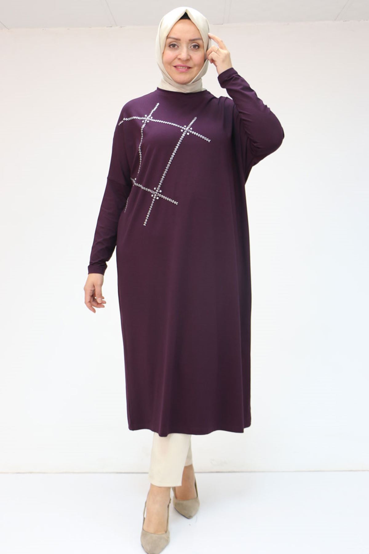 58020-E Büyük Beden Önü Taş Baskılı Penye Tunik - Mor