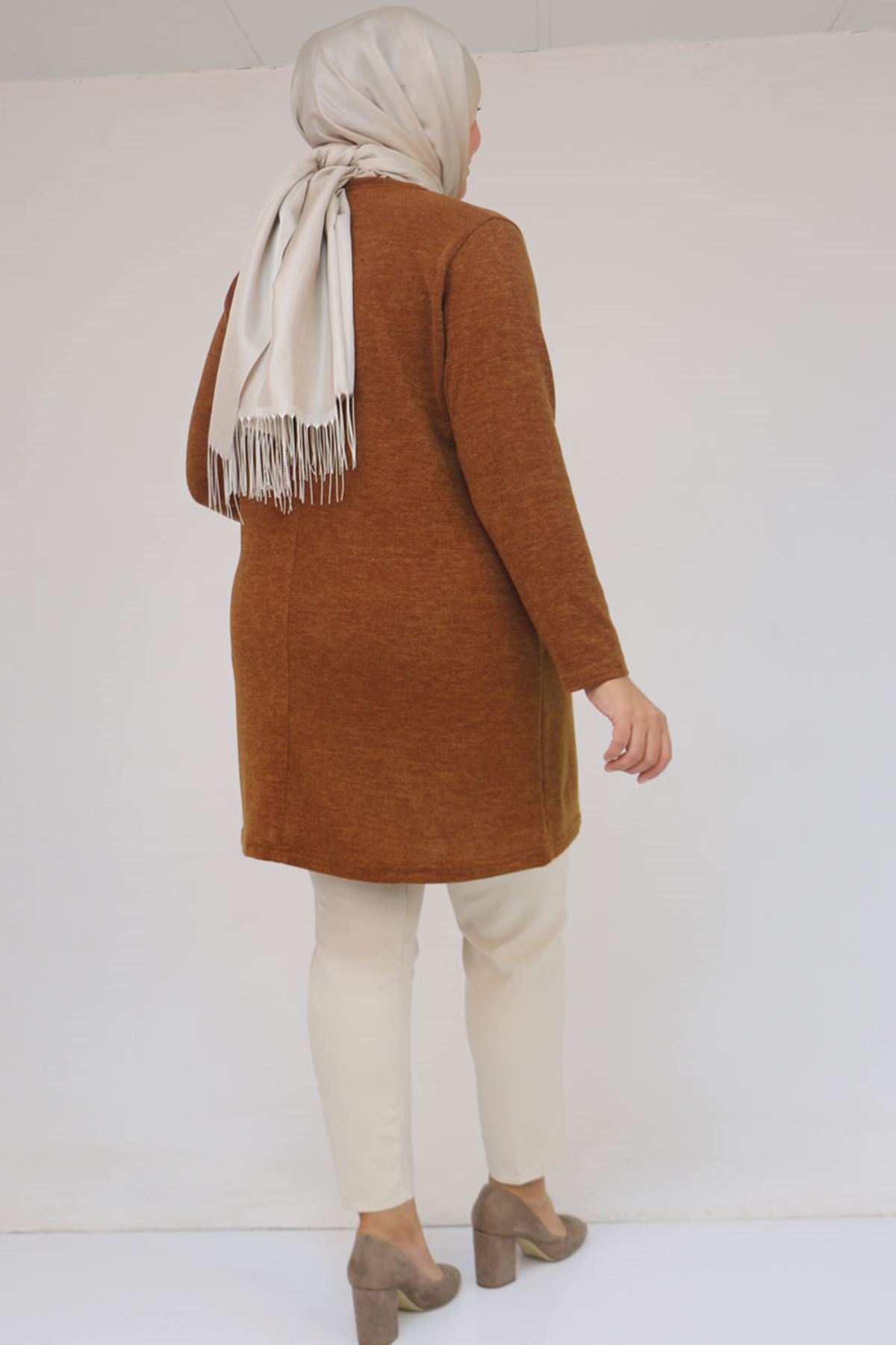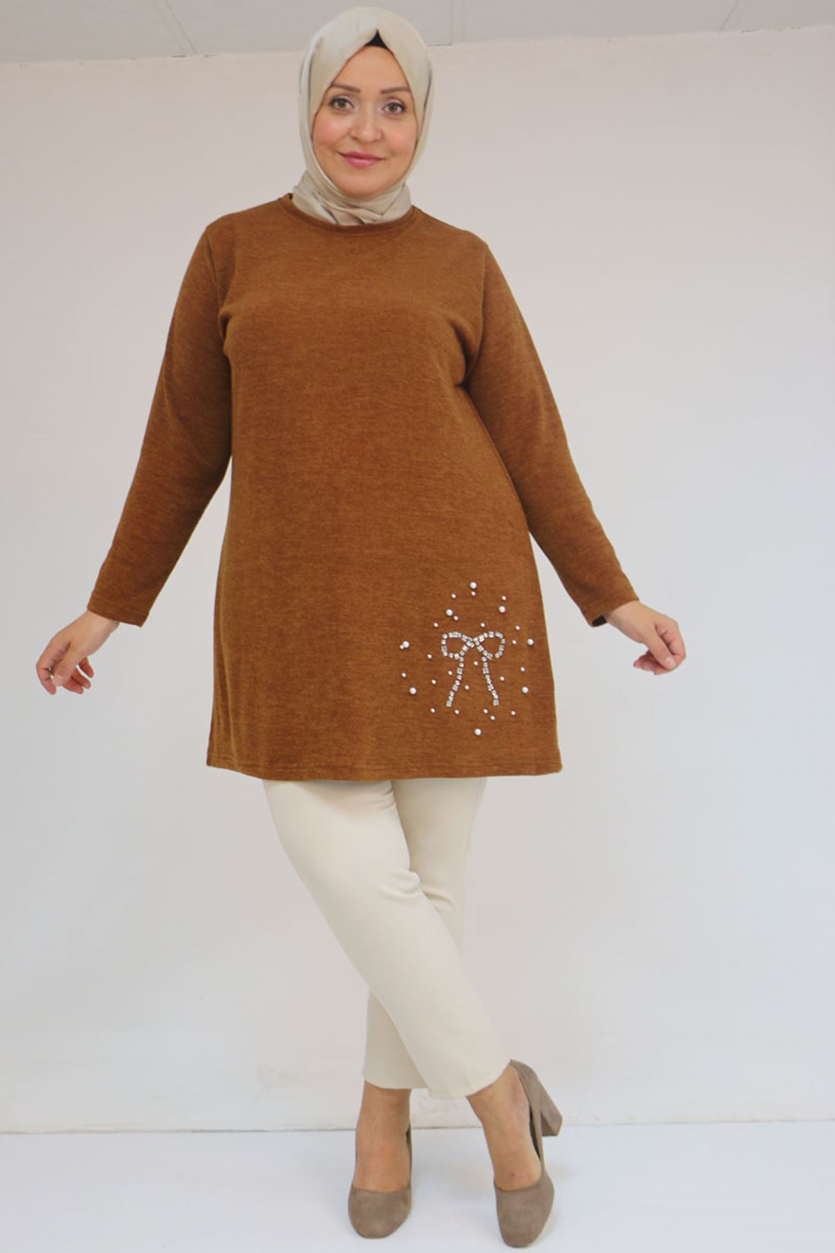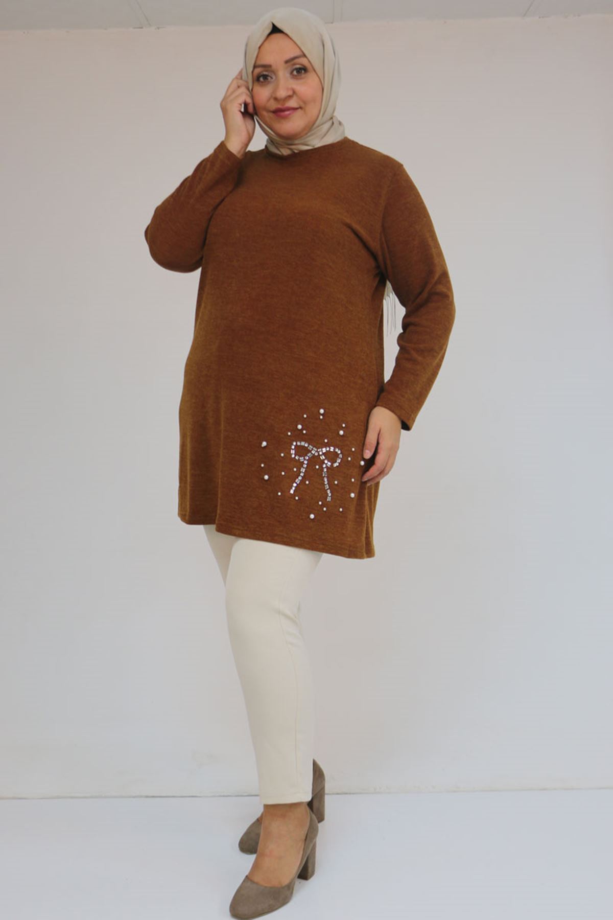 58111 Büyük Beden Önü Taş Detaylı Mir Tunik - Taba