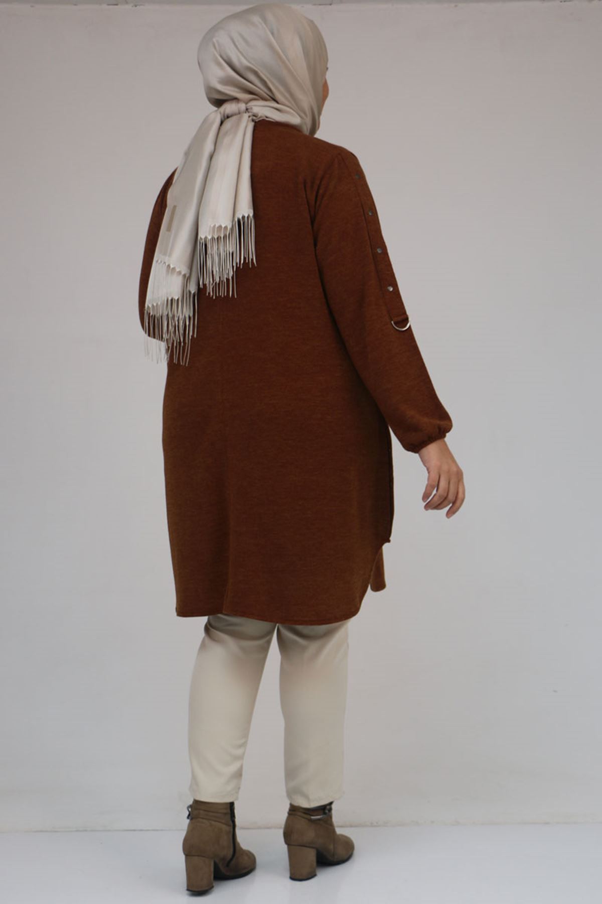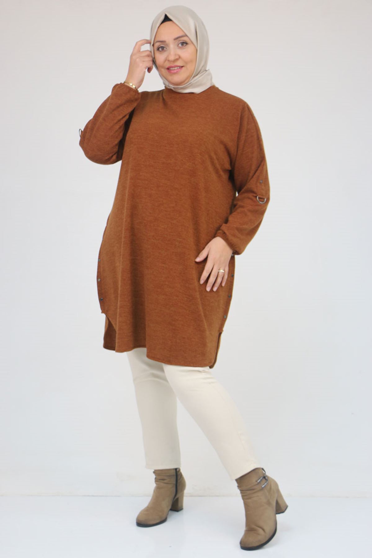 58131 Büyük Beden Kol Ve Etek Uçları Perçinli Mir Tunik - Taba