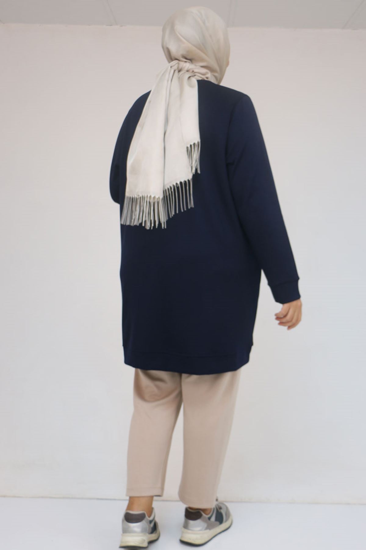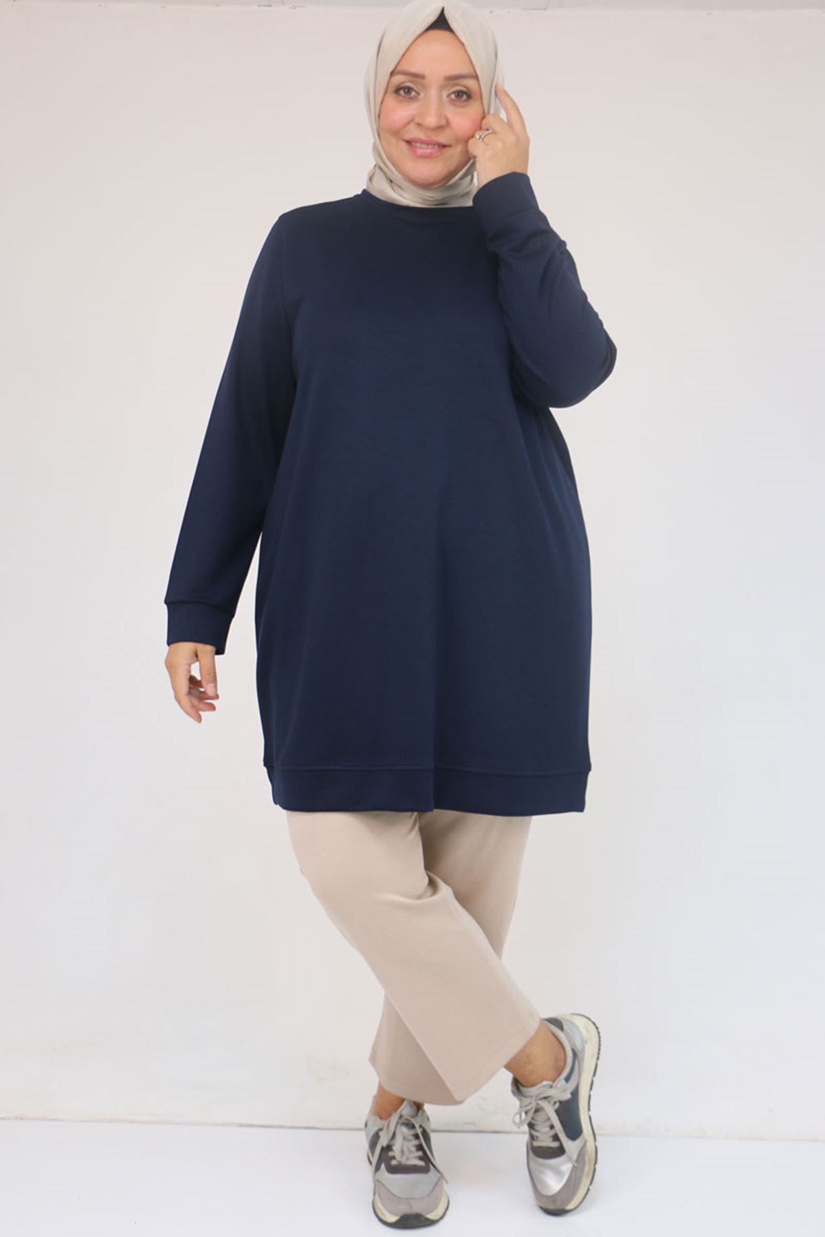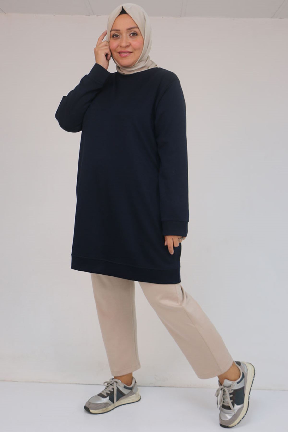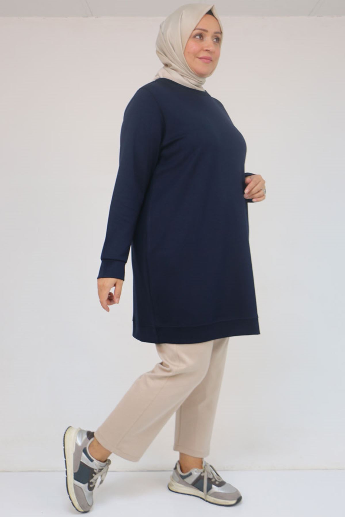 58142 Büyük Beden Kolları Manşetli Modal Tunik - Lacivert