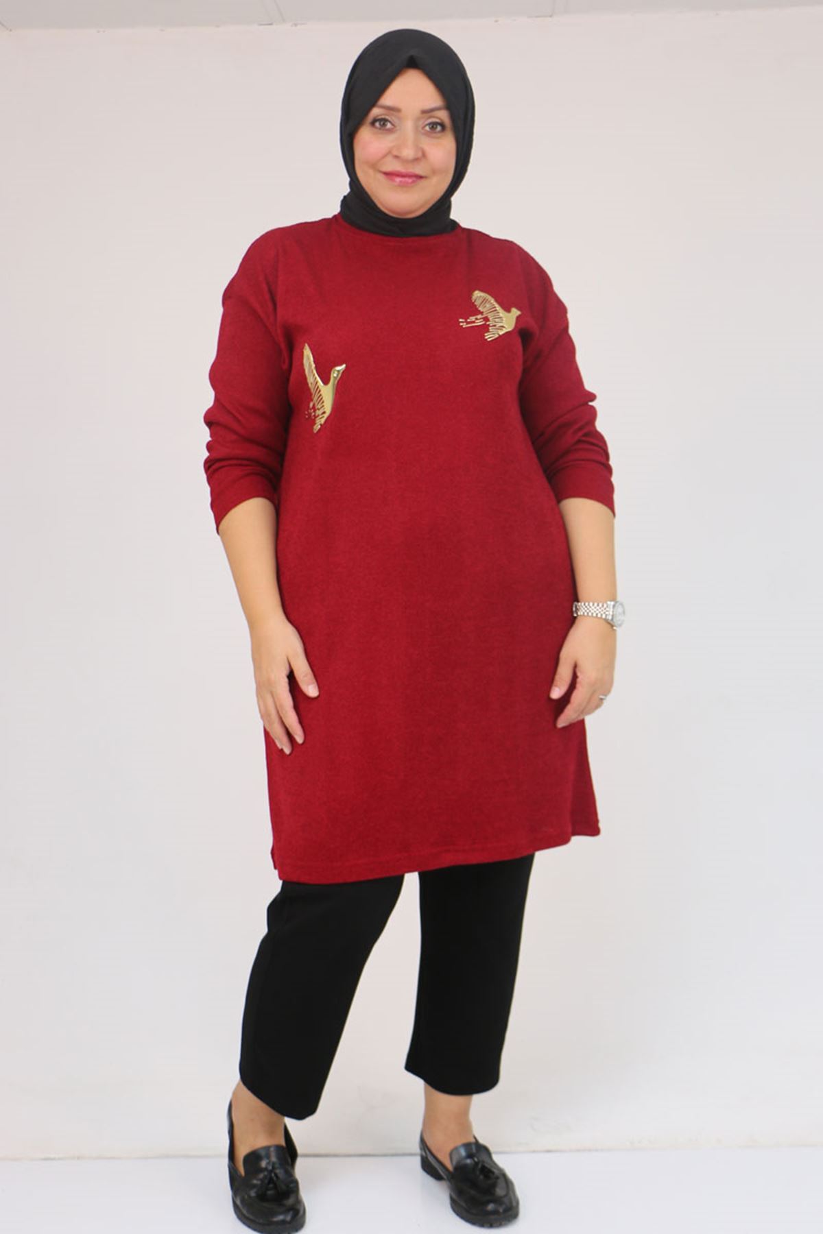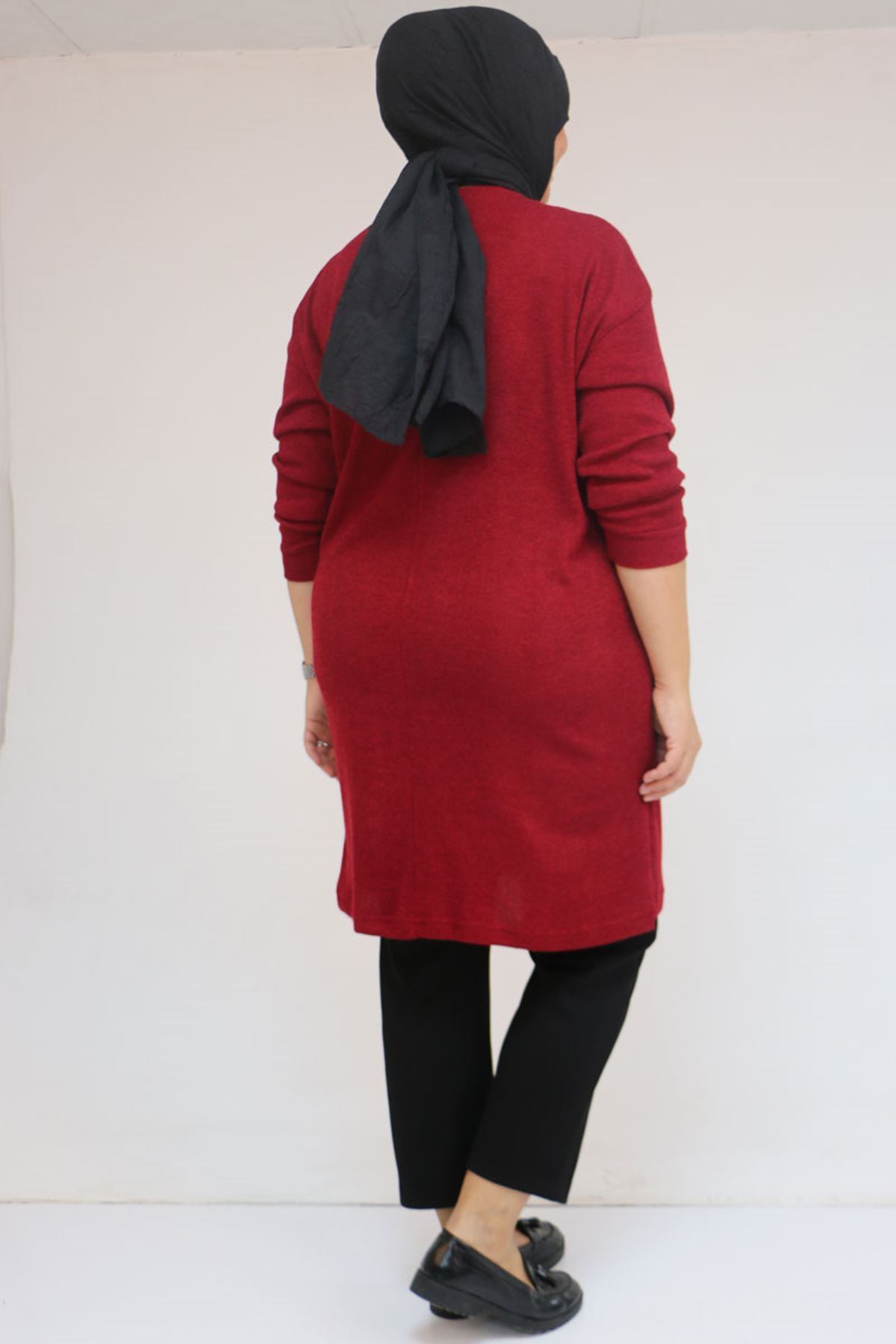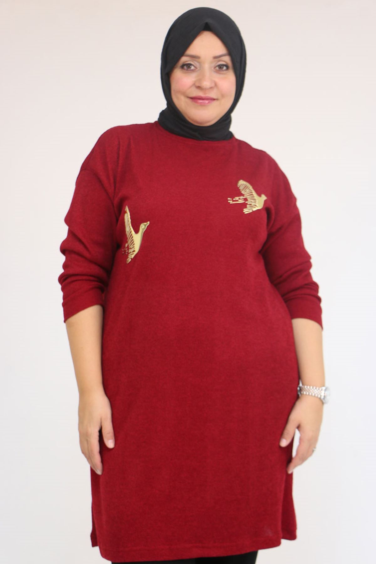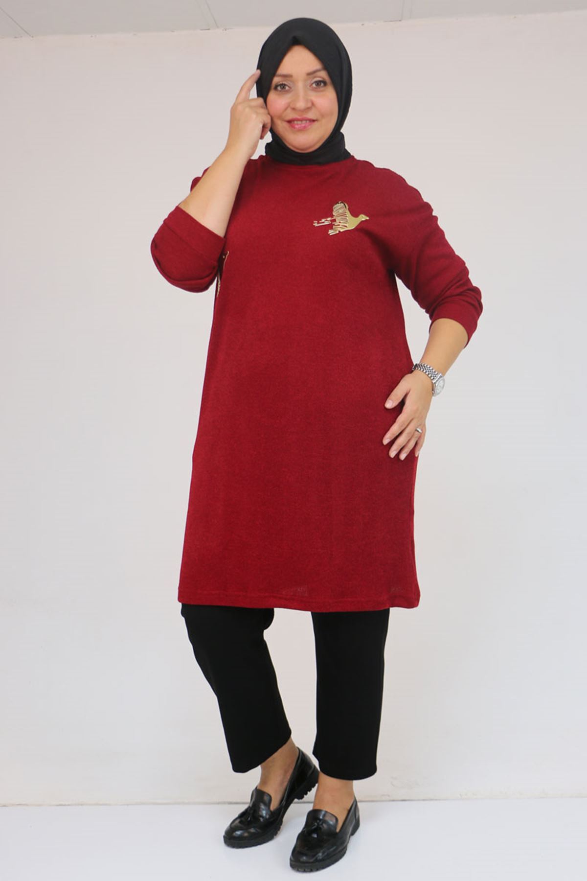 58143 Büyük Beden Düşük Kollu Aksesuar Detaylı Mir Tunik - Bordo