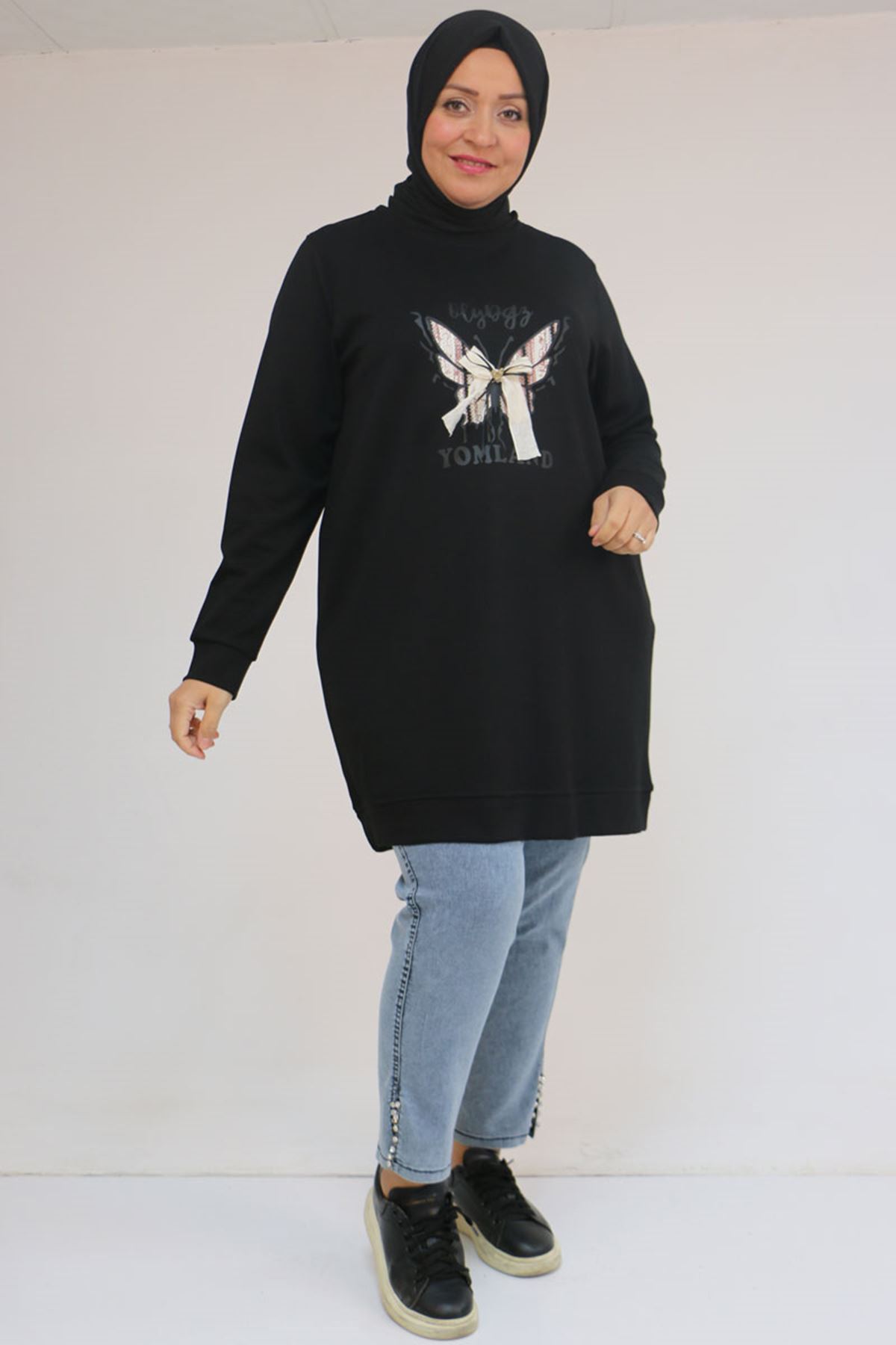 58145 Büyük Beden Kelebek Baskılı Modal Tunik - Siyah