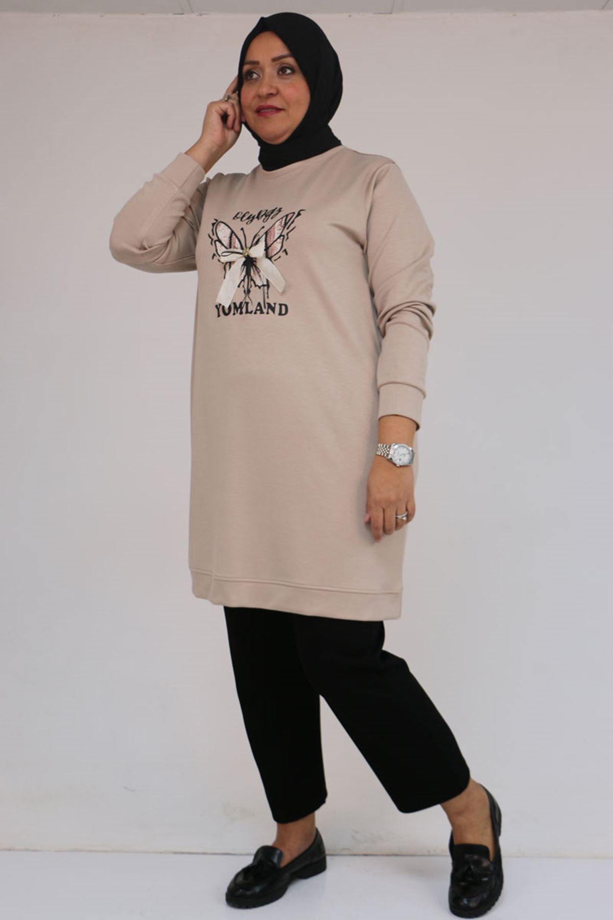58145 Büyük Beden Kelebek Baskılı Modal Tunik - Vizon