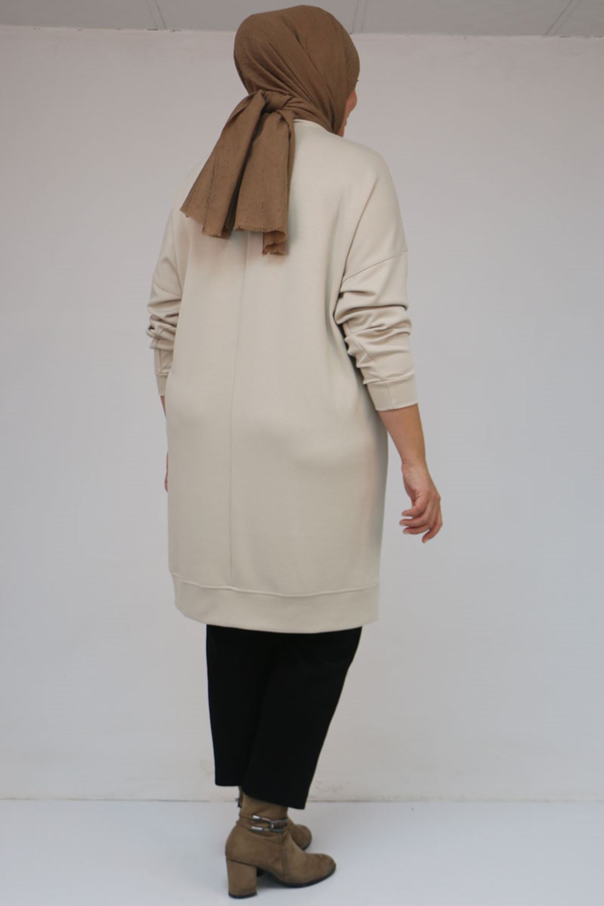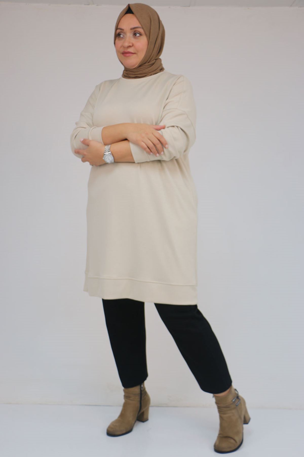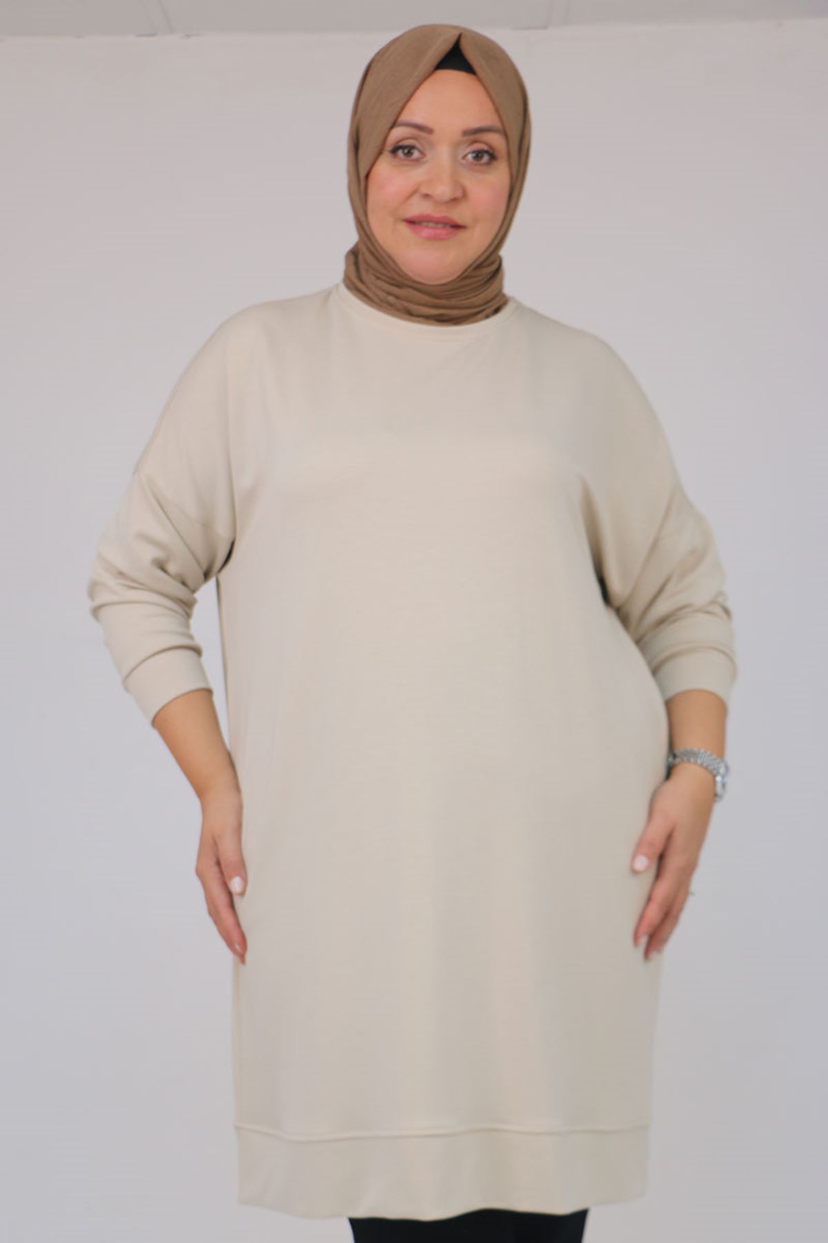 58151 Büyük Beden Kol Ve Etek Ucu Kendinden Ribanalı Modal Tunik - Bej