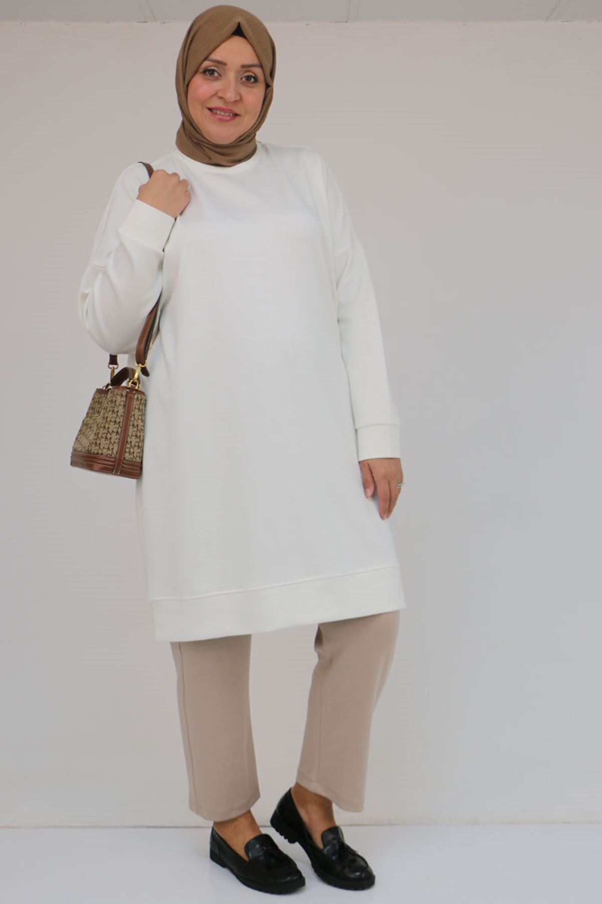 58151 Büyük Beden Kol Ve Etek Ucu Kendinden Ribanalı Modal Tunik - Ekru