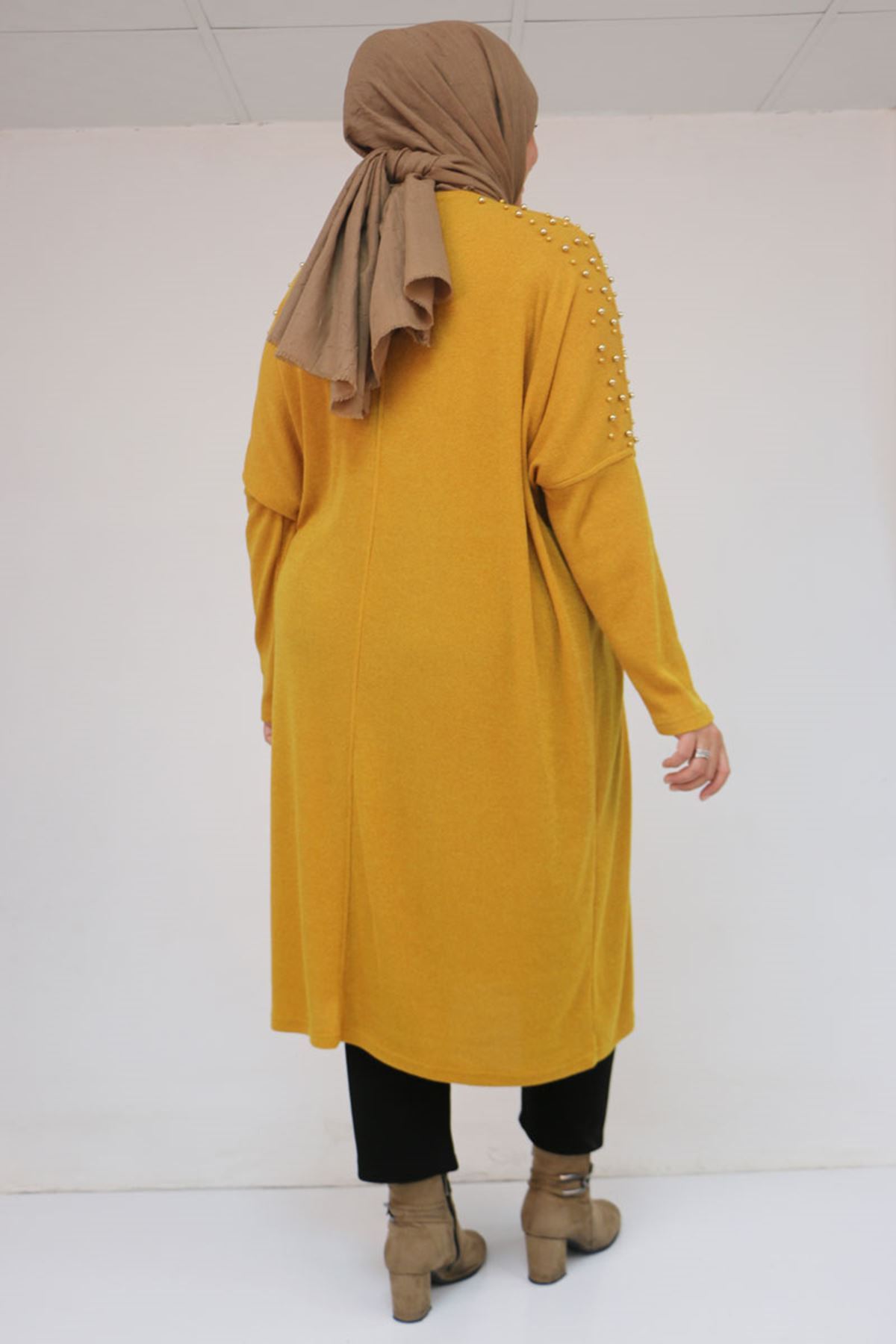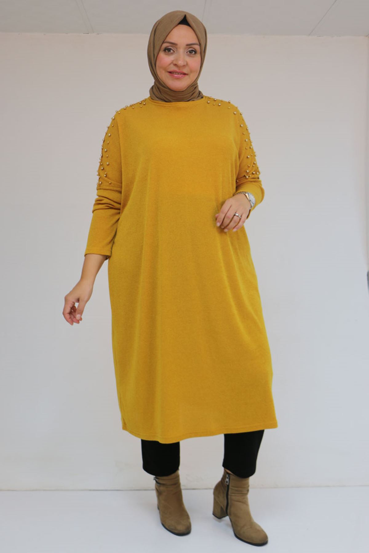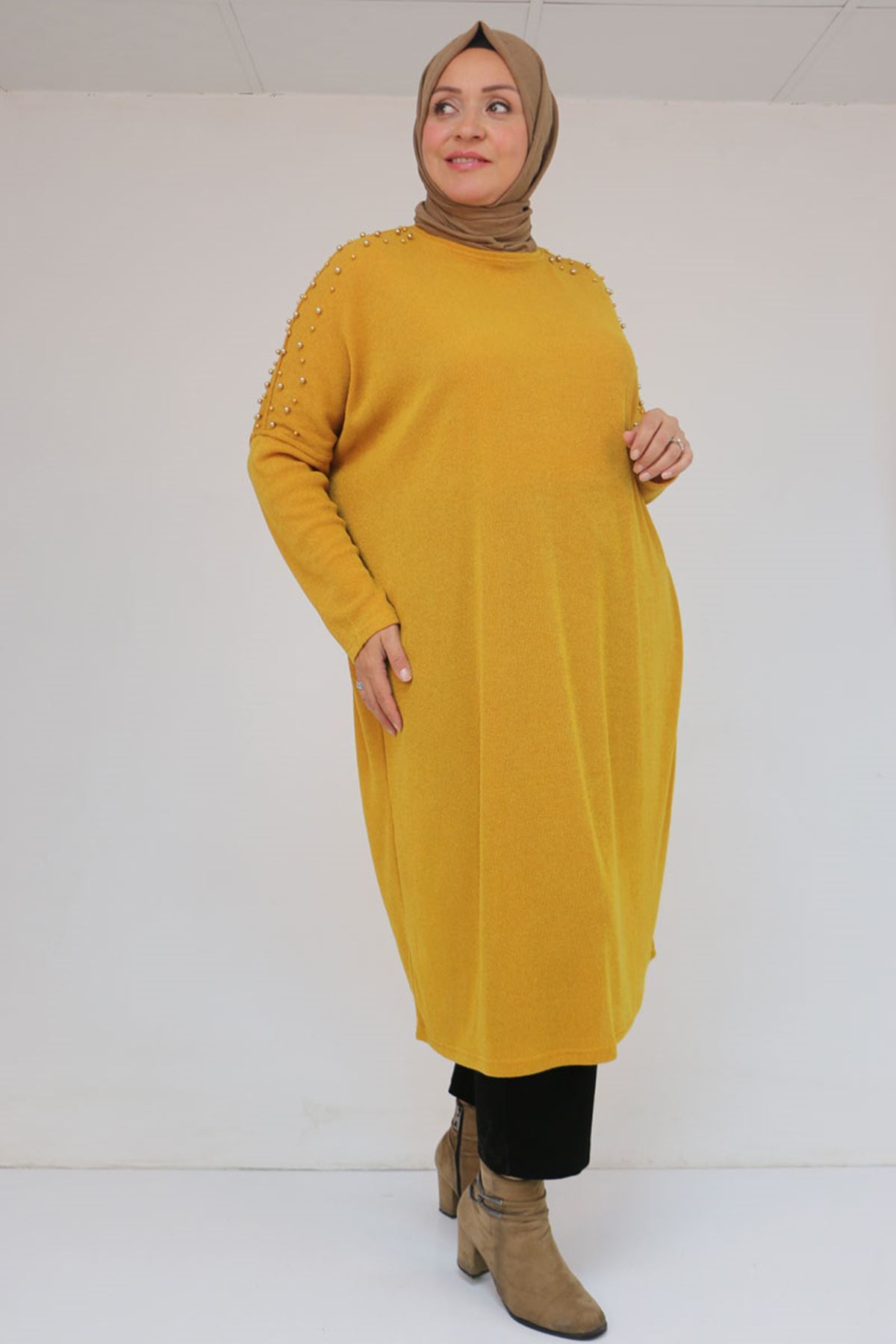 58152 Büyük Beden Düşükkol Omzu Taş Detaylı Mir Tunik - Hardal