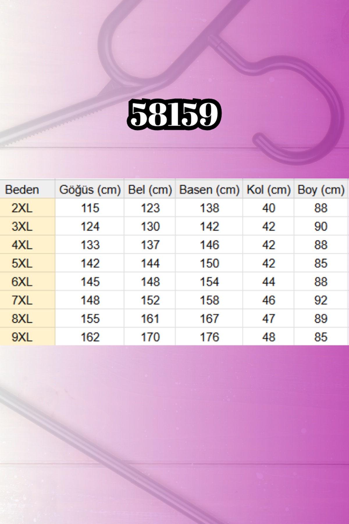 BEL GENİŞLİĞİ :88 cm GÖĞÜS GENİŞLİĞİ :103 cm BASEN :116 cm