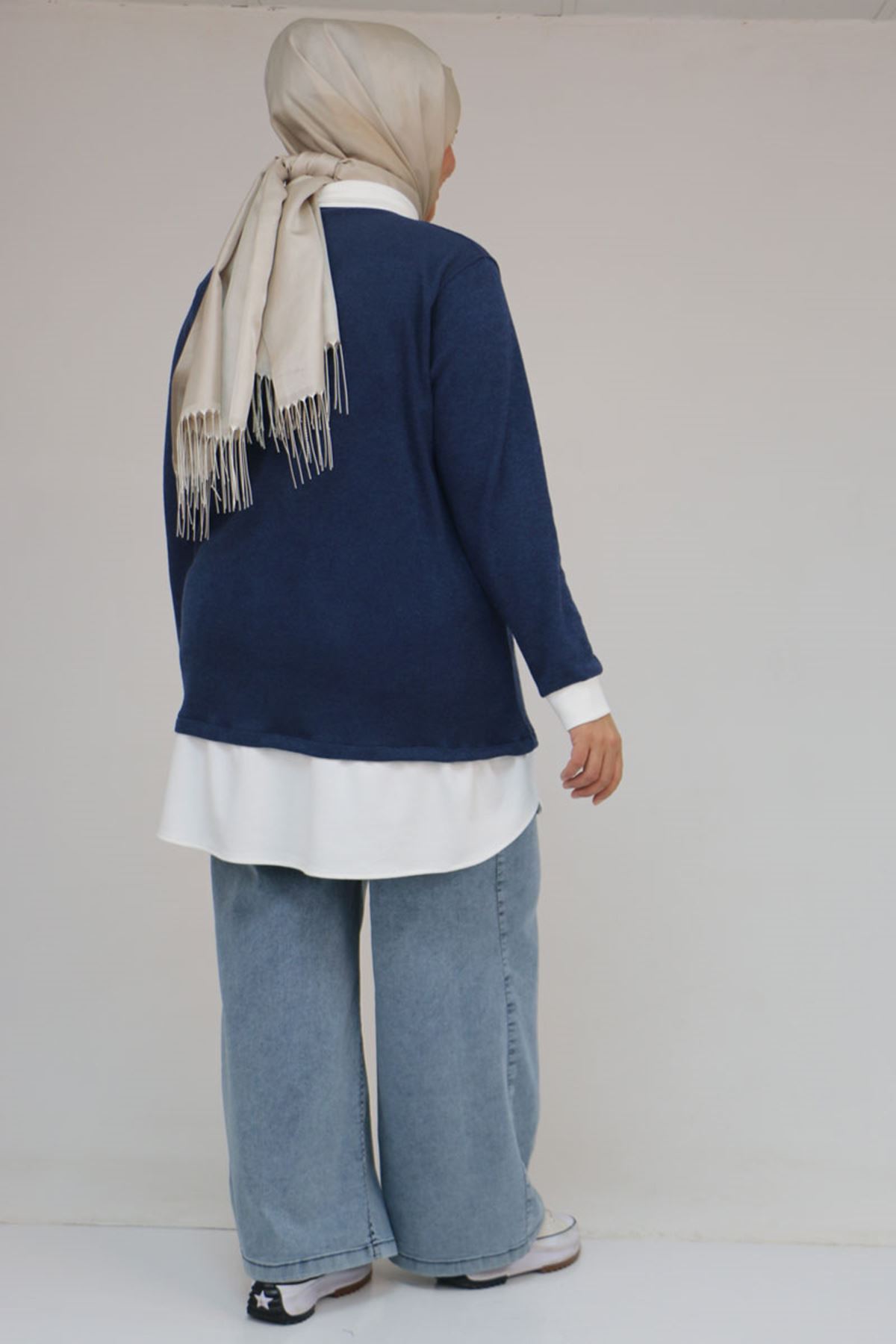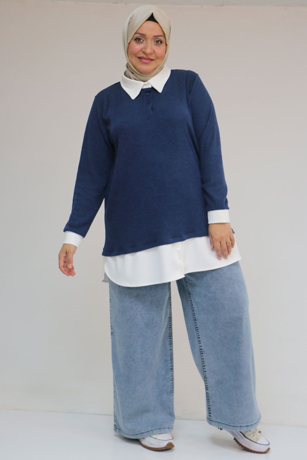 58159 Büyük Beden Gömlek Yaka Görünümlü Garnili Mir Tunik - İndigo
