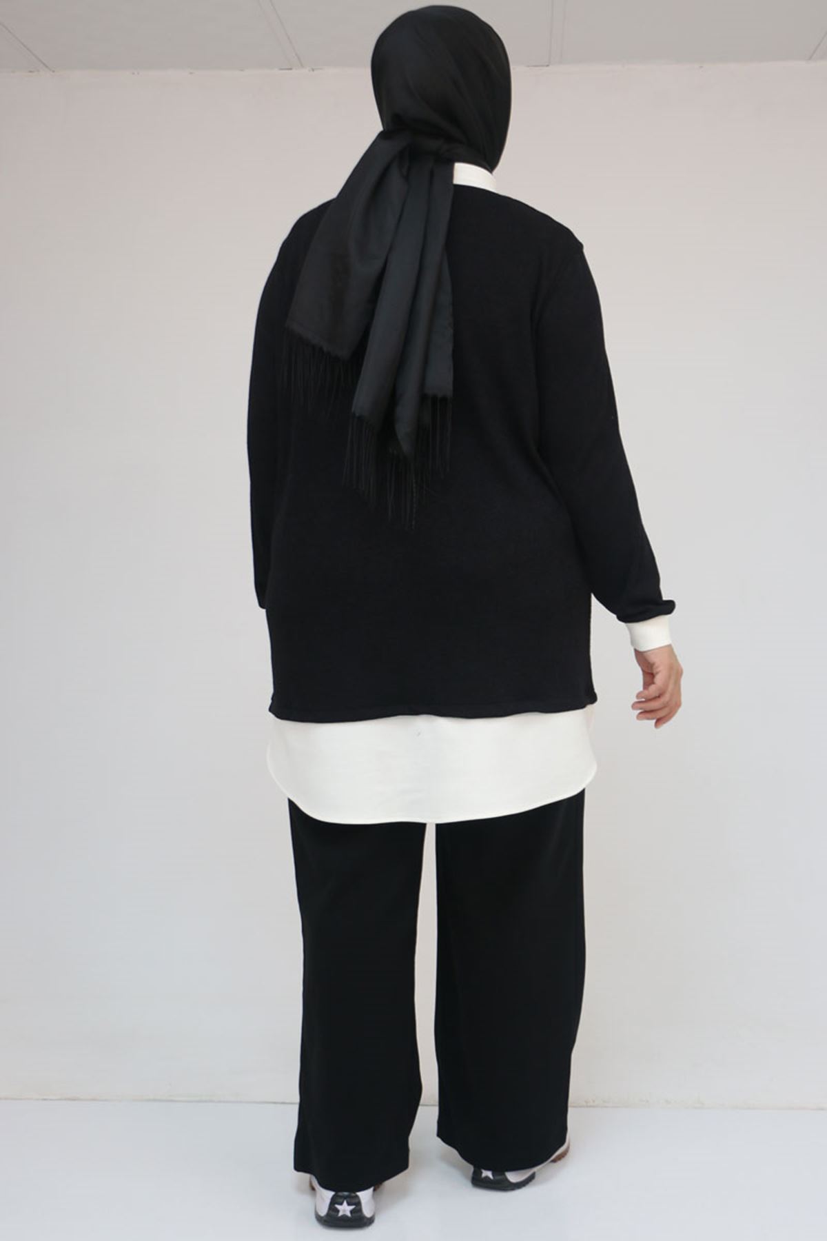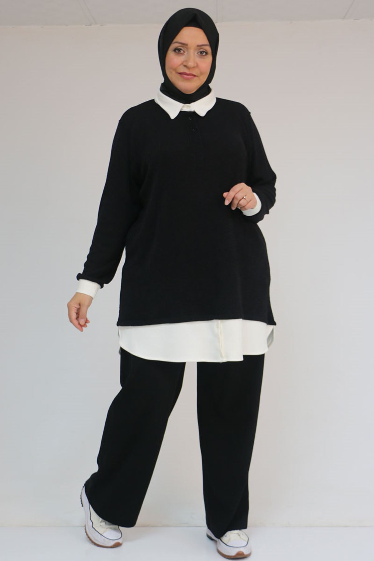 58159 Büyük Beden Gömlek Yaka Görünümlü Garnili Mir Tunik - Siyah