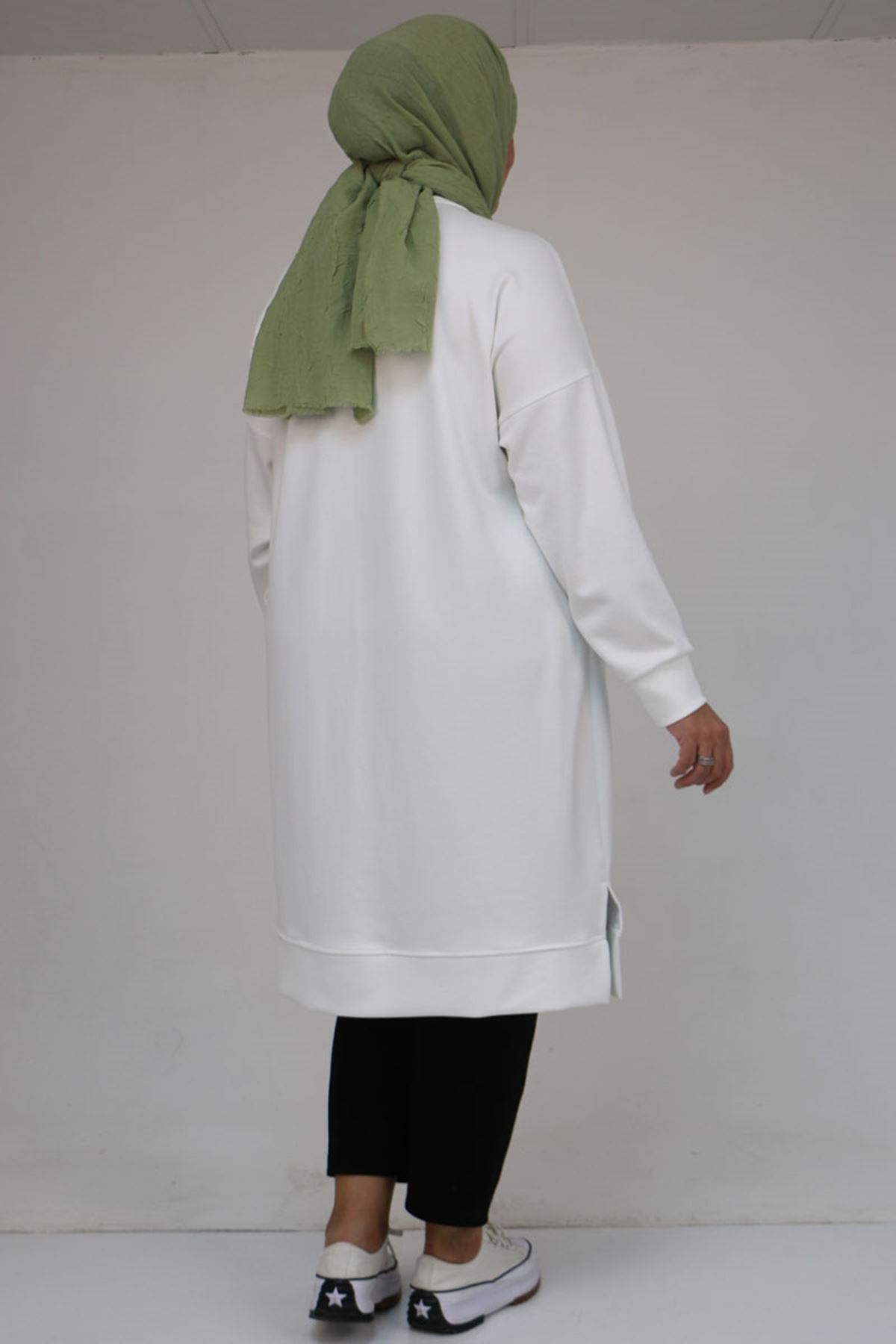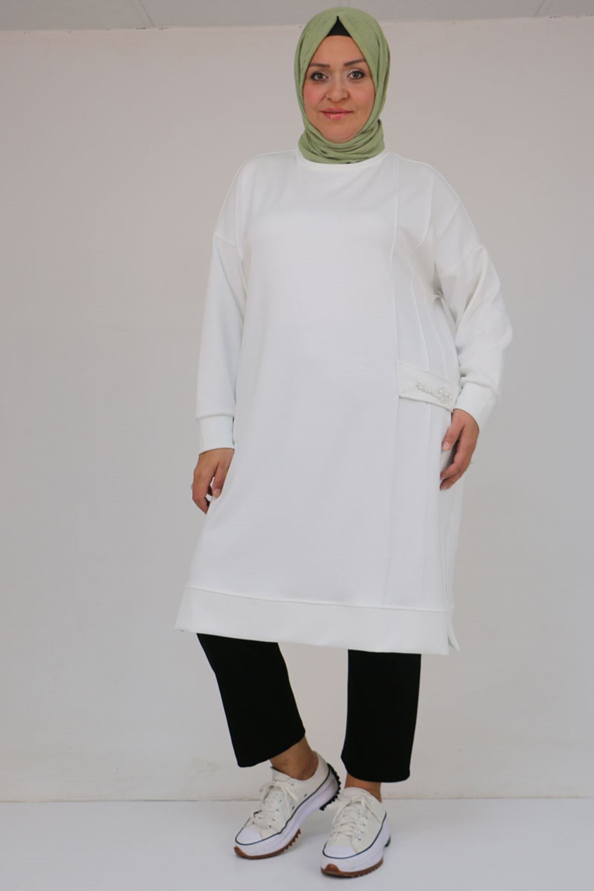 58160 - Büyük Beden İncili Bros Detaylı Modal Tunik- Ekru
