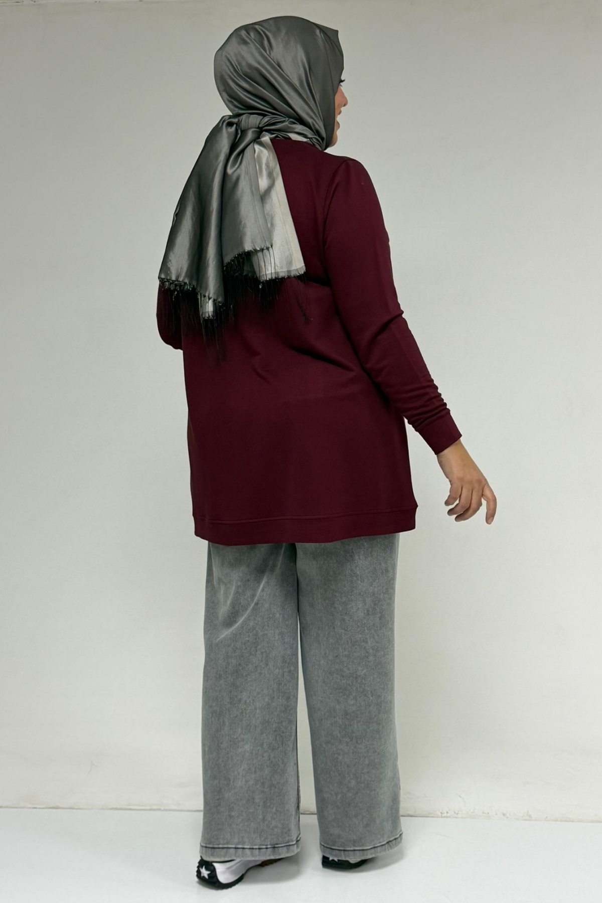 58170 Büyük Beden Eteği Kendi Kumaşından Ribanalı Kristal Tunik - Bordo