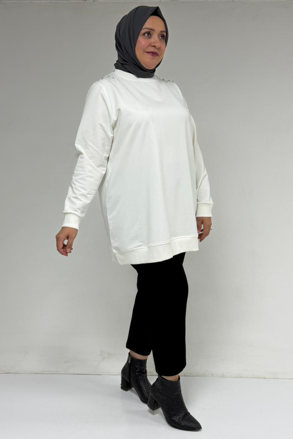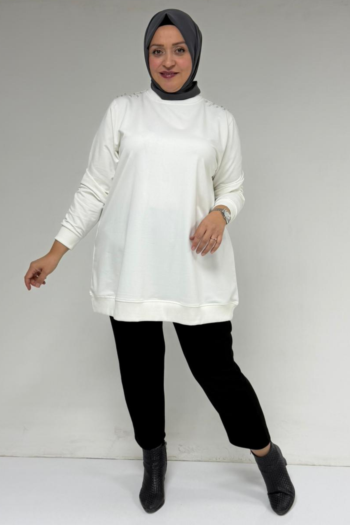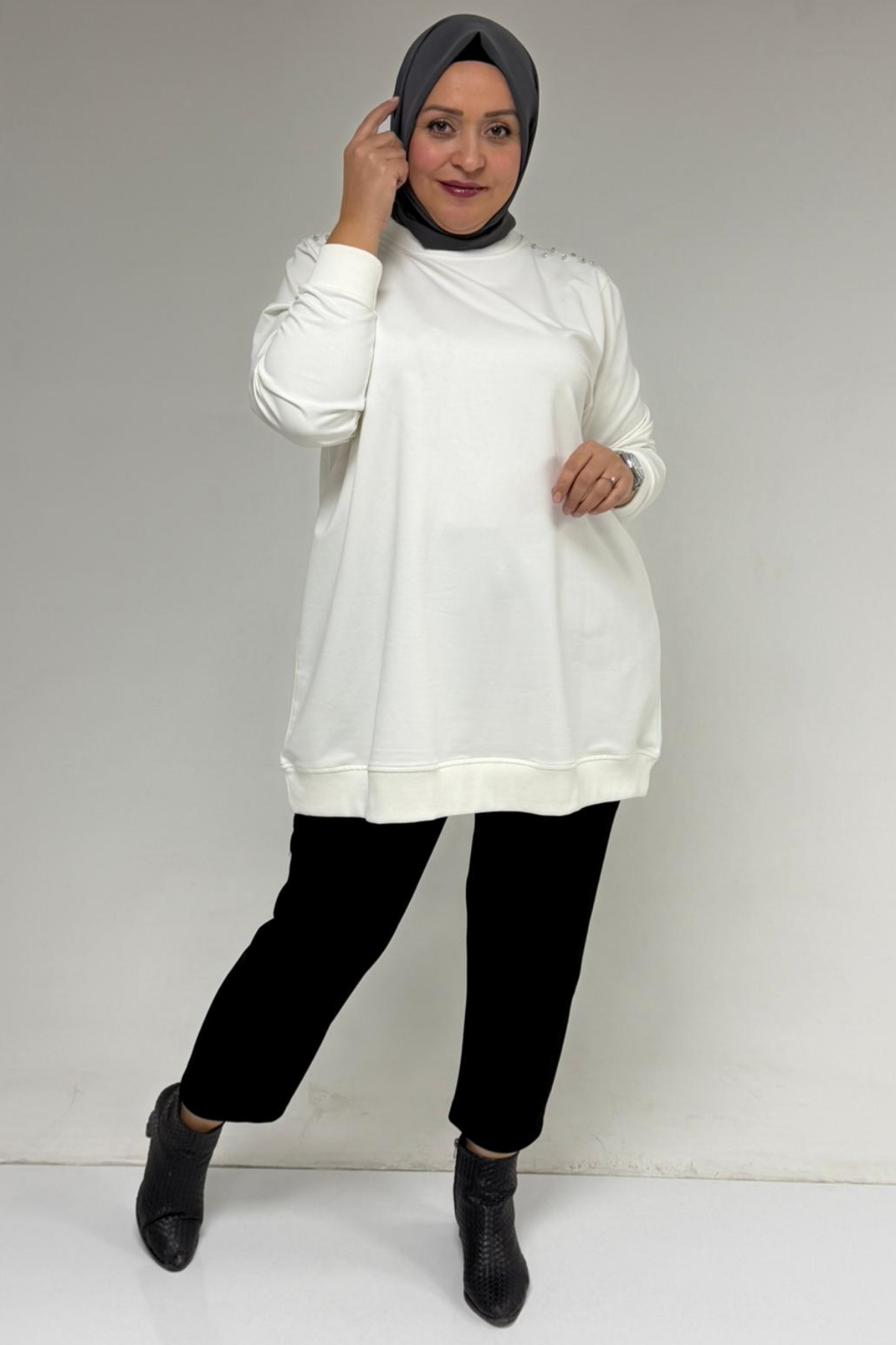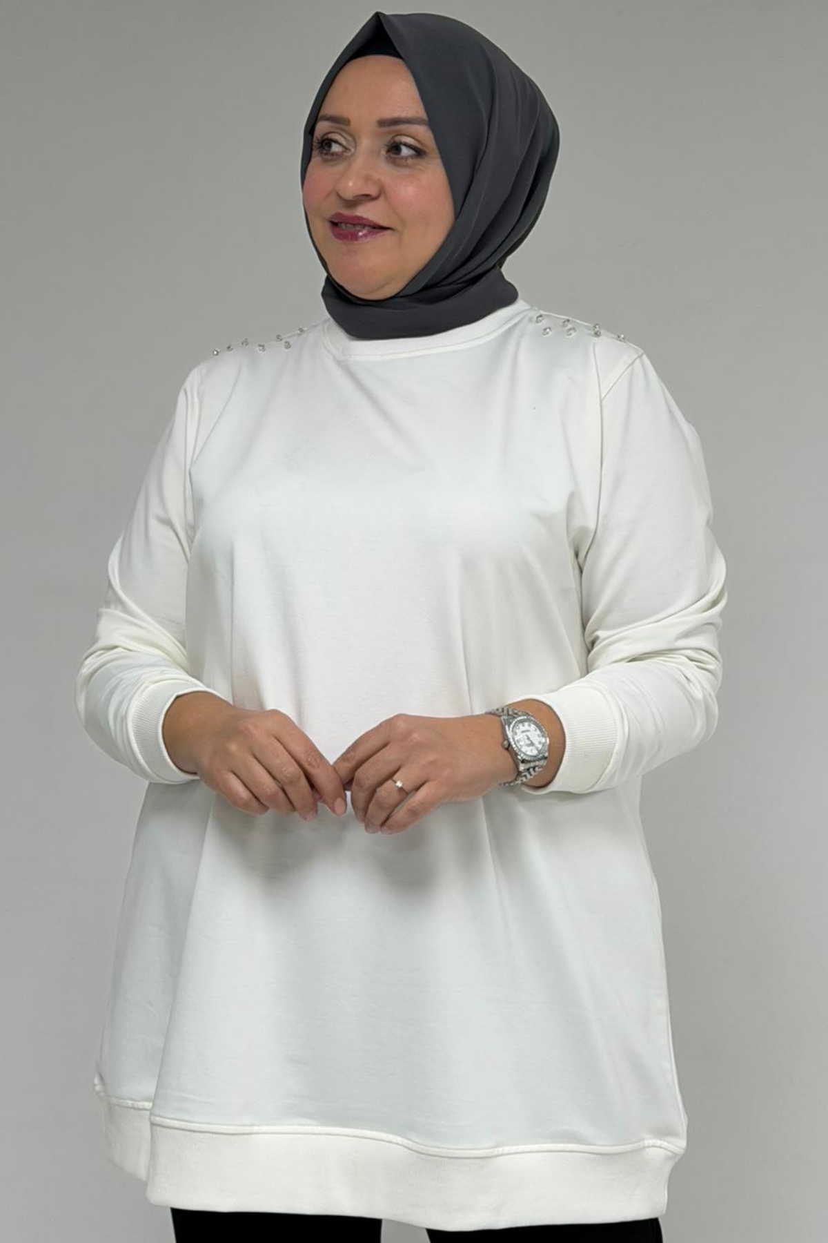 58171 Büyük Beden Omuzunda Taş Detaylı Kristal Tunik - Ekru