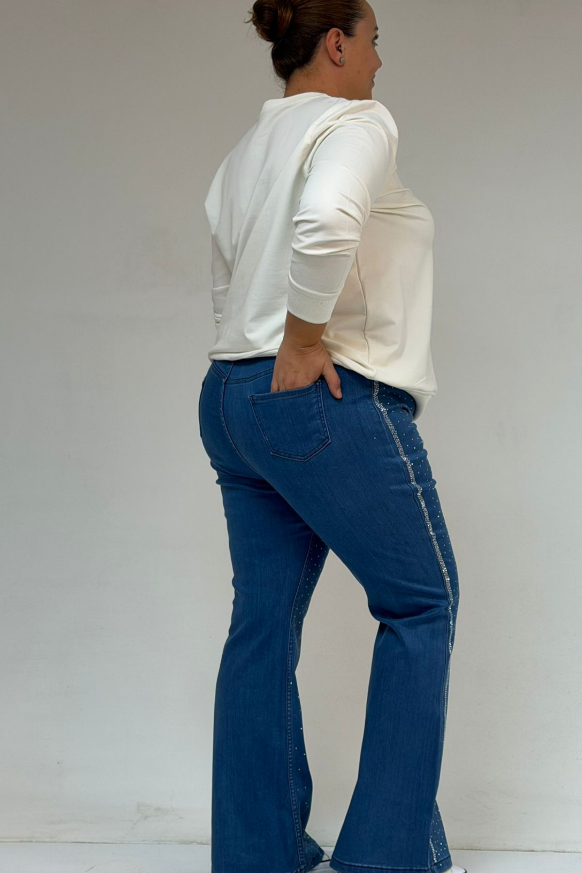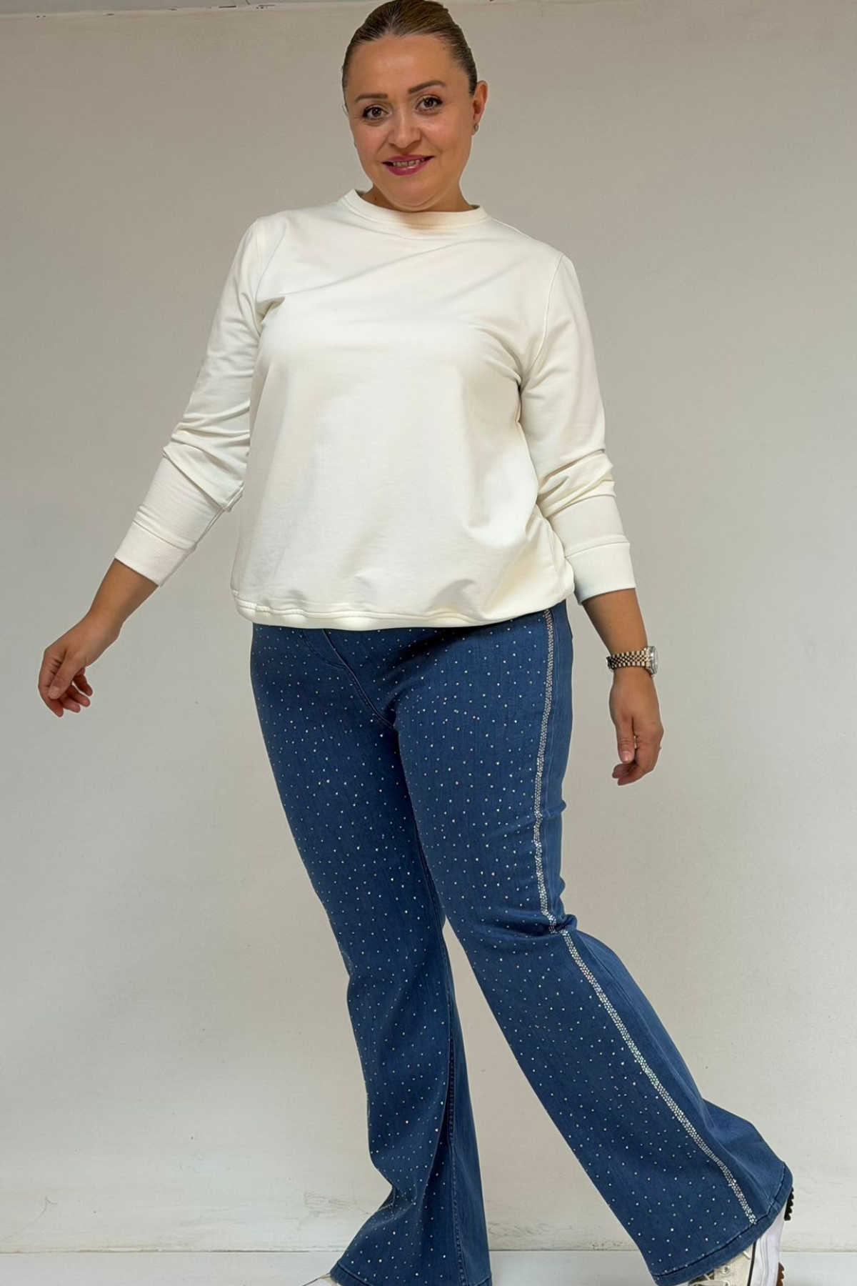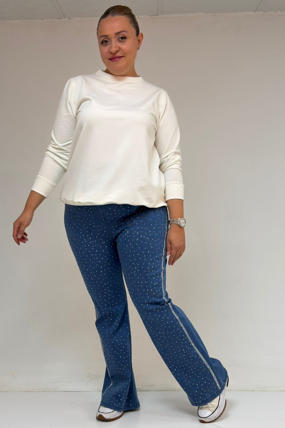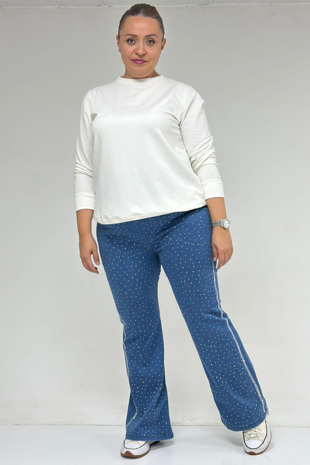 59038 Büyük Beden İspanyol Paça Taş Baskı Detaylı Kot Pantolon - Mavi
